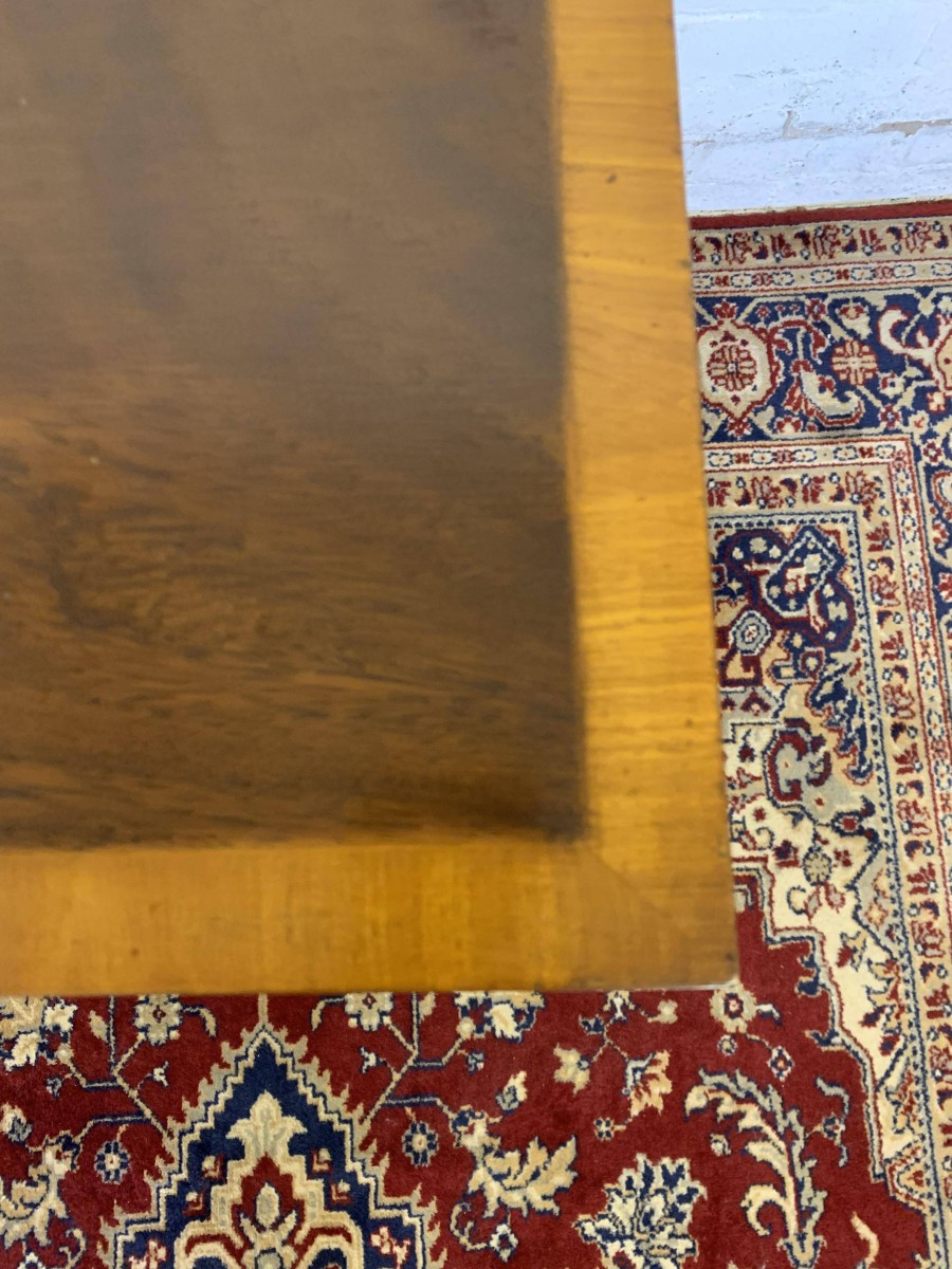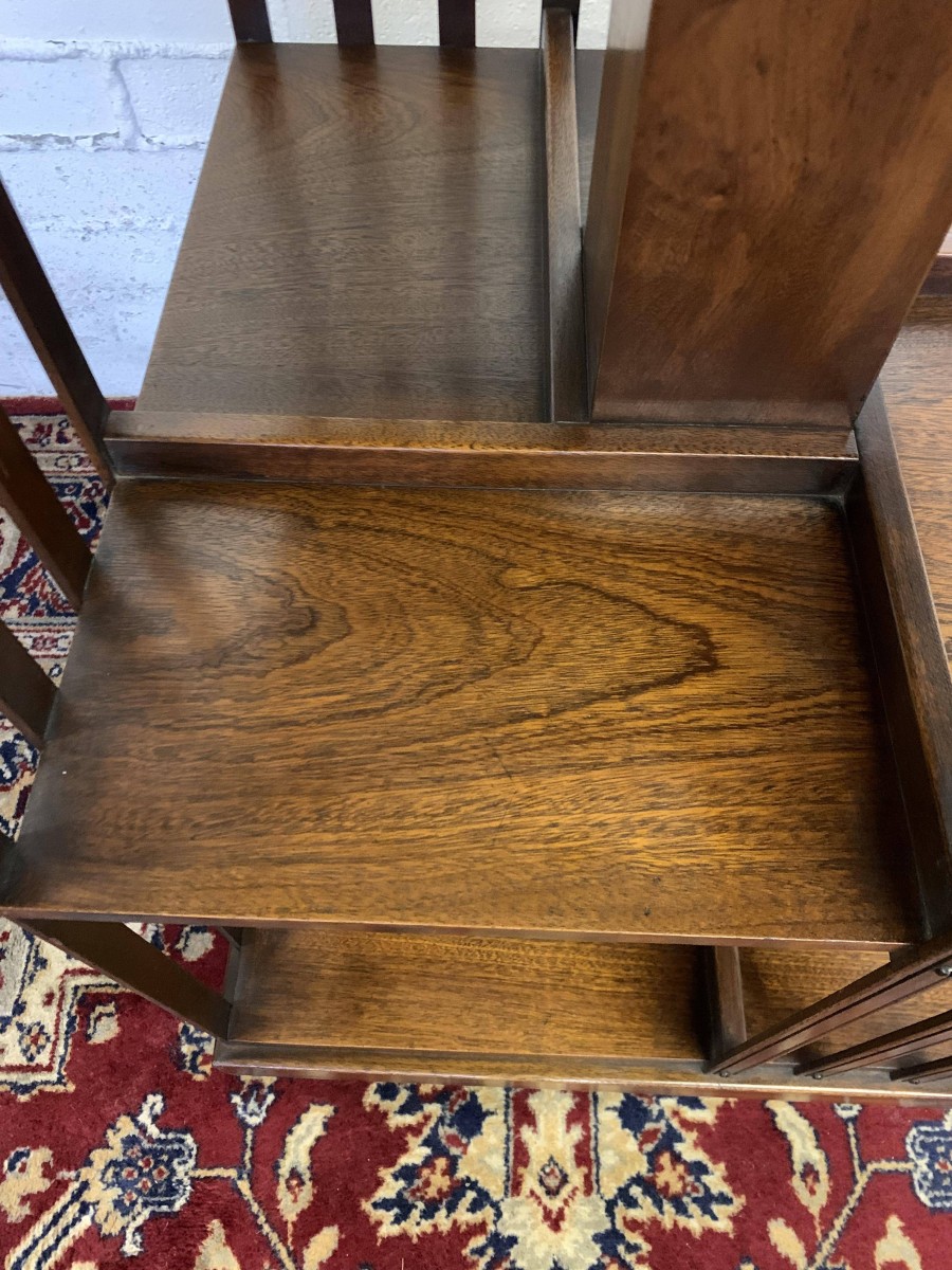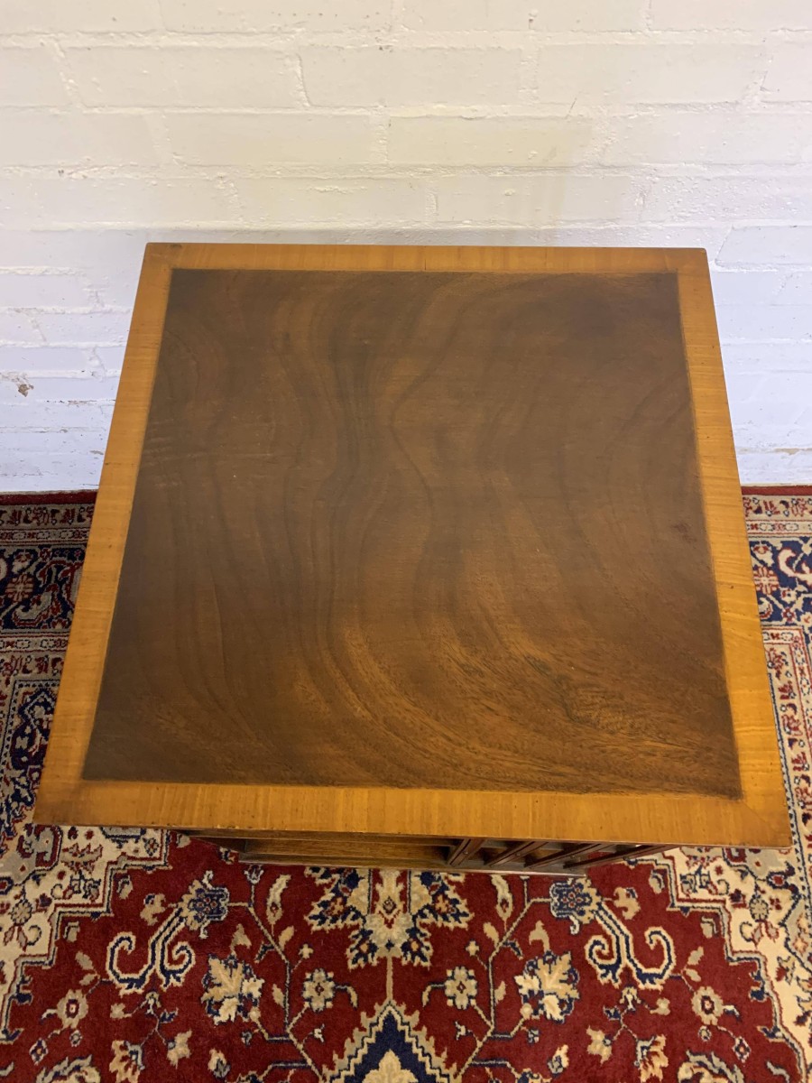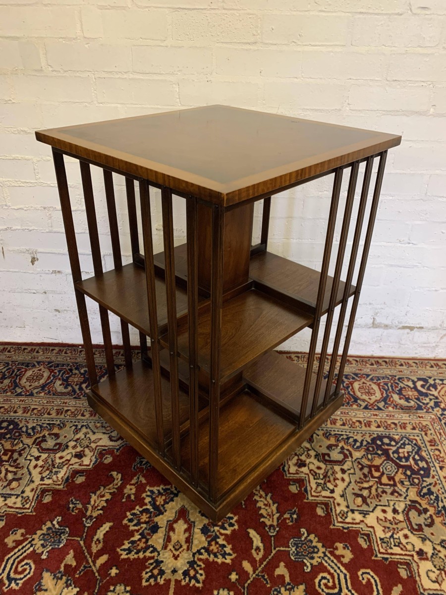 The crossbanded edged top sits above eight individual sections which house books. Sitting on four casters the bookcase revolves smoothly.