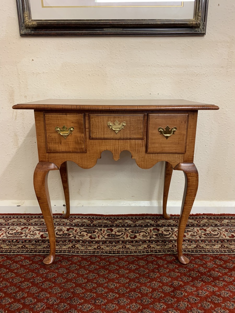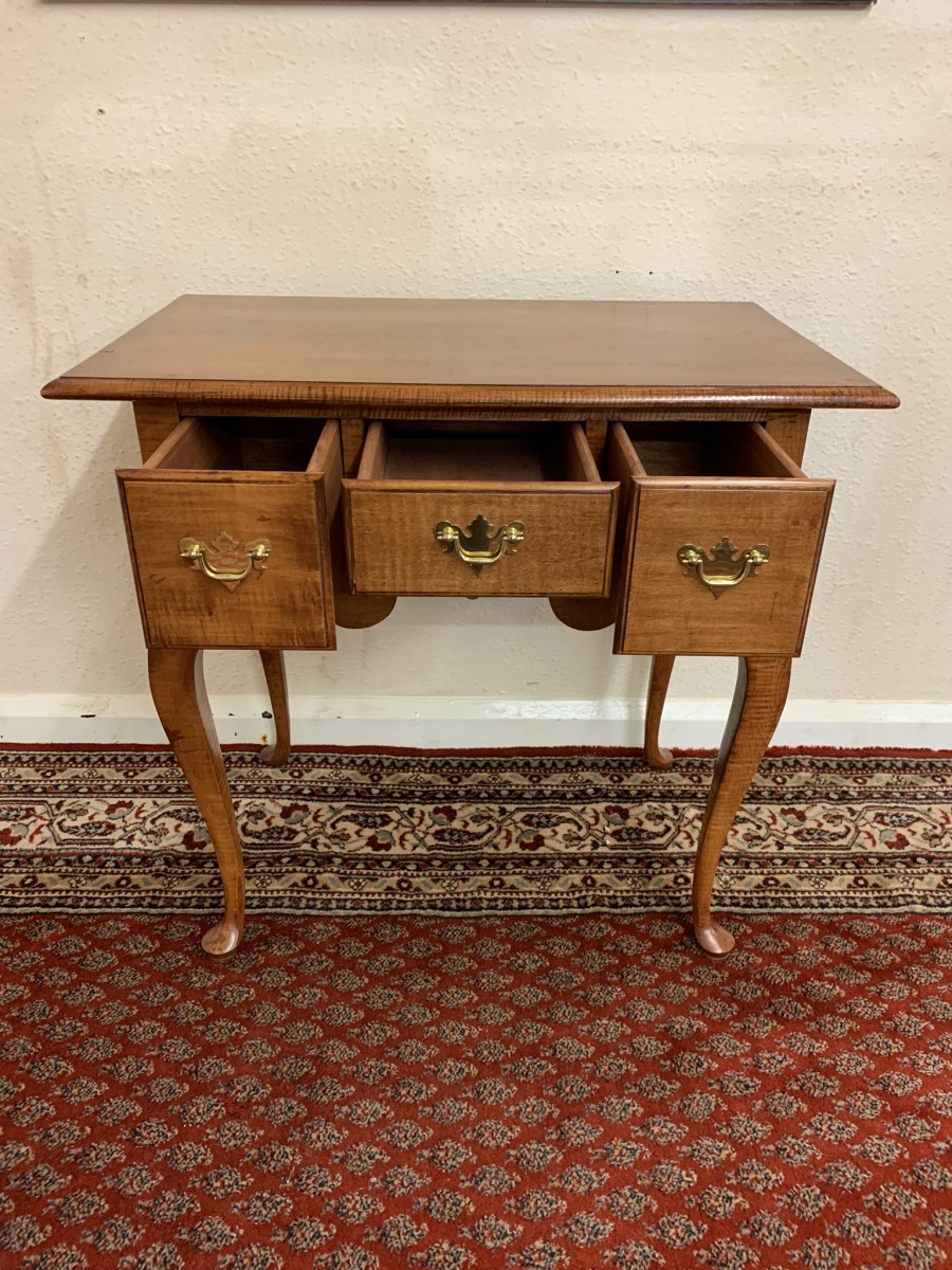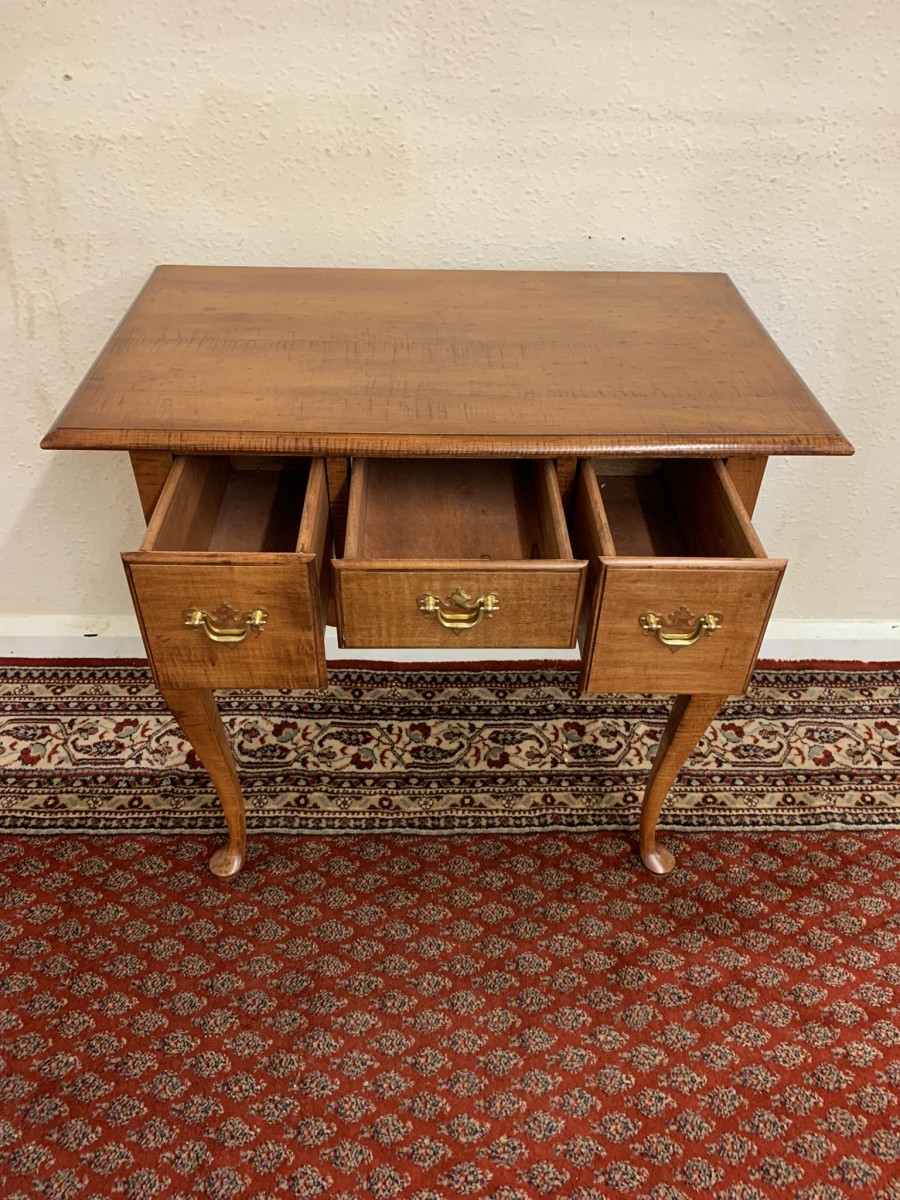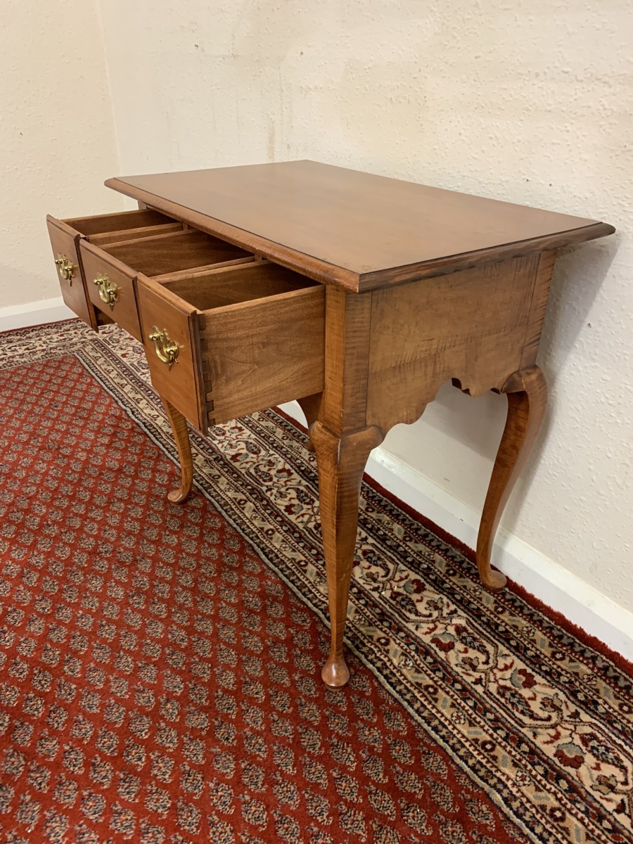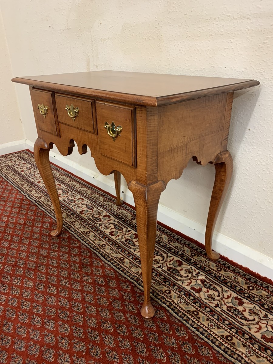 In excellent condition this lowboy has an oversailing top which sits above a central drawer which is flanked by a pair of drawers, each drawer having a brass handle. Shaped wavy apron the lowboy stands on four elegant cabriole shaped legs.