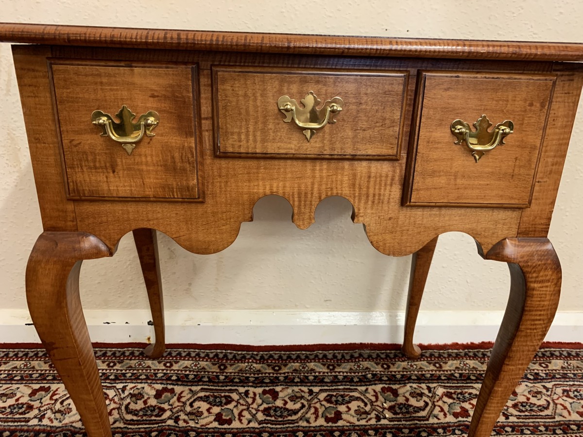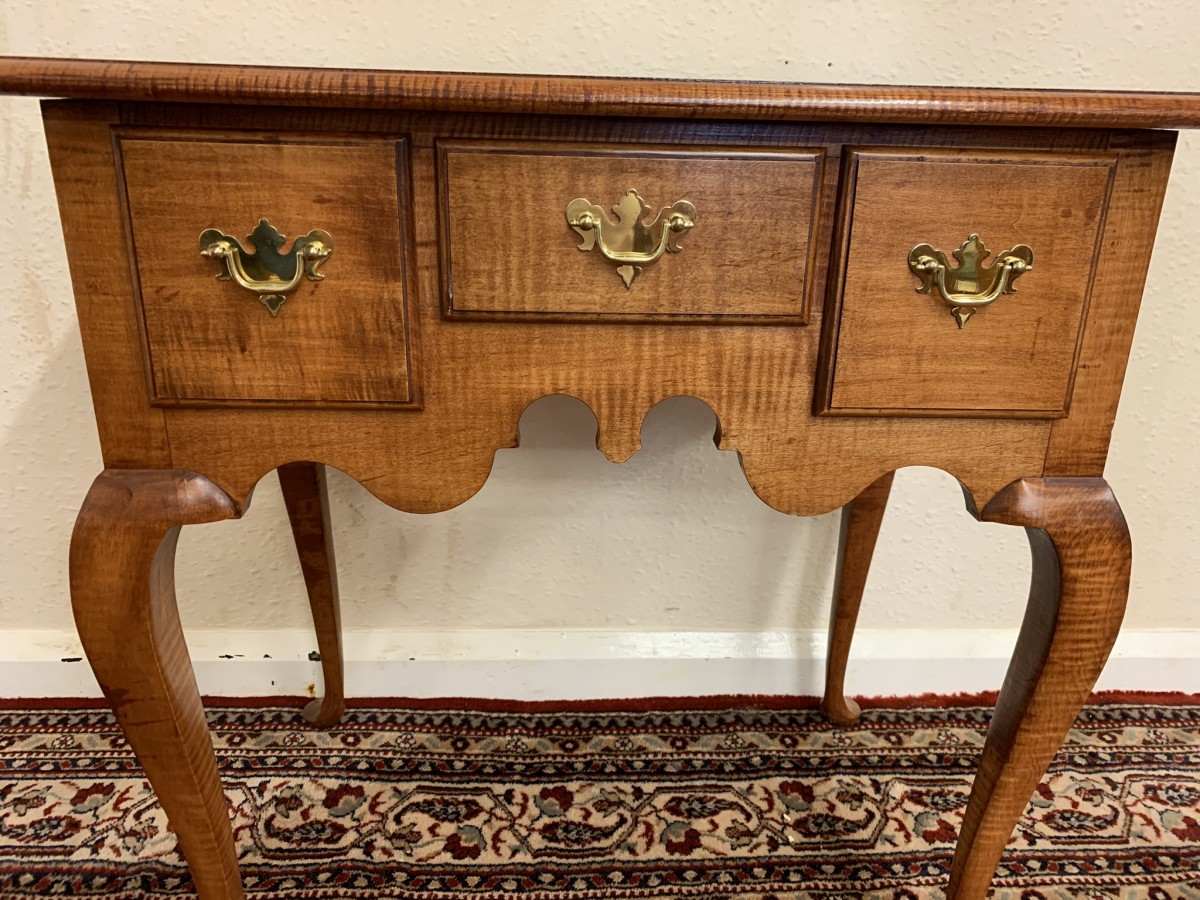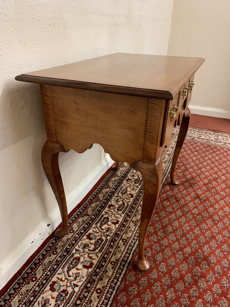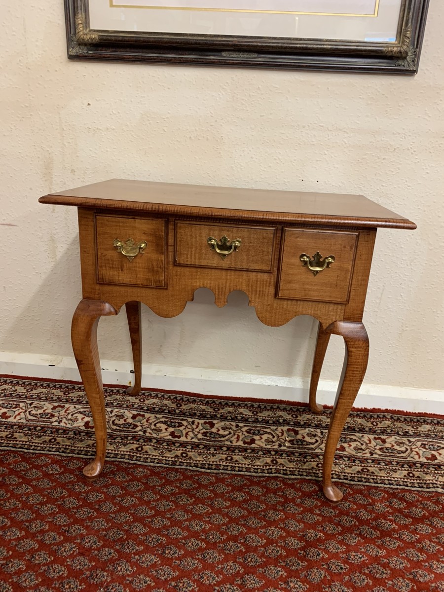 In excellent condition this lowboy has an oversailing top which sits above a central drawer which is flanked by a pair of drawers, each drawer having a brass handle. Shaped wavy apron the lowboy stands on four elegant cabriole shaped legs.