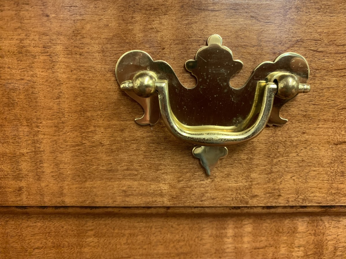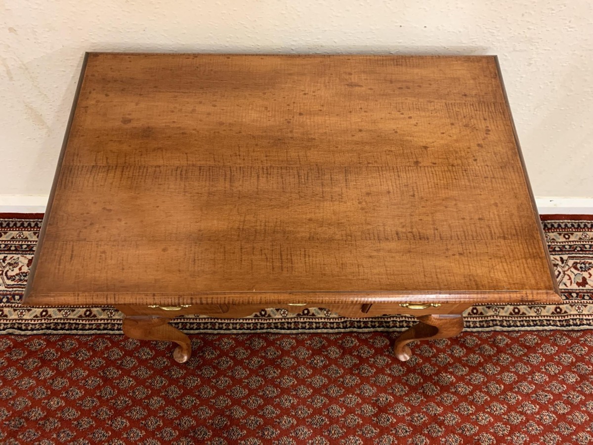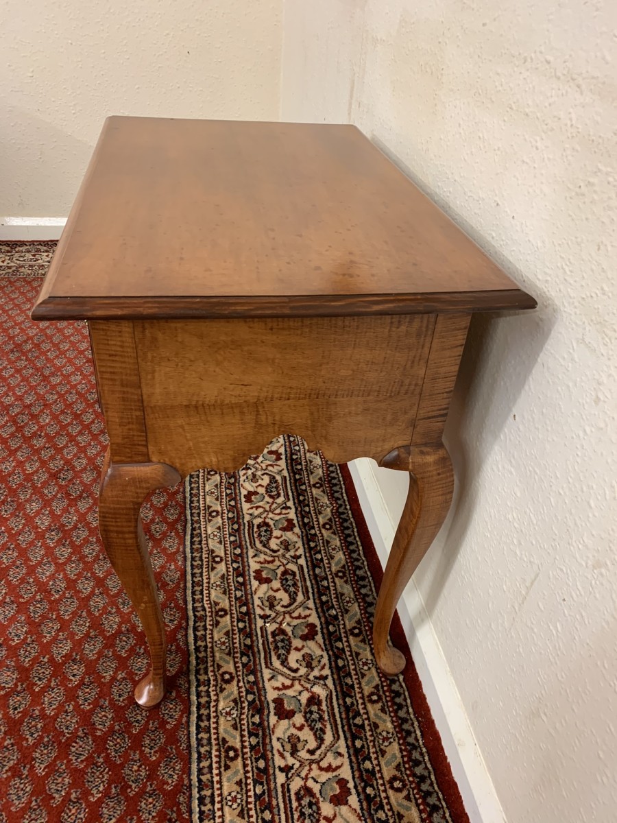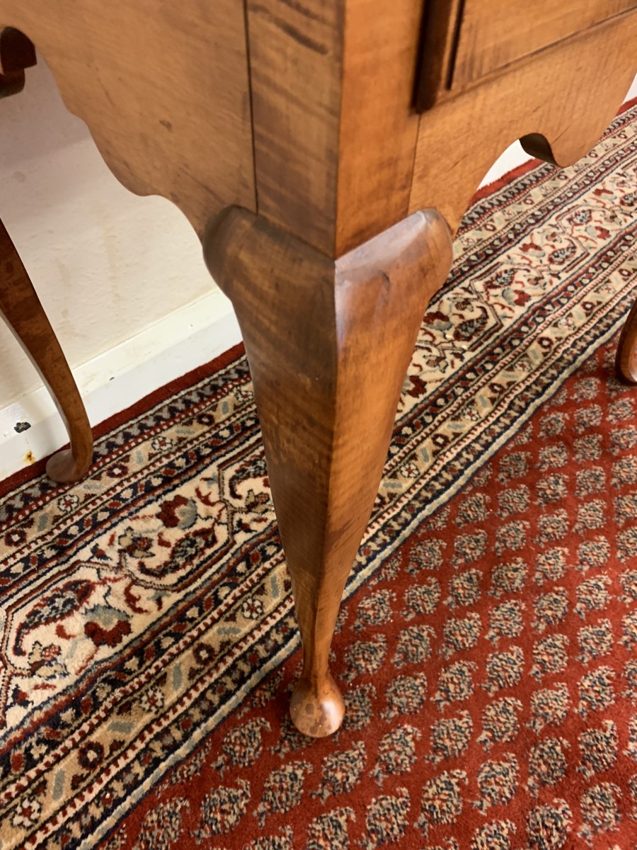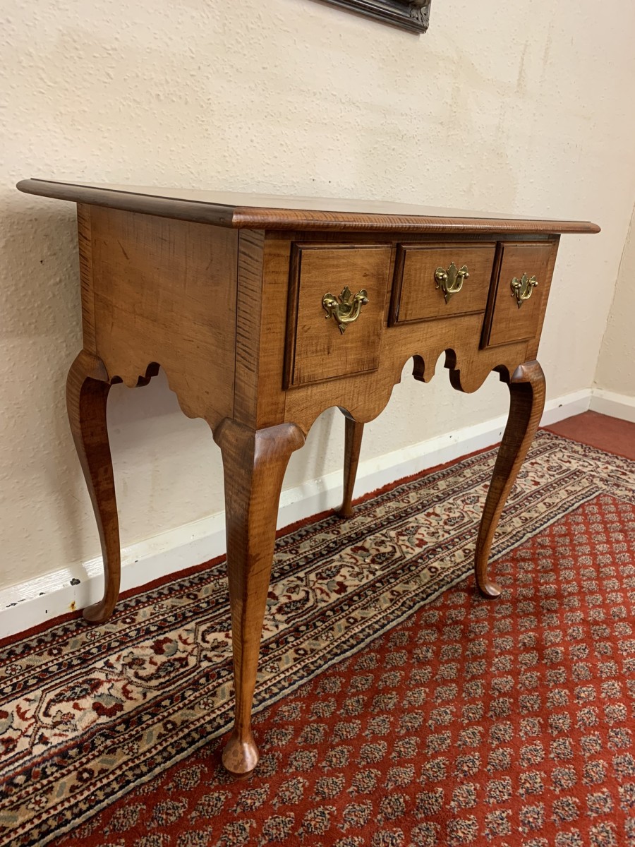 In excellent condition this lowboy has an oversailing top which sits above a central drawer which is flanked by a pair of drawers, each drawer having a brass handle. Shaped wavy apron the lowboy stands on four elegant cabriole shaped legs.