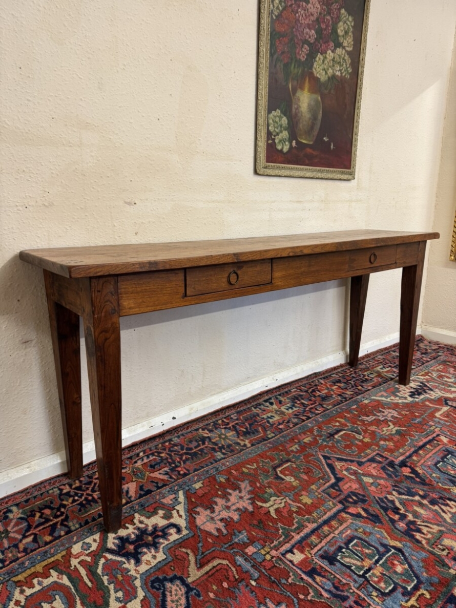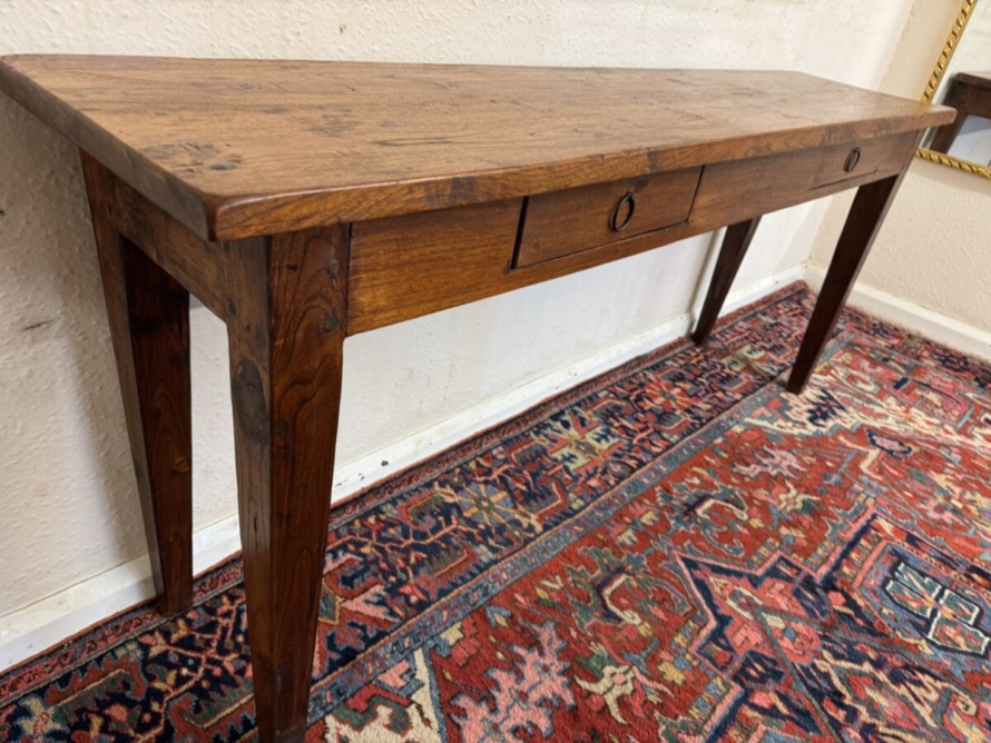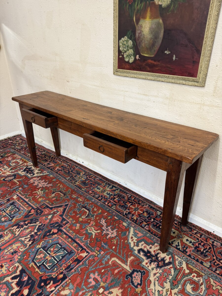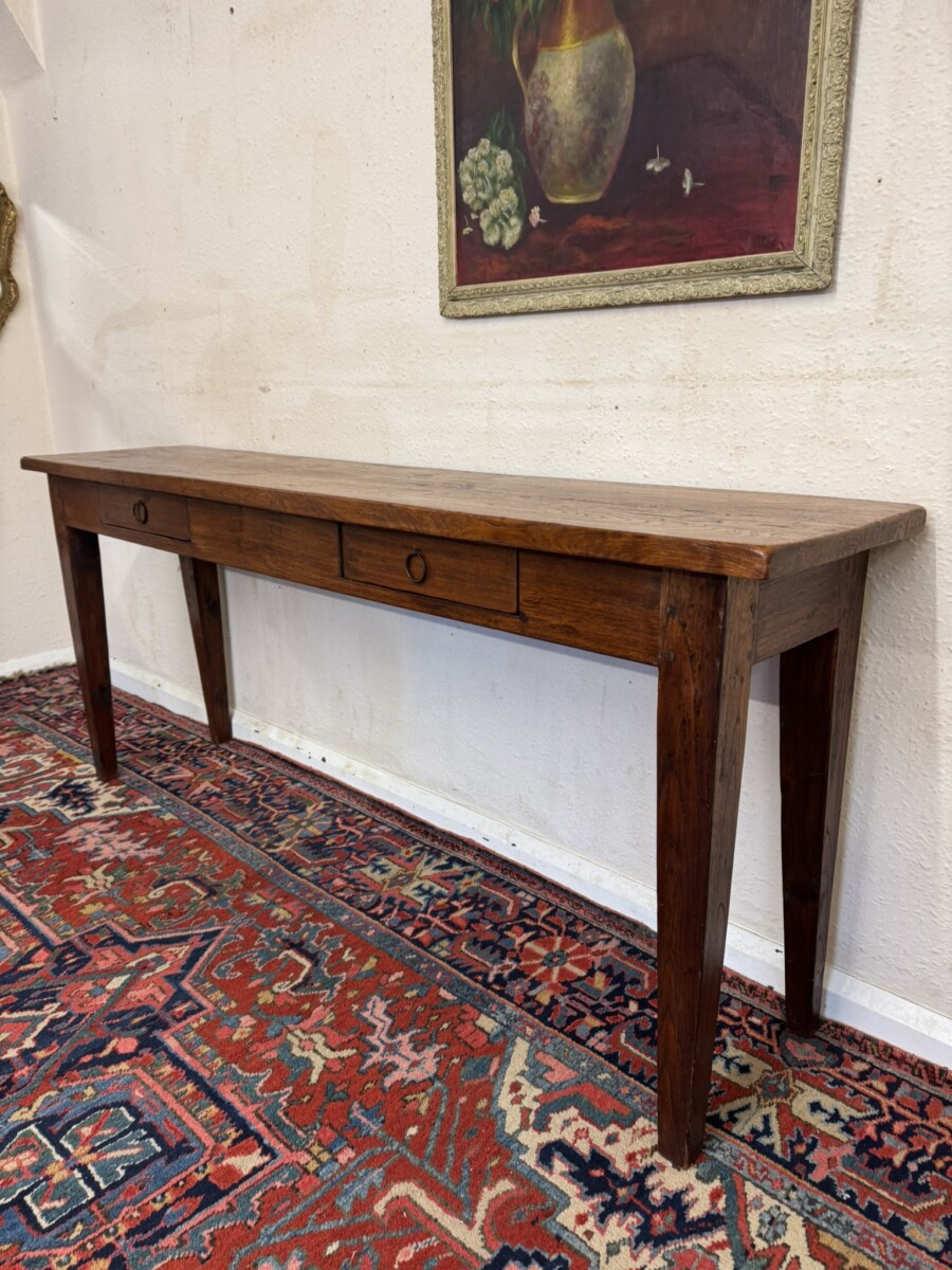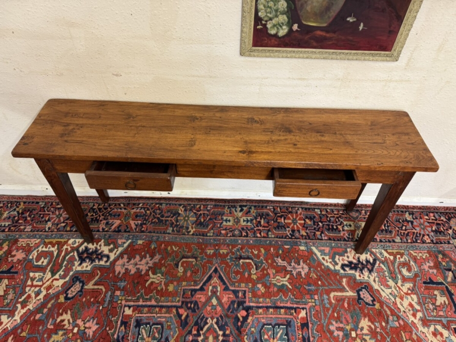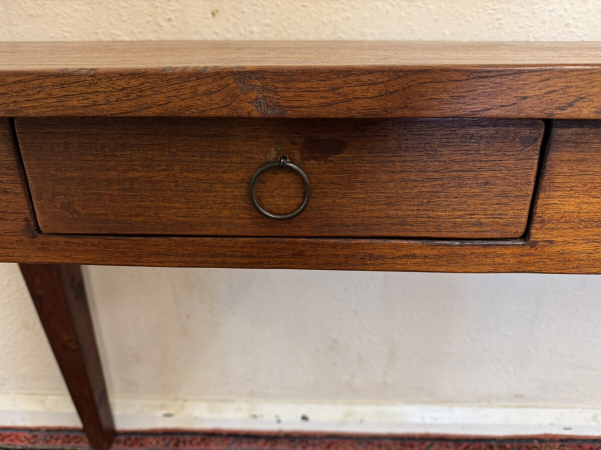 The over sailing top has a glorious patina, with two drawers below, each with metal ring handle. This simple in design stylish console stands on four tapered legs.