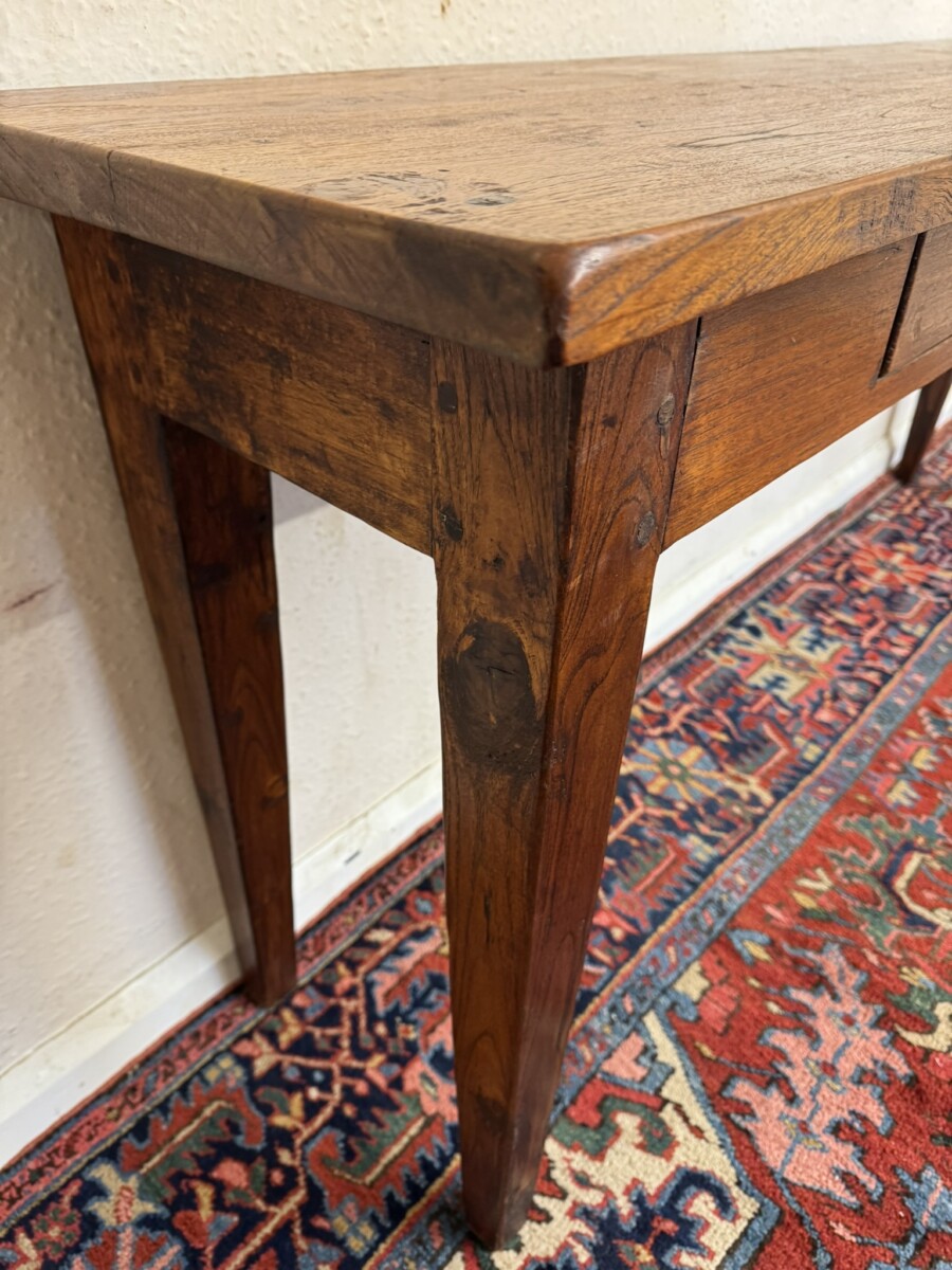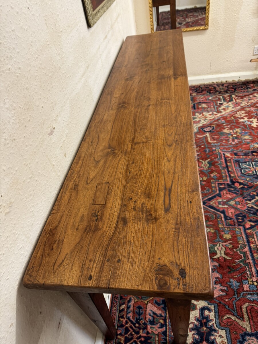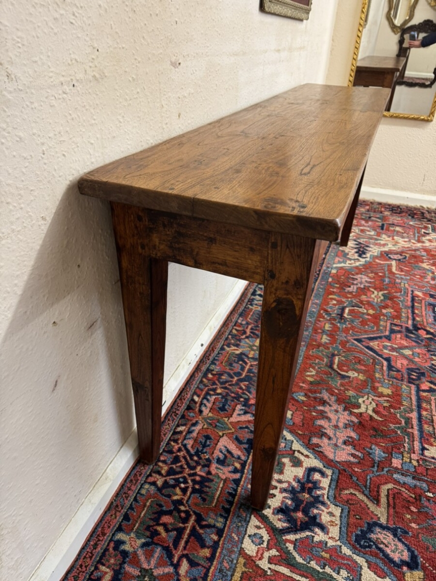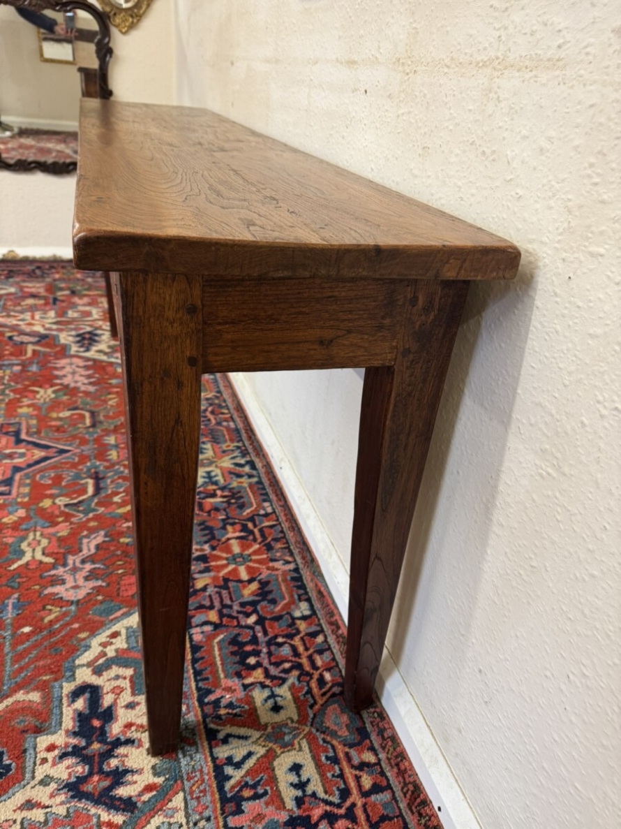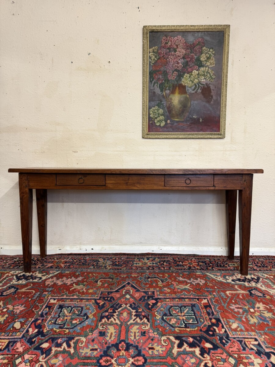 The over sailing top has a glorious patina, with two drawers below, each with metal ring handle. This simple in design stylish console stands on four tapered legs.