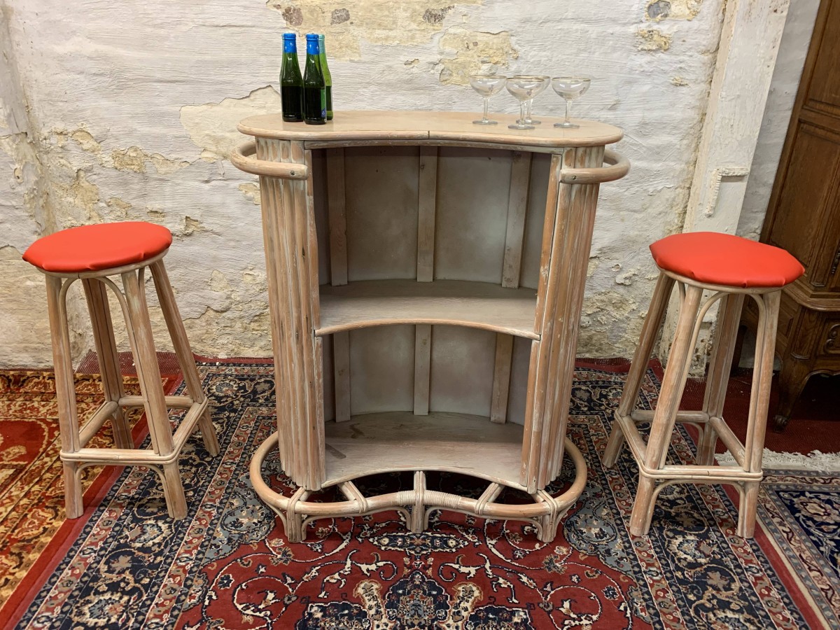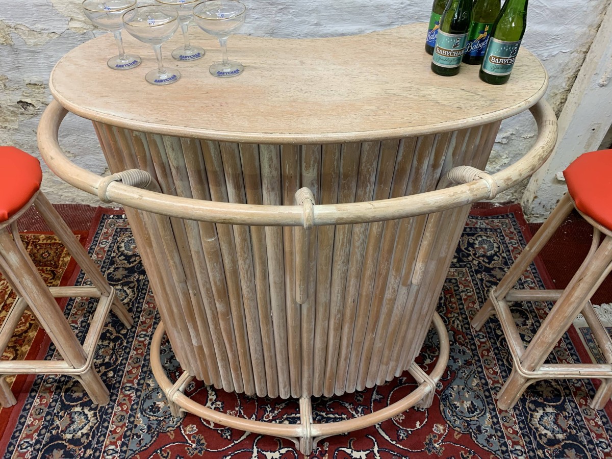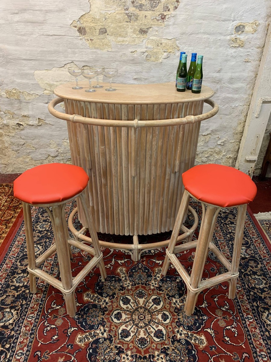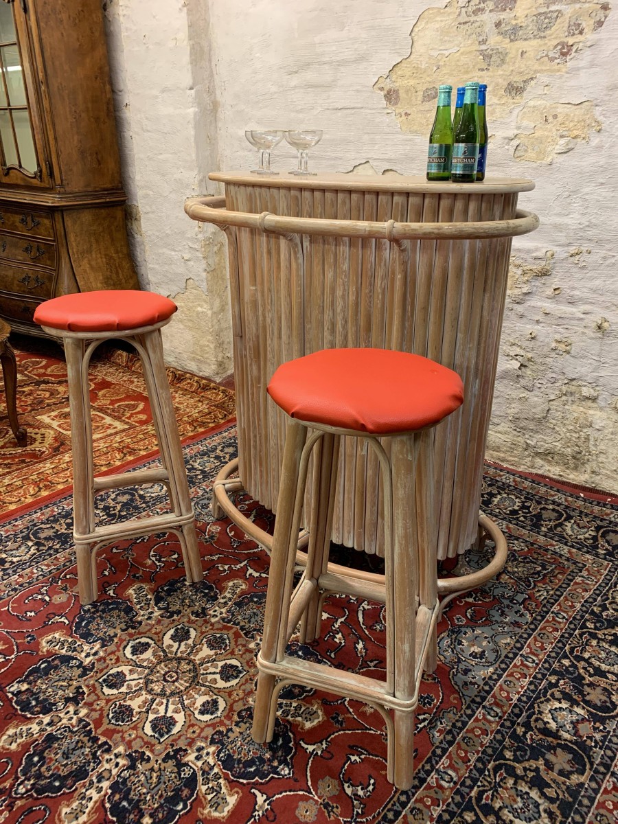 - Fabulous Mid Century Shaped Faux Bamboo Bar With Two Stools