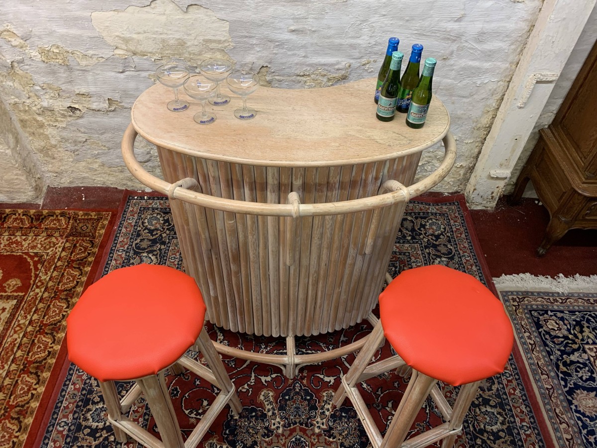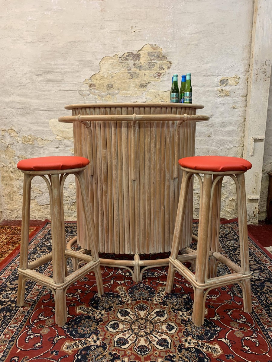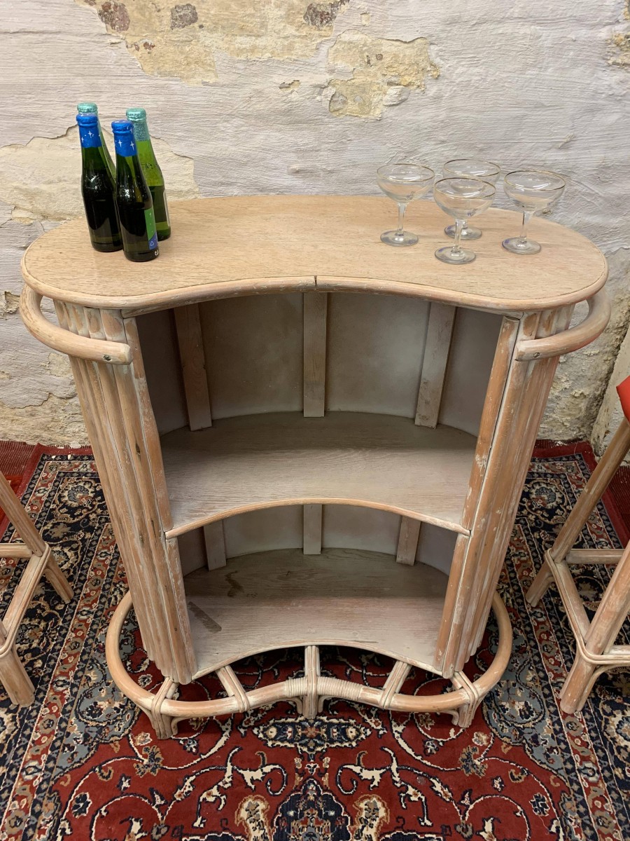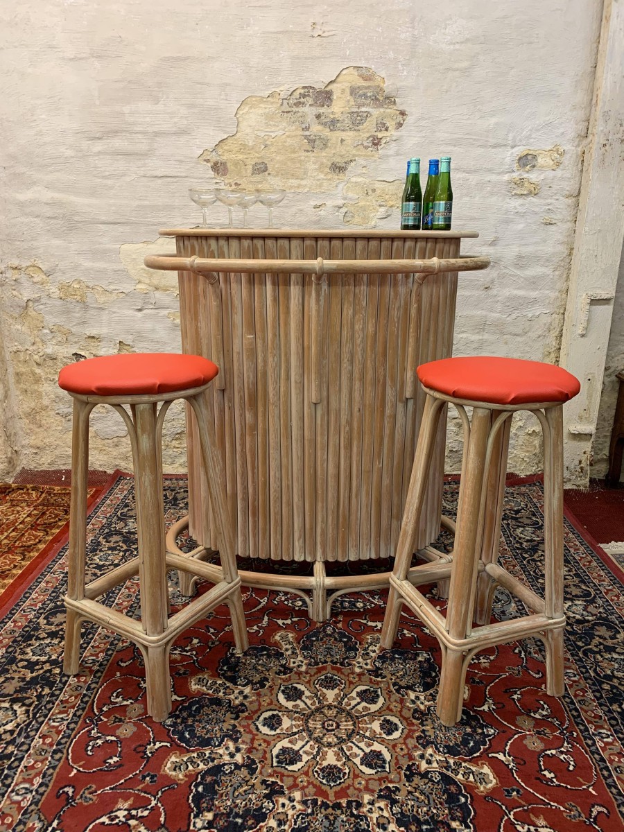 - Fabulous Mid Century Shaped Faux Bamboo Bar With Two Stools