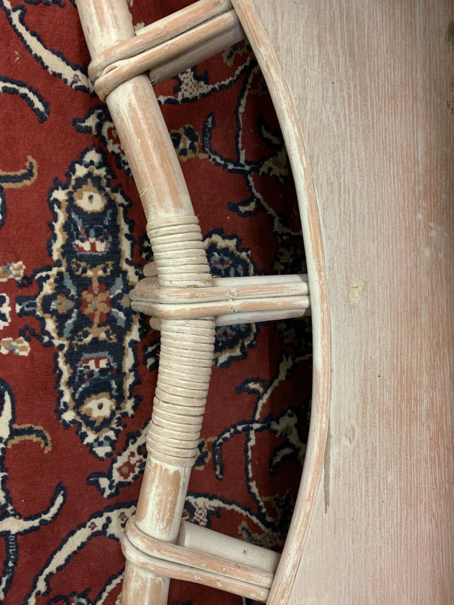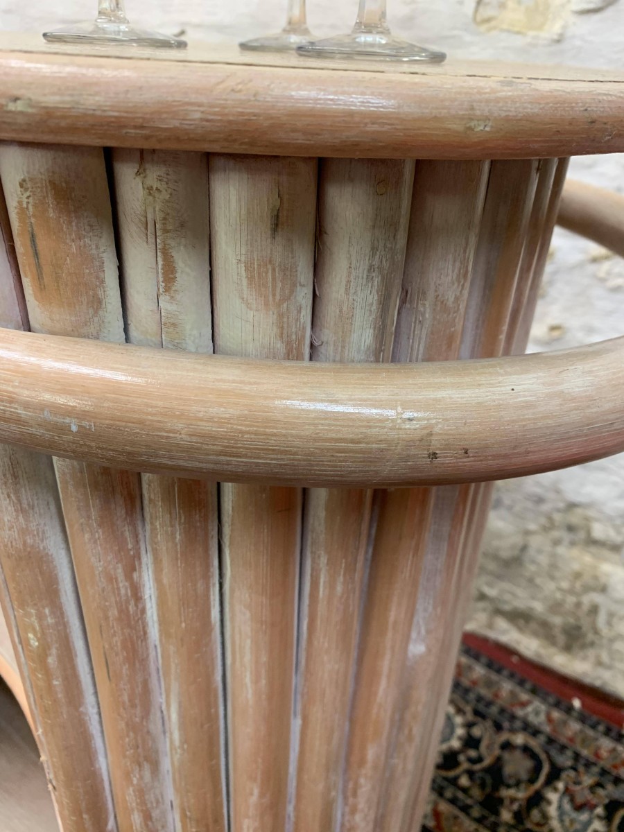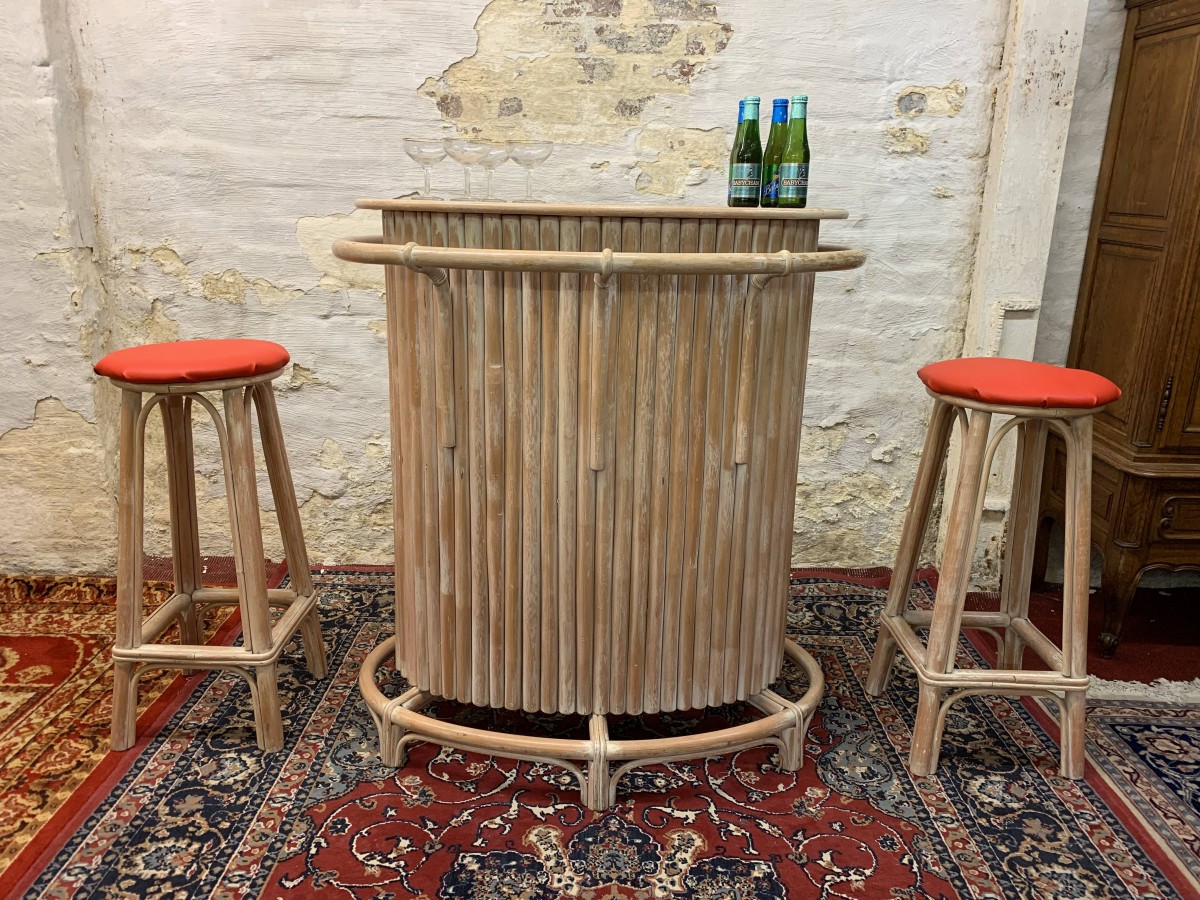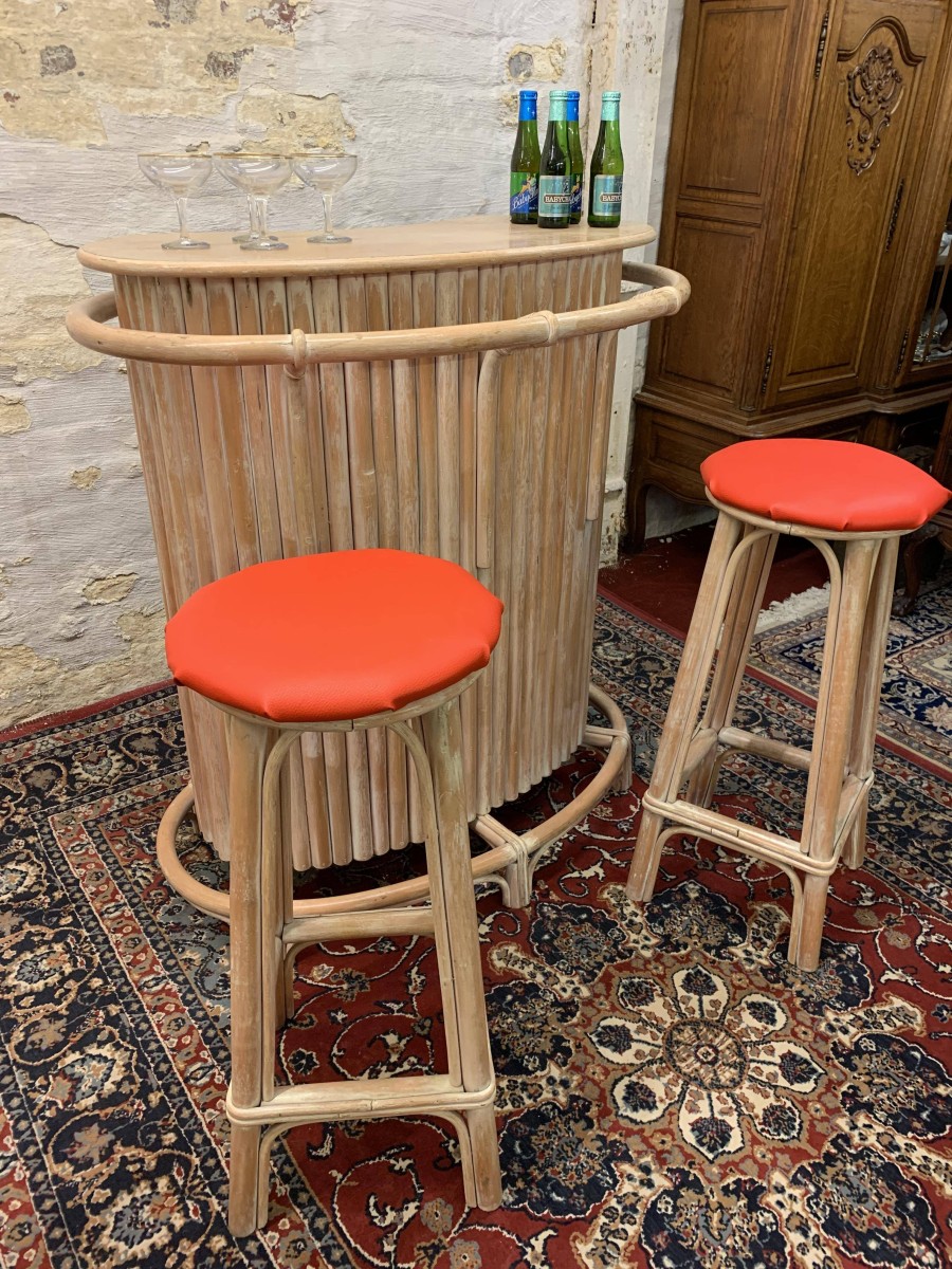 - Fabulous Mid Century Shaped Faux Bamboo Bar With Two Stools