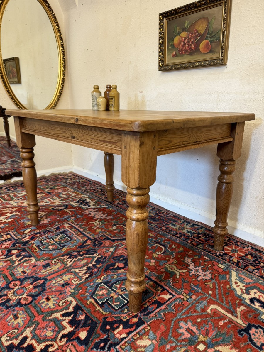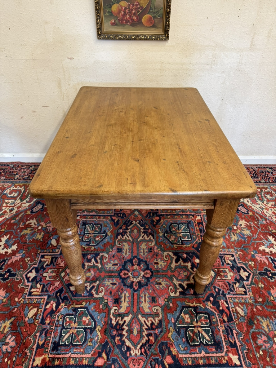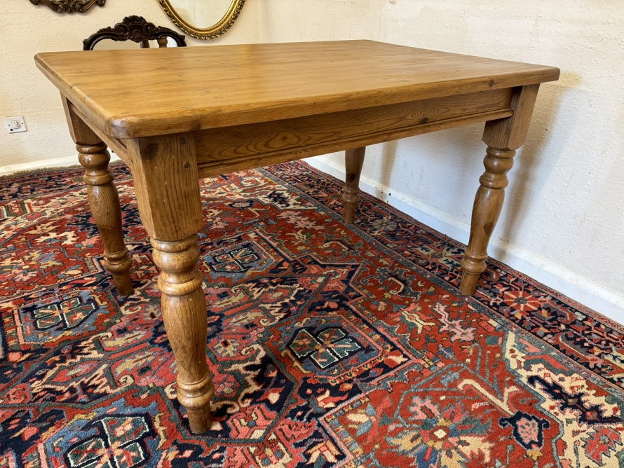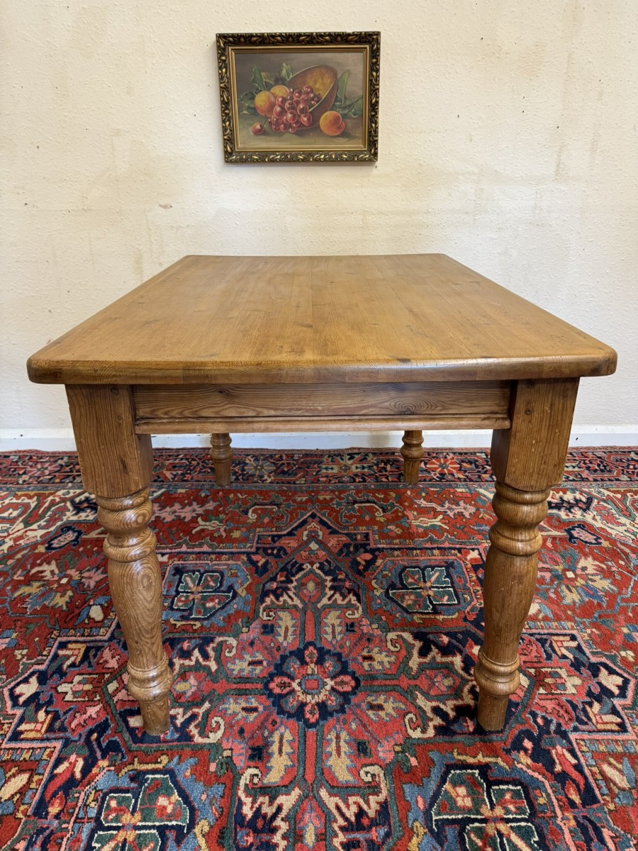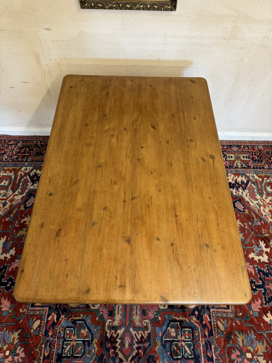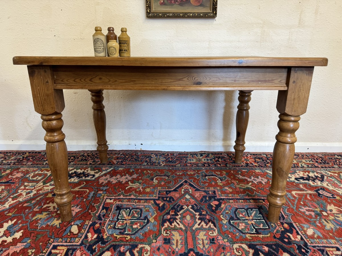 This fabulous size farmhouse table has a thick top and stands on four turned legs with turned feet.