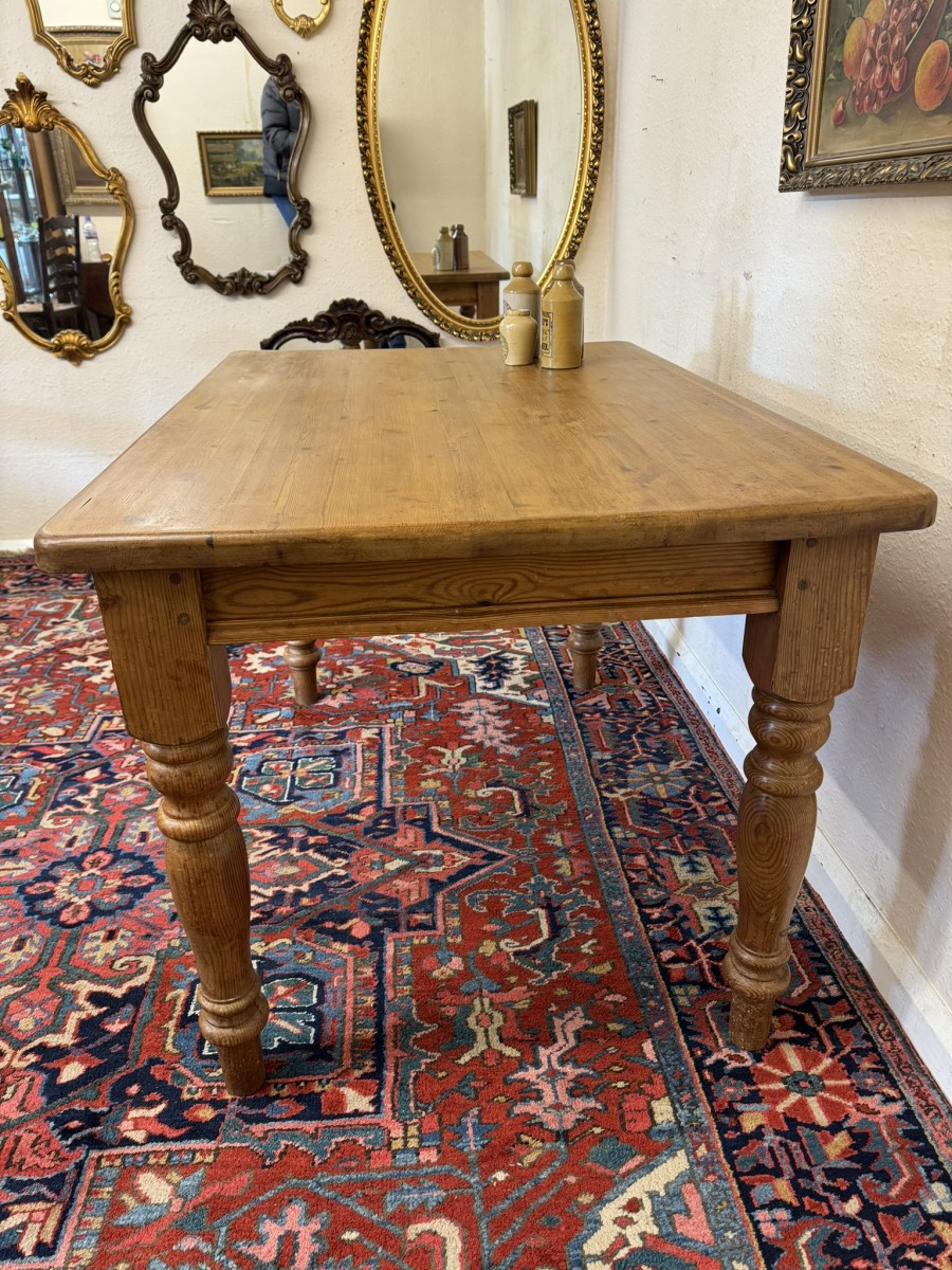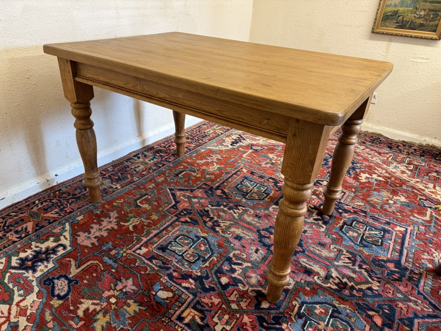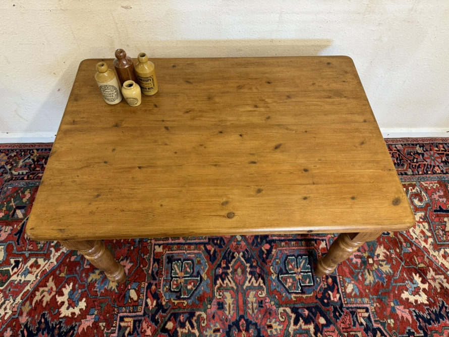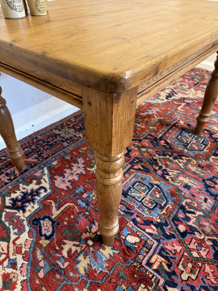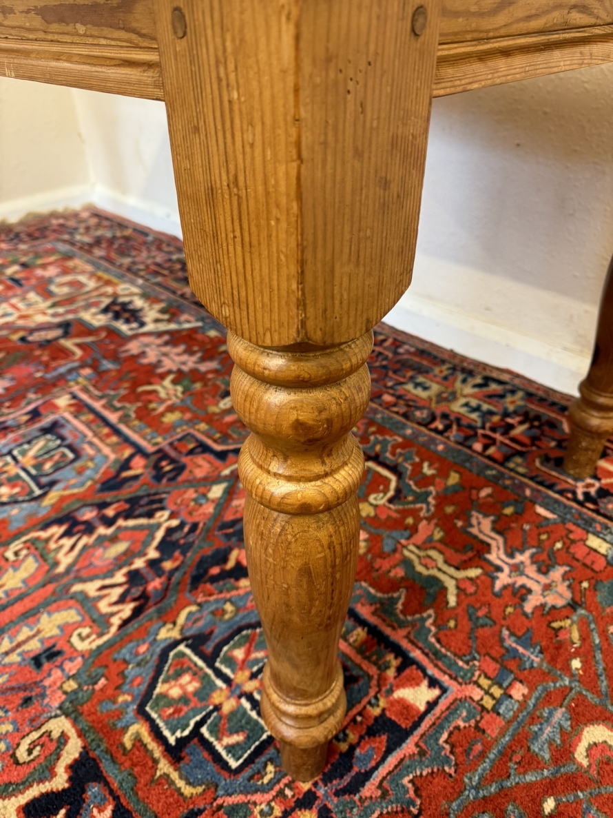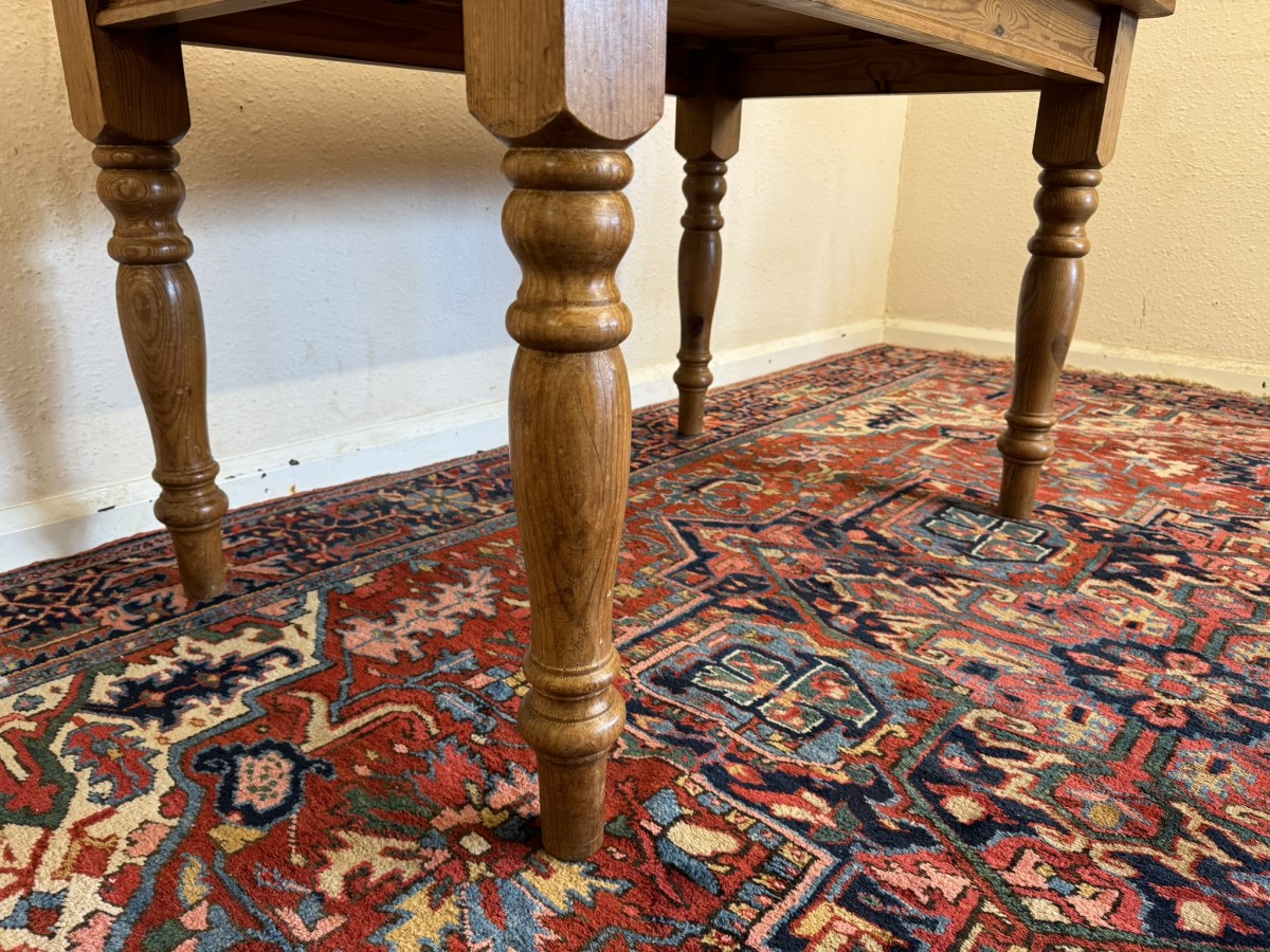 This fabulous size farmhouse table has a thick top and stands on four turned legs with turned feet.