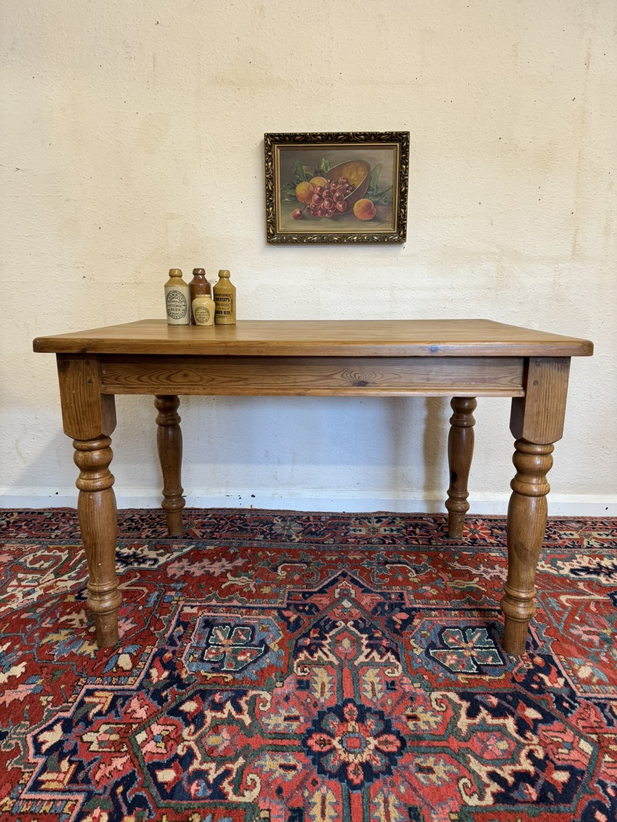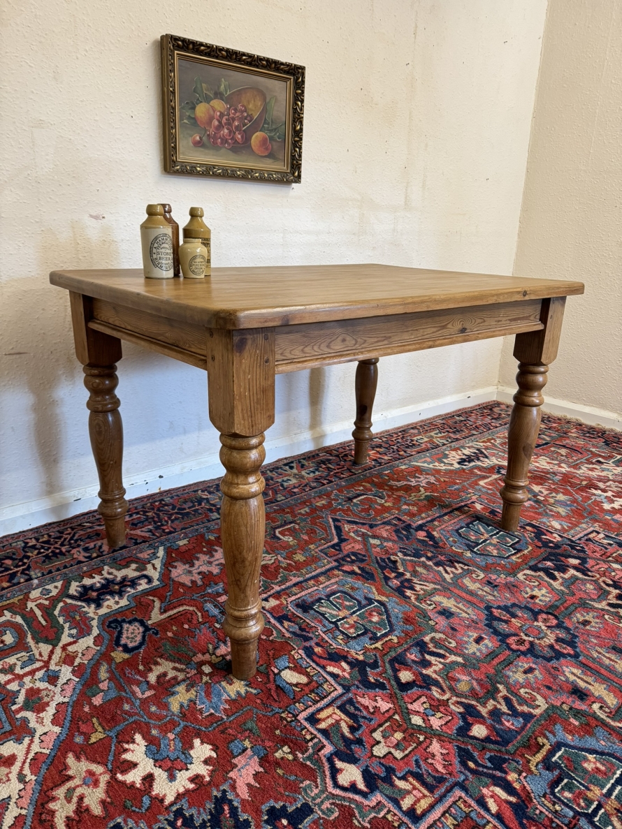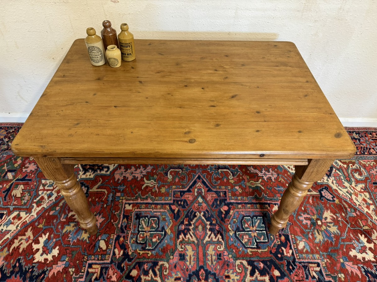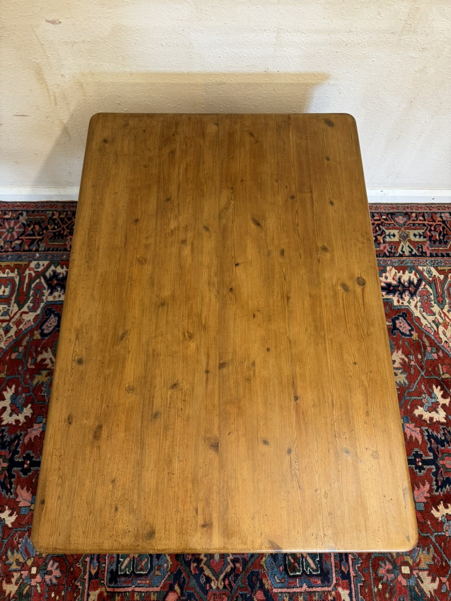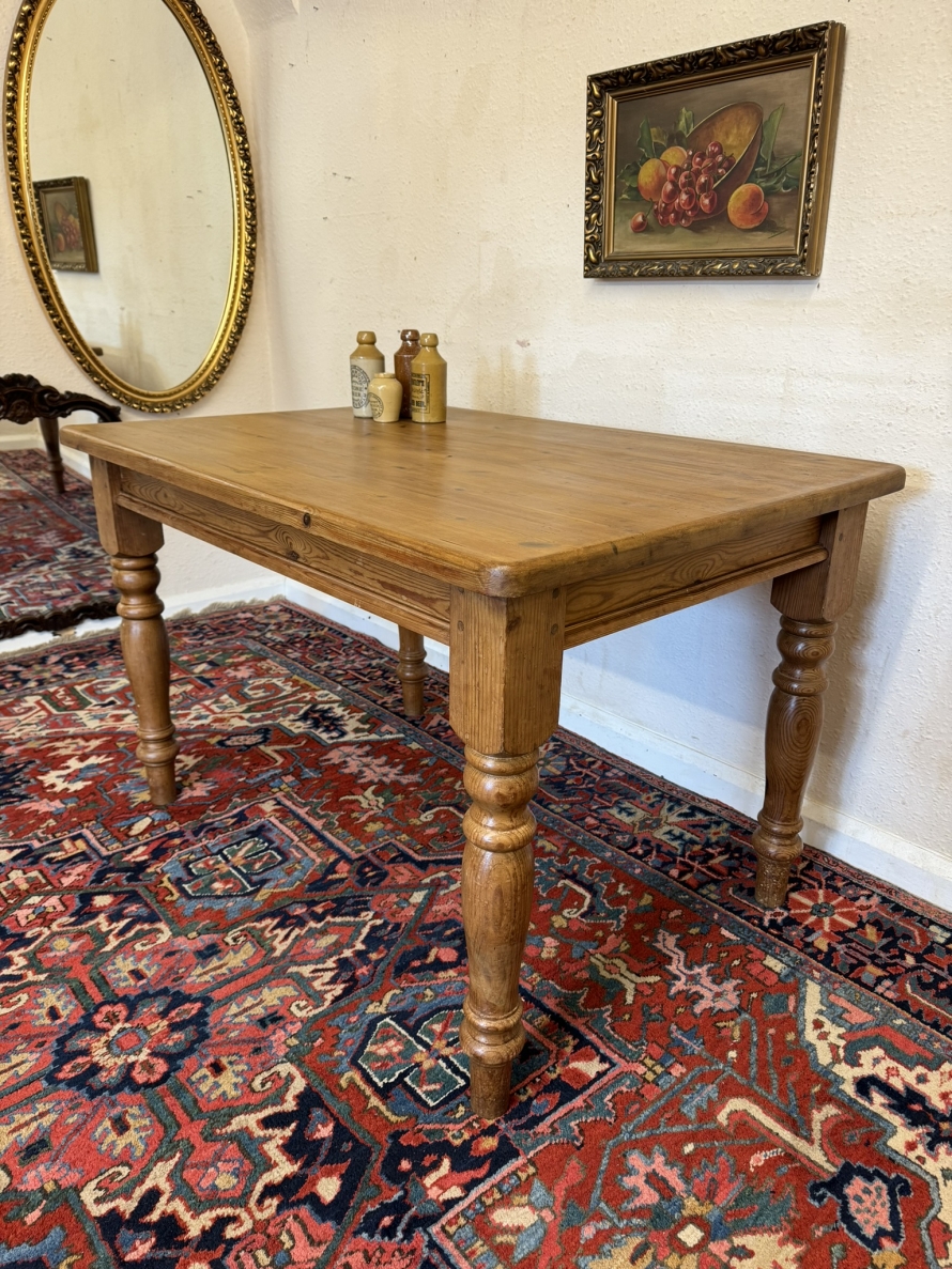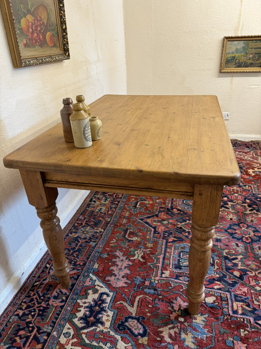 This fabulous size farmhouse table has a thick top and stands on four turned legs with turned feet.