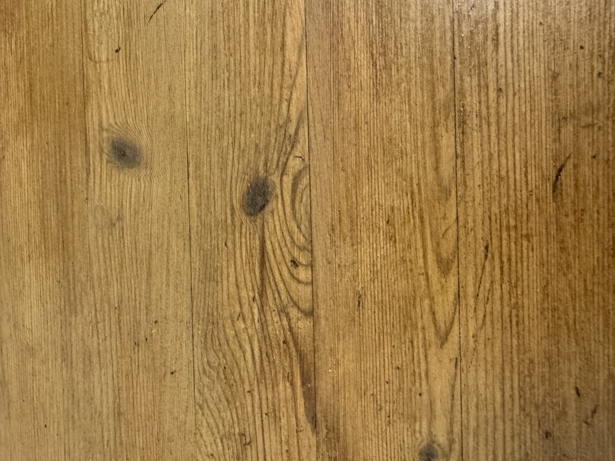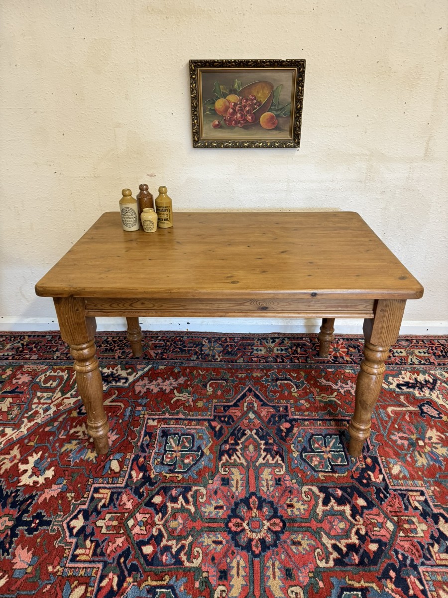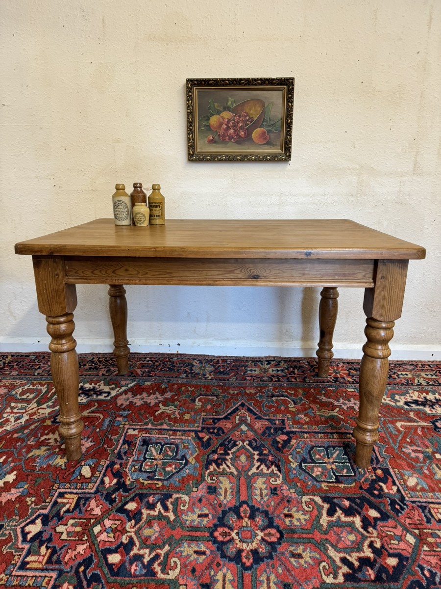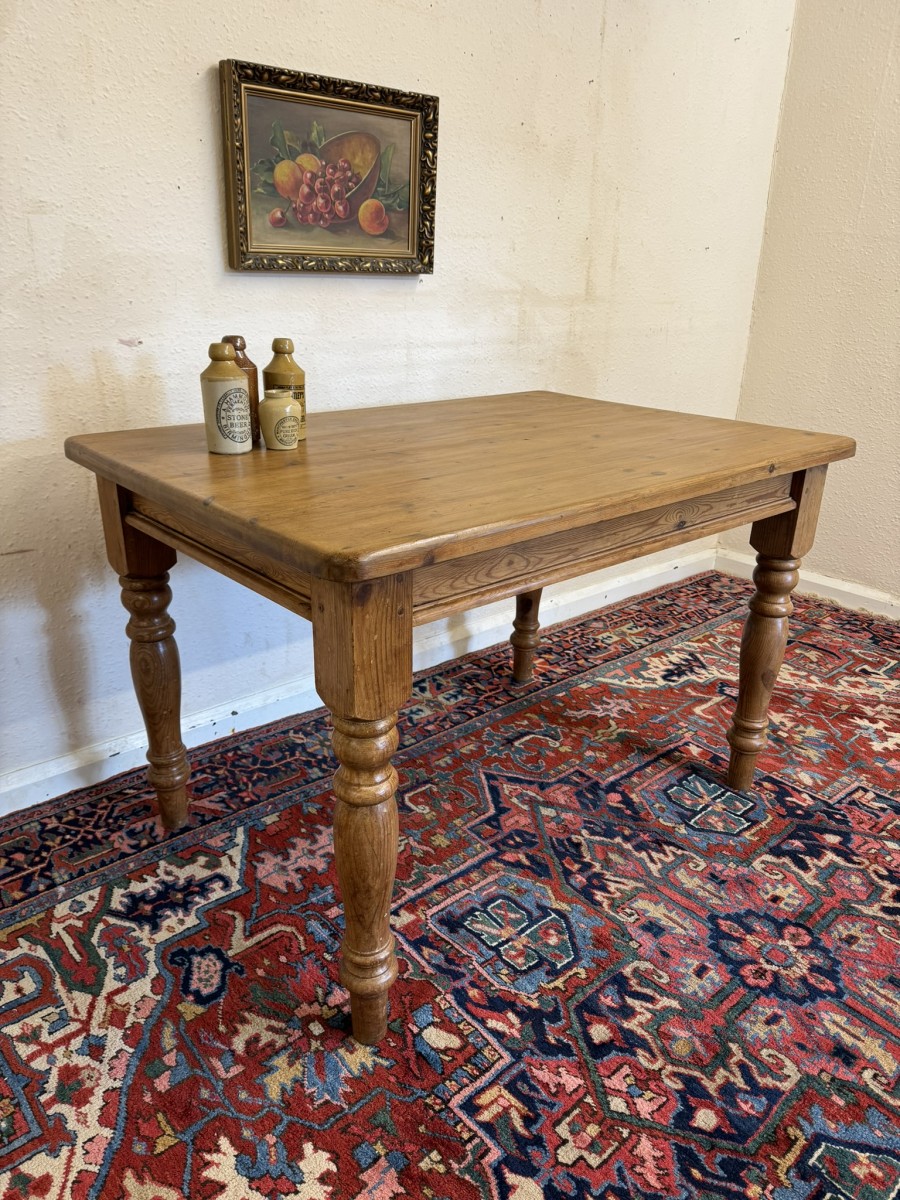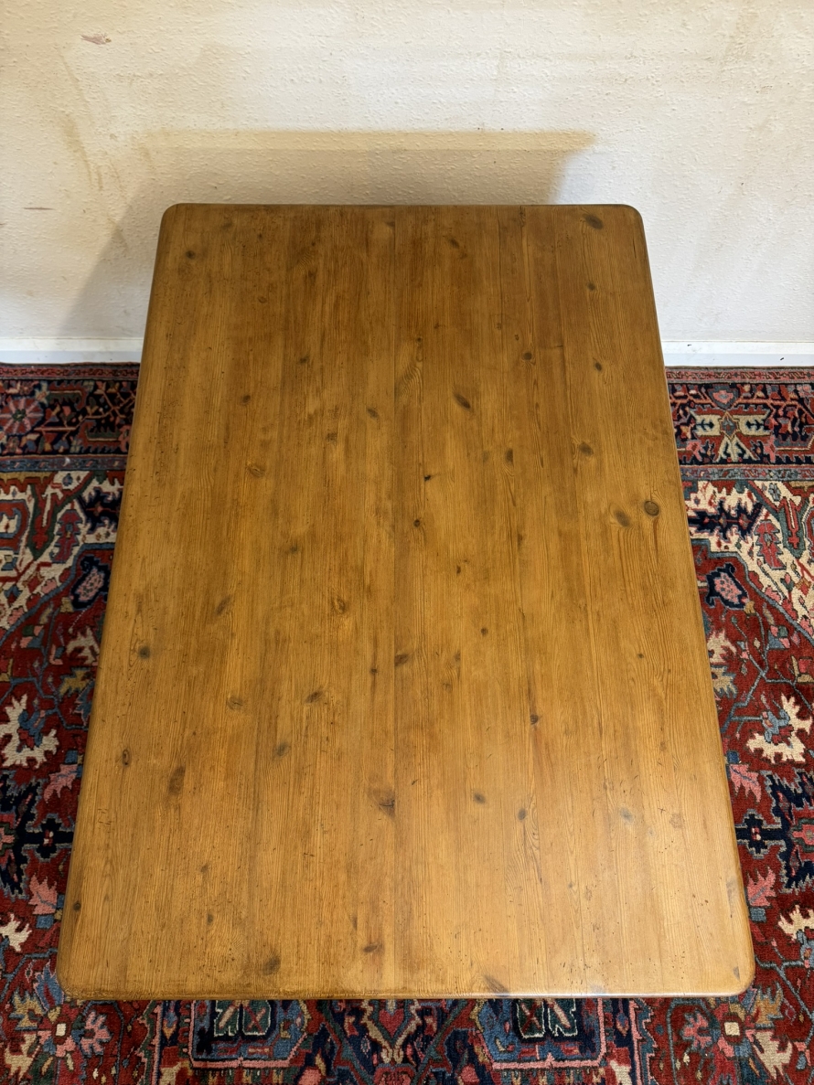 This fabulous size farmhouse table has a thick top and stands on four turned legs with turned feet.