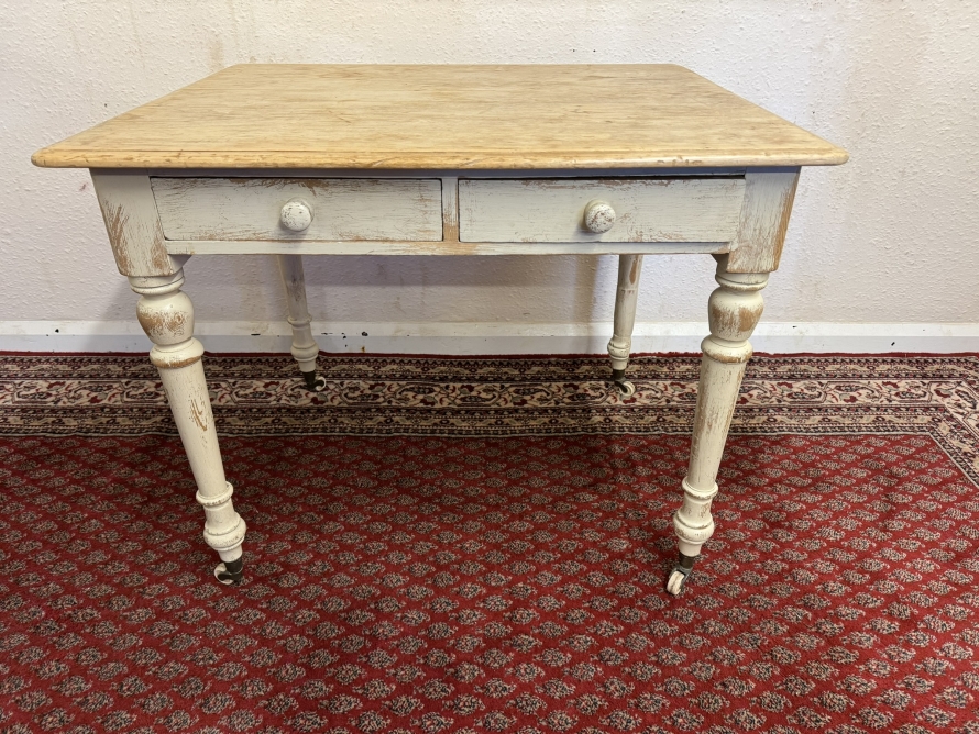 This fabulous pine table dates circa 1880. The oversailing stripped pine top sits above a pair of drawers, the drawers each having a turned knob handle. The drawers, sides and four legs are painted cream and stand on the original porcelain casters.
