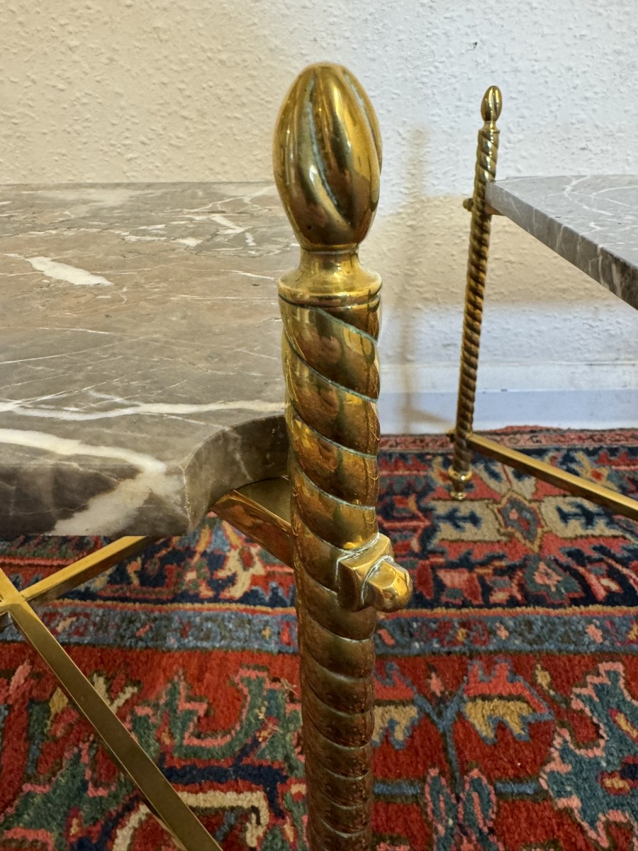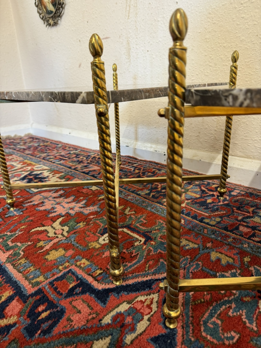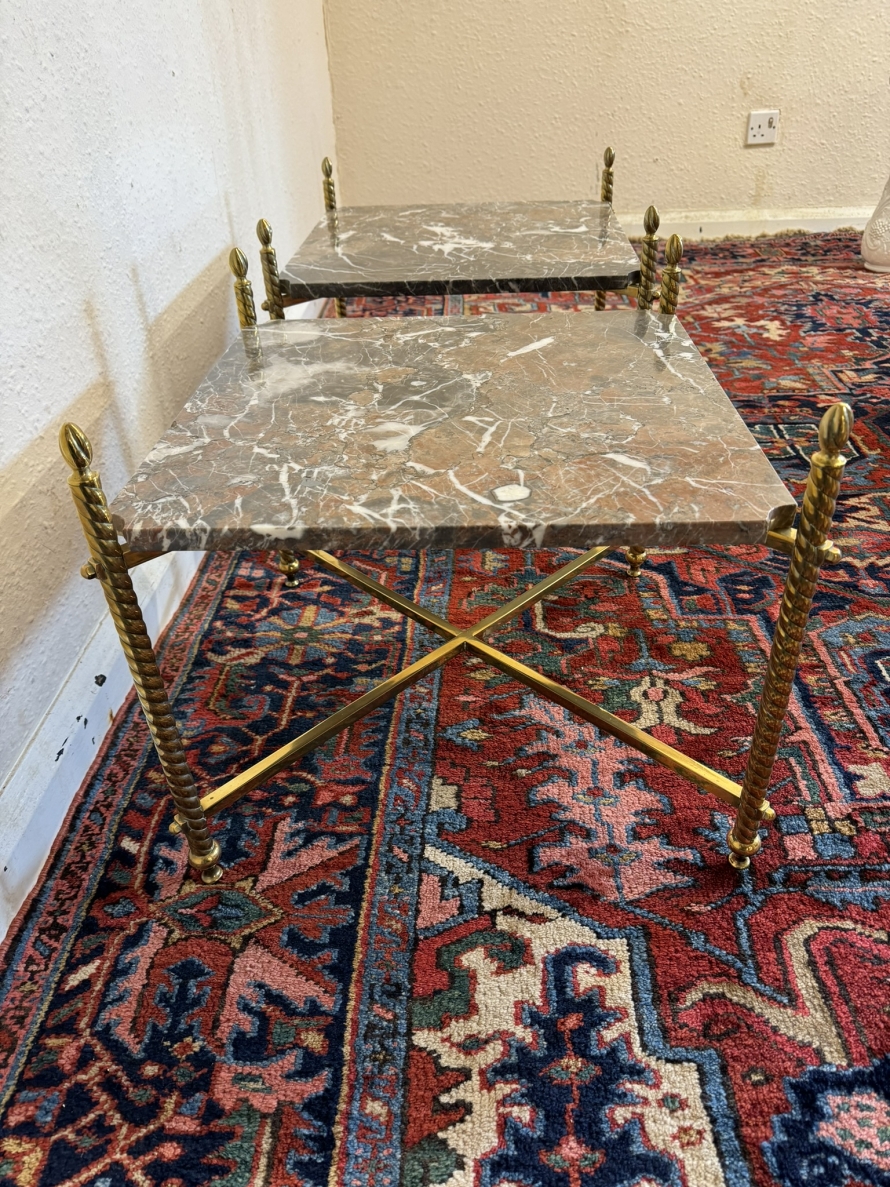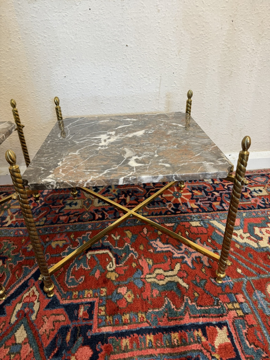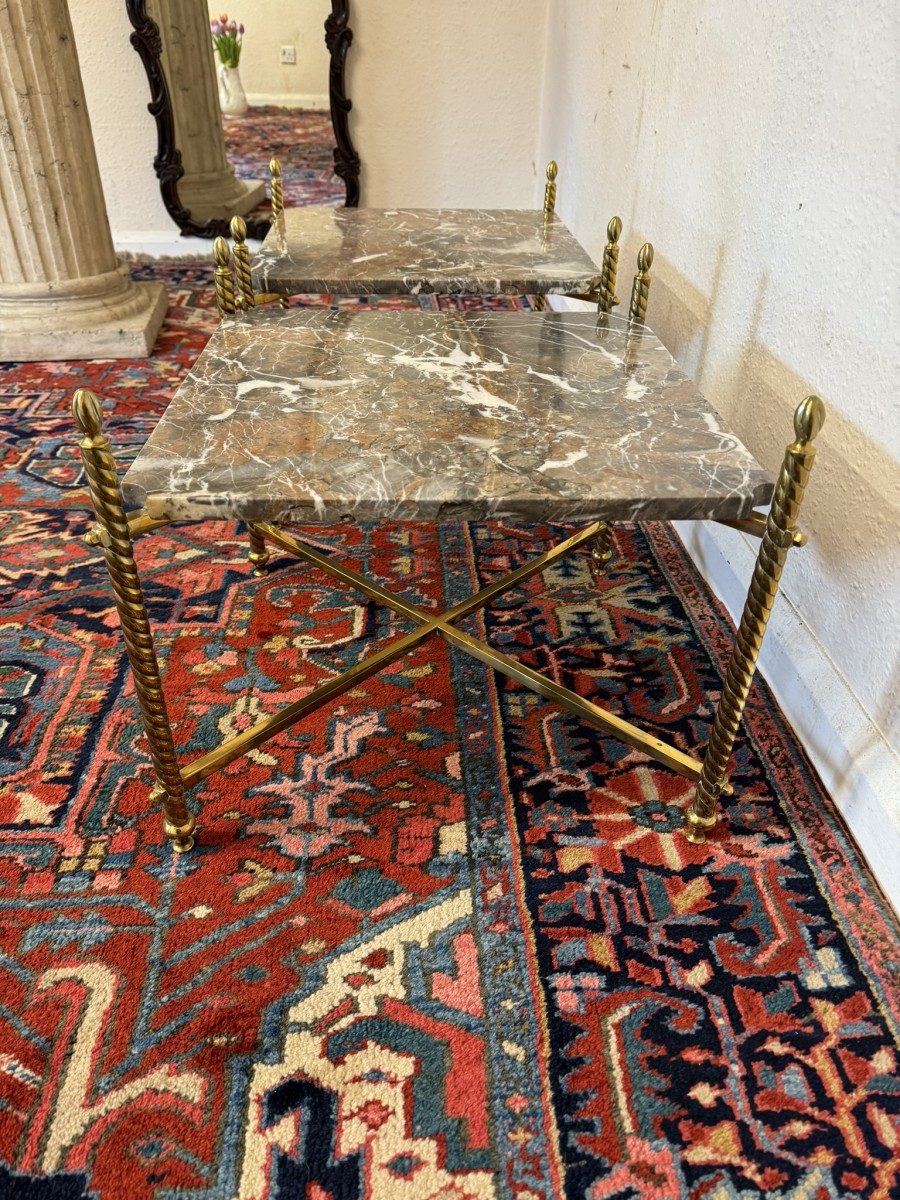 These fabulous tables date circa 1920. The brass frame consists of four candy twist legs on turned feet and x frame supprts. The removable marble tops sit on a x frame support. These heavy brass tables are in excellent condition and were designed with style and quality.