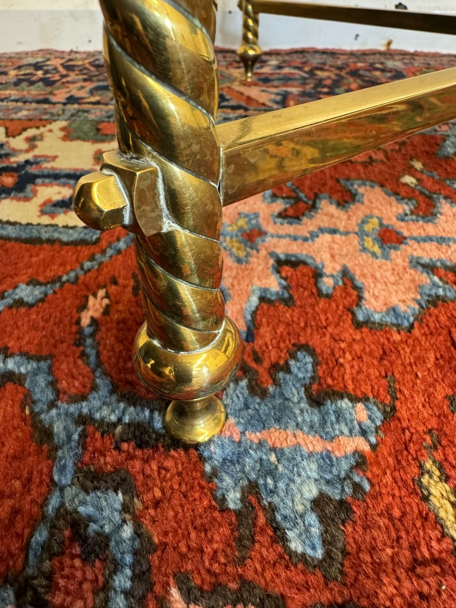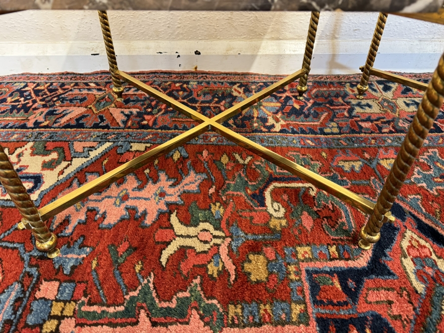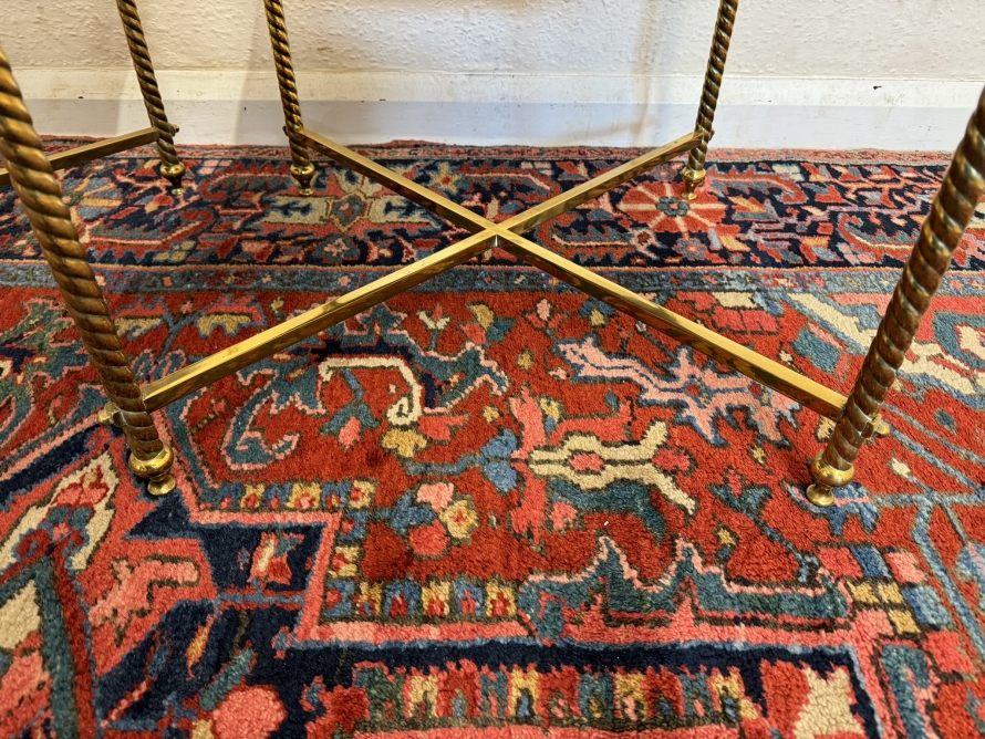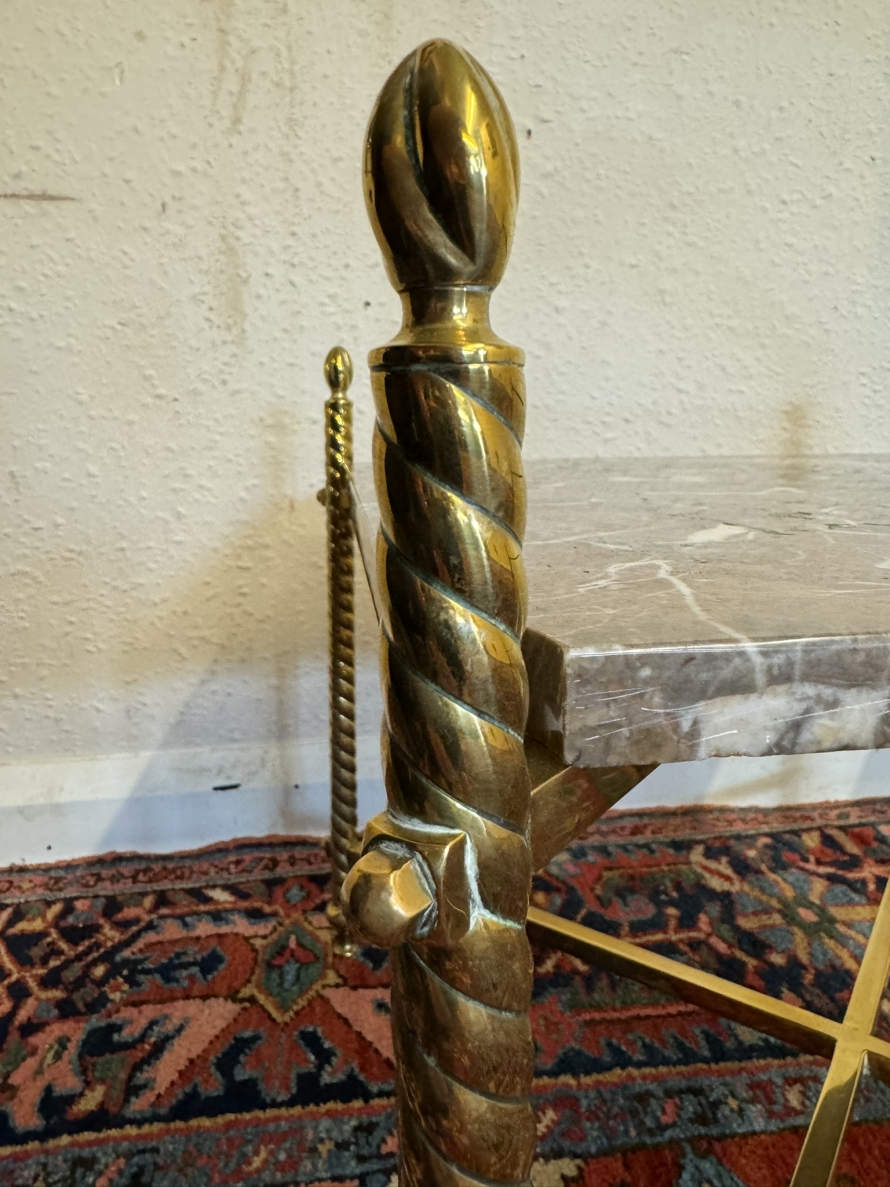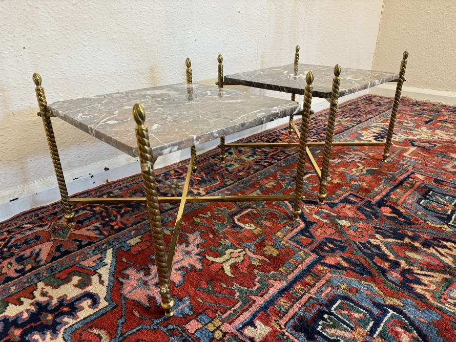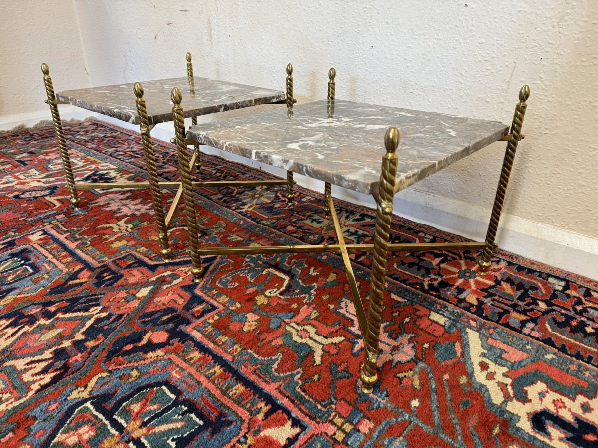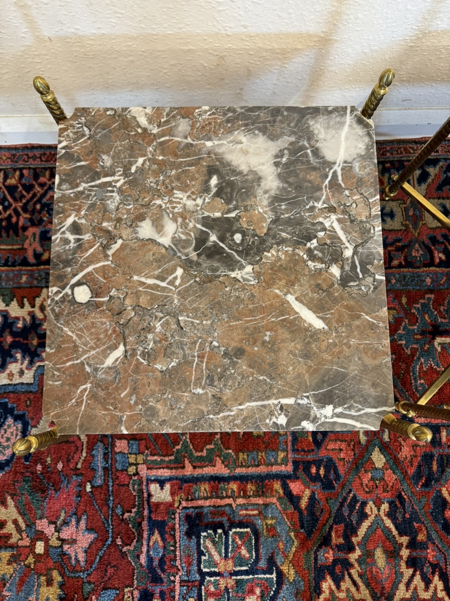 These fabulous tables date circa 1920. The brass frame consists of four candy twist legs on turned feet and x frame supprts. The removable marble tops sit on a x frame support. These heavy brass tables are in excellent condition and were designed with style and quality.