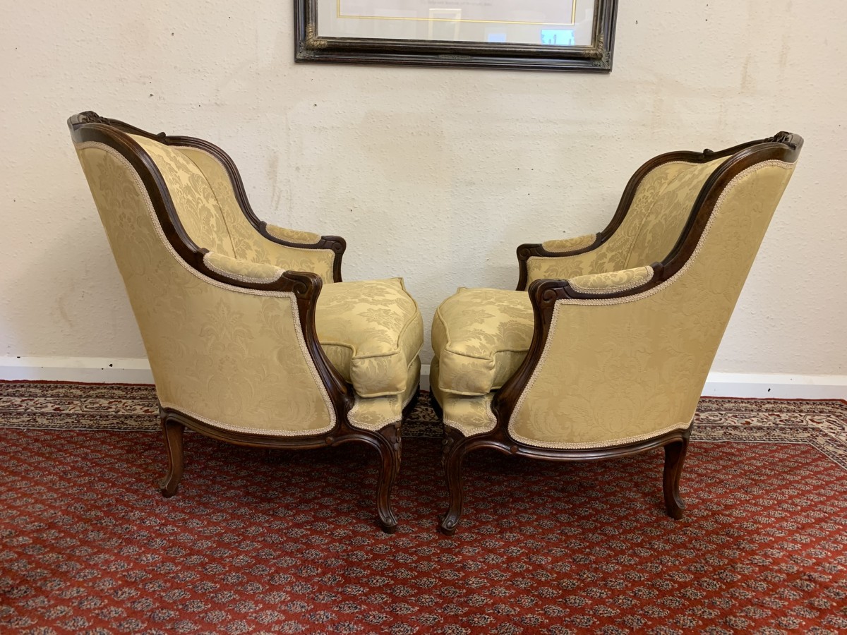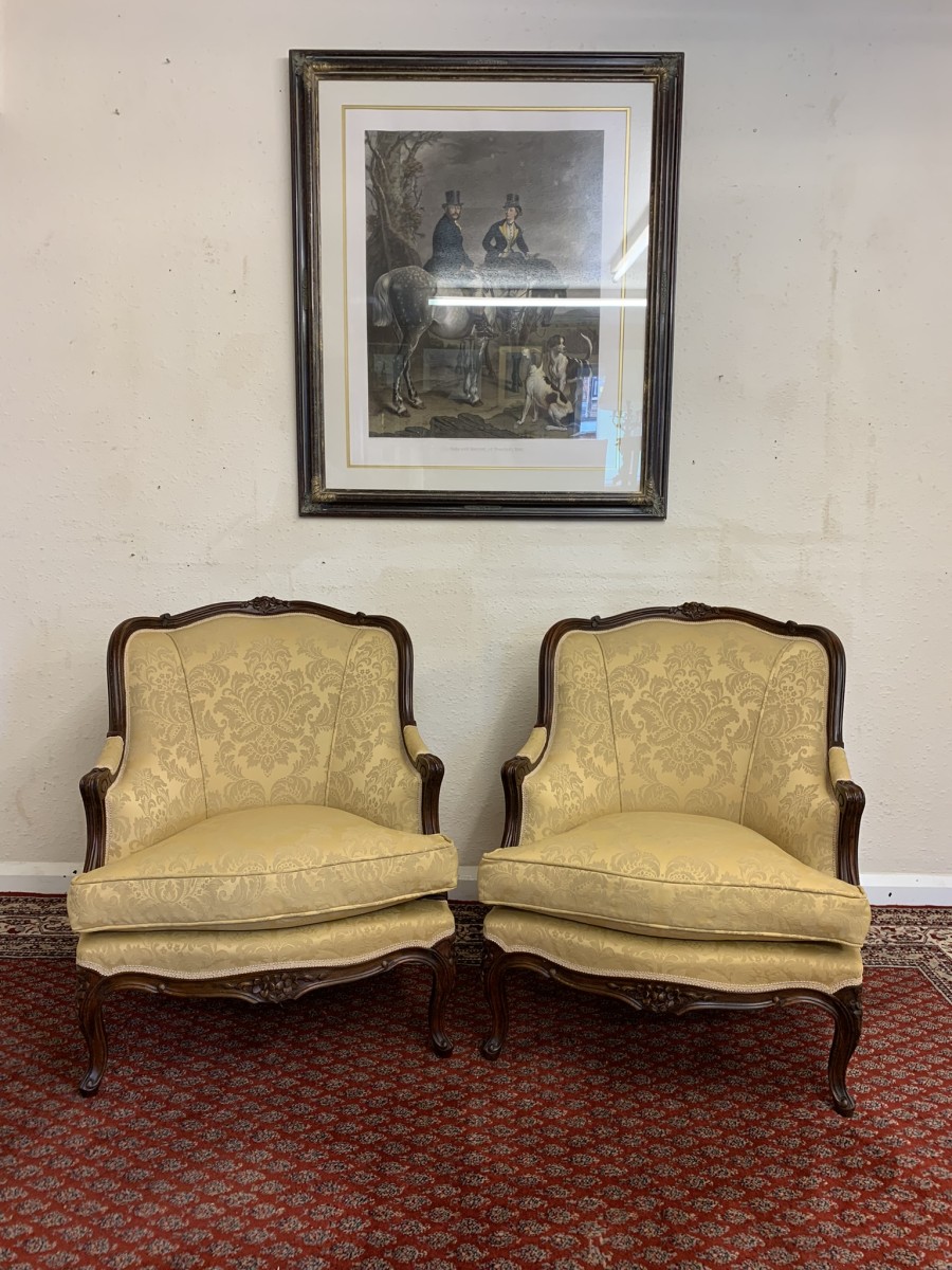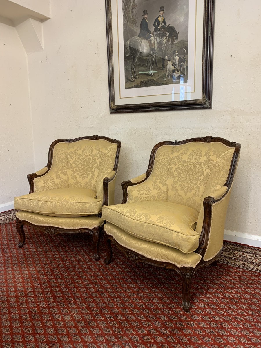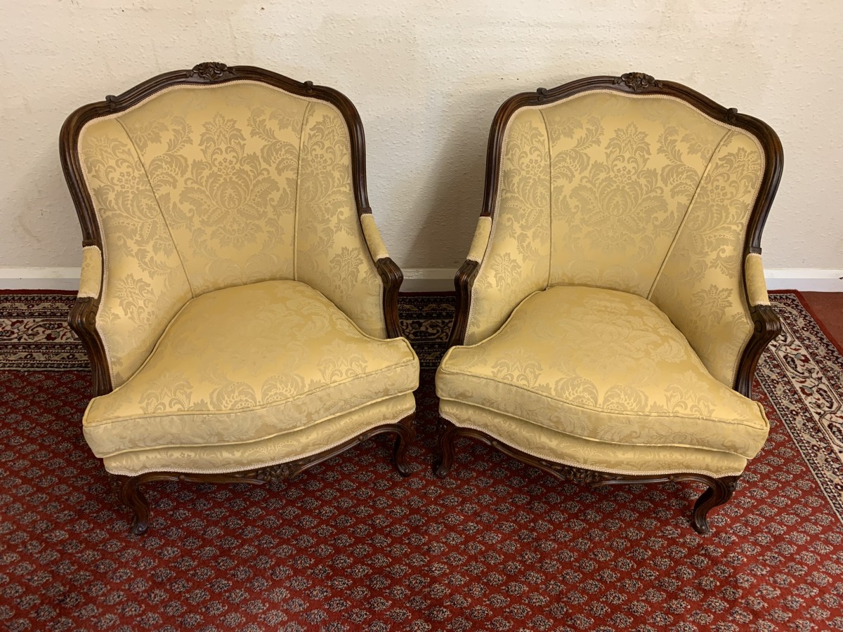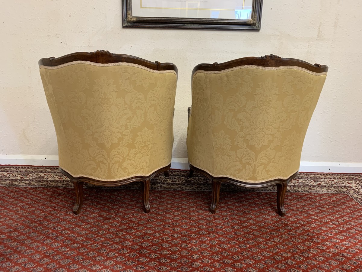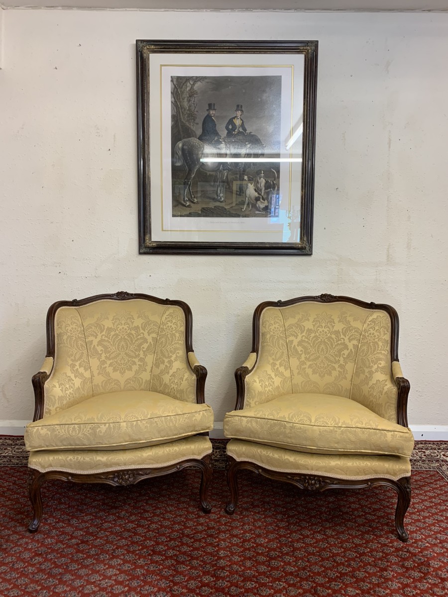 These stylish chairs date circa 1920. Each chair has a shaped back which rises to a central carving. Carved flowing arms, shaped skirt with central carving and standing on four carved cabriole legs. The chairs are tastefully upholstered in a beautiful demask fabric.