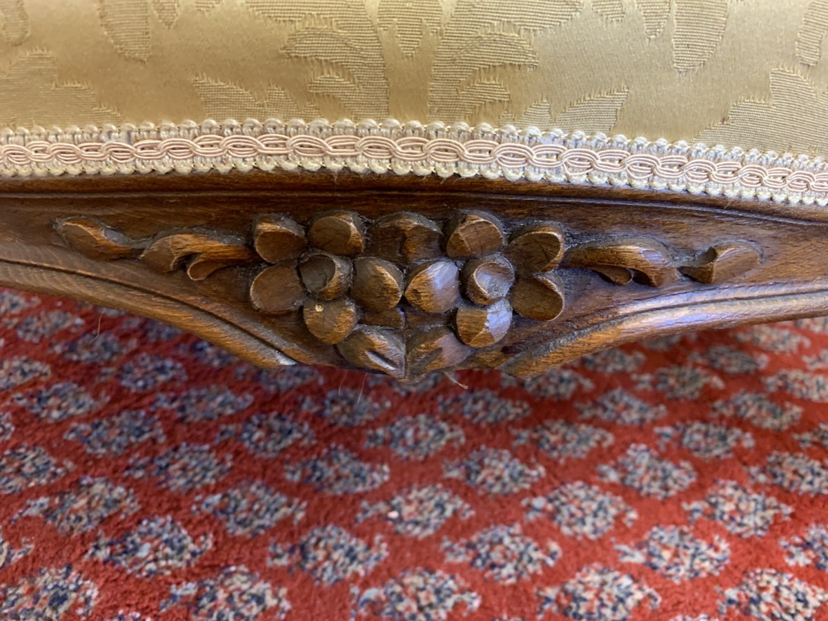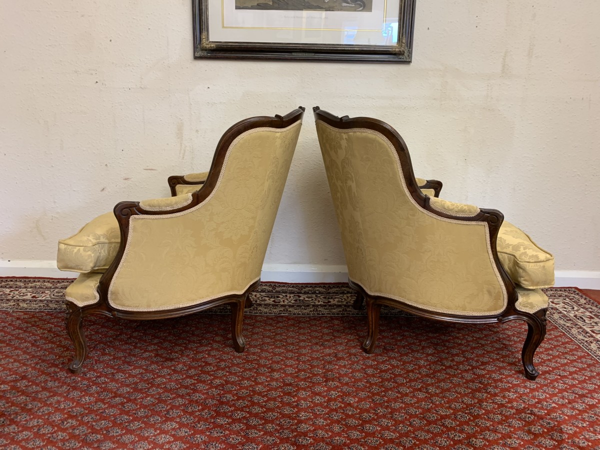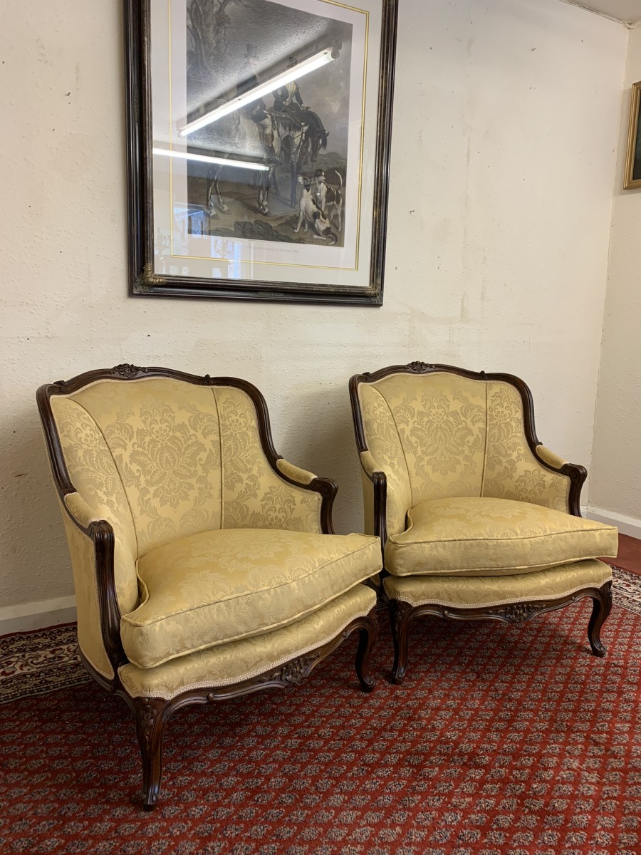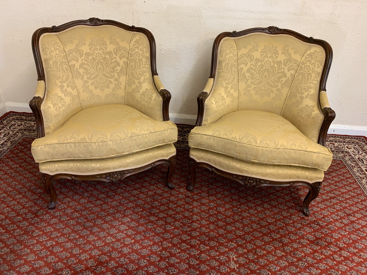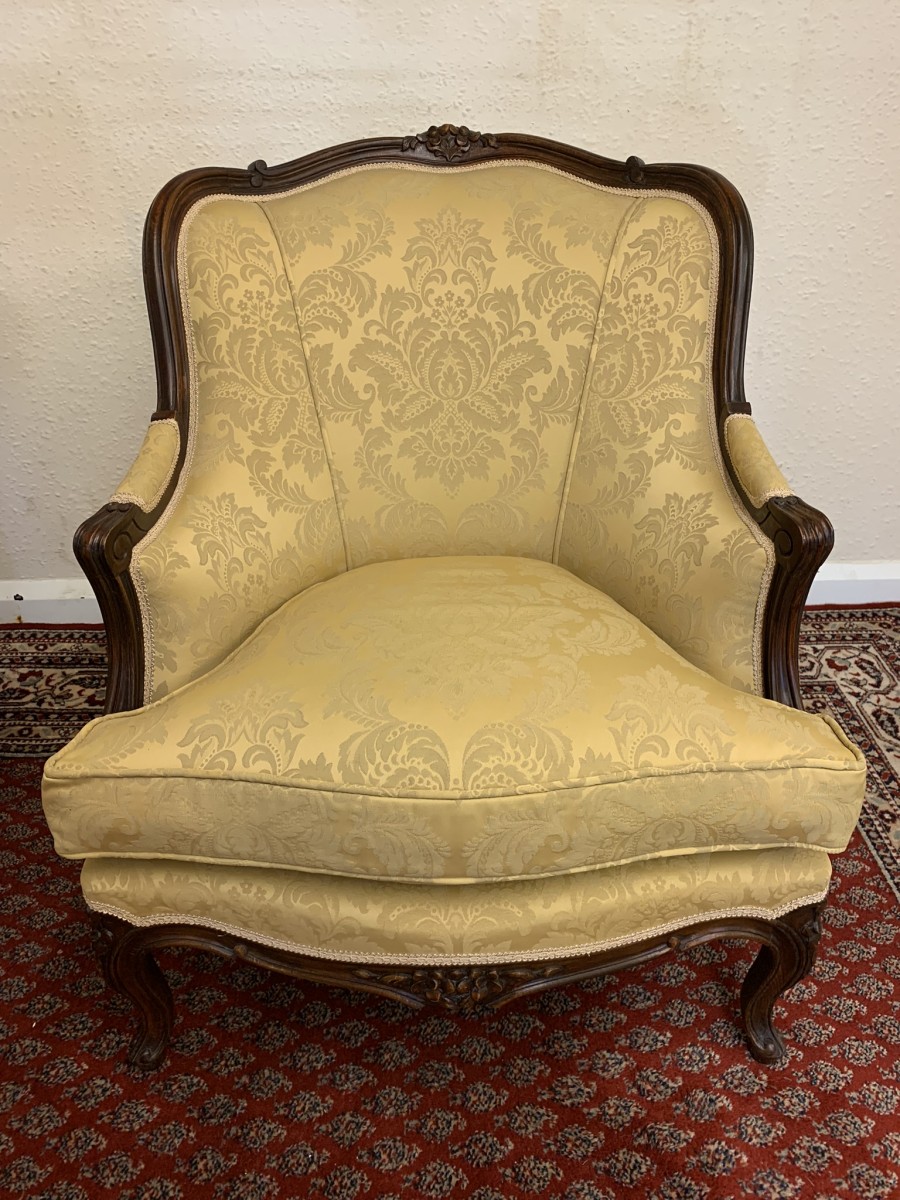 These stylish chairs date circa 1920. Each chair has a shaped back which rises to a central carving. Carved flowing arms, shaped skirt with central carving and standing on four carved cabriole legs. The chairs are tastefully upholstered in a beautiful demask fabric.