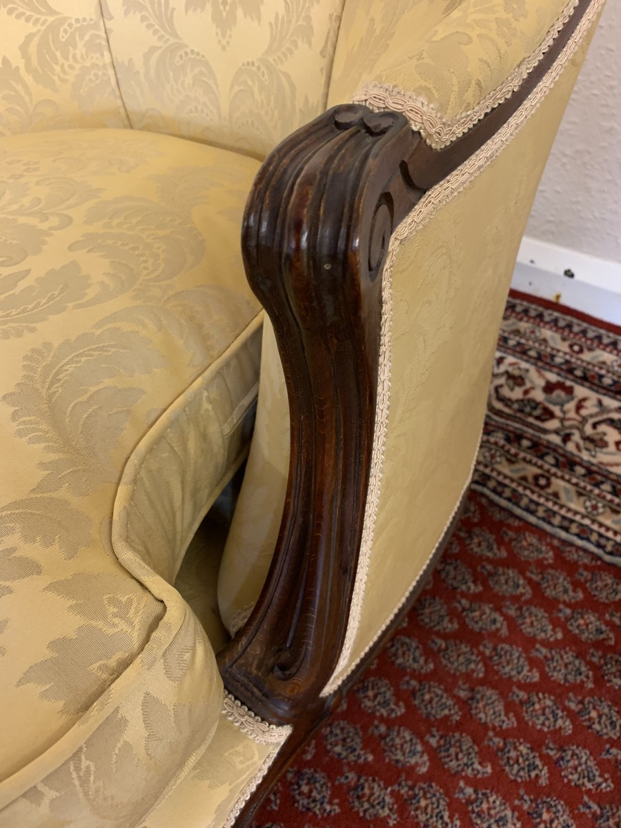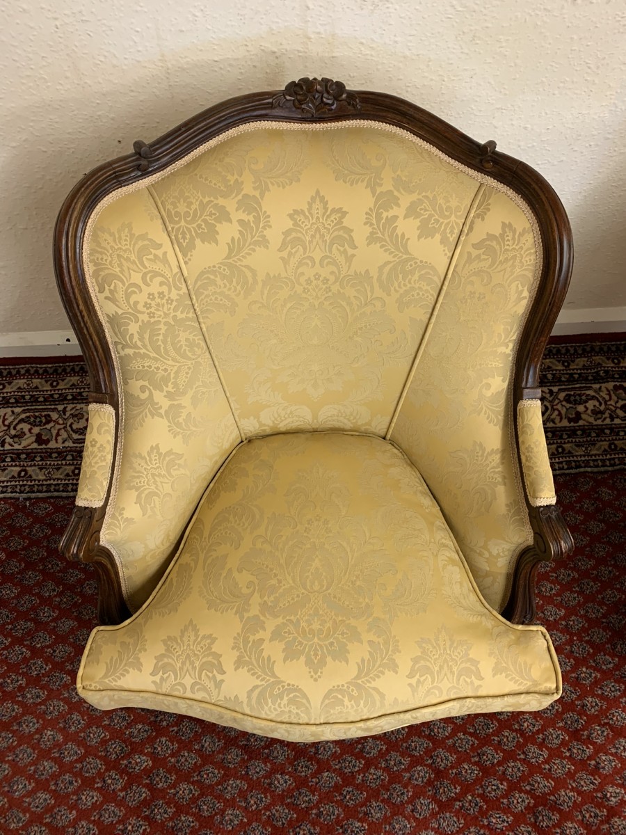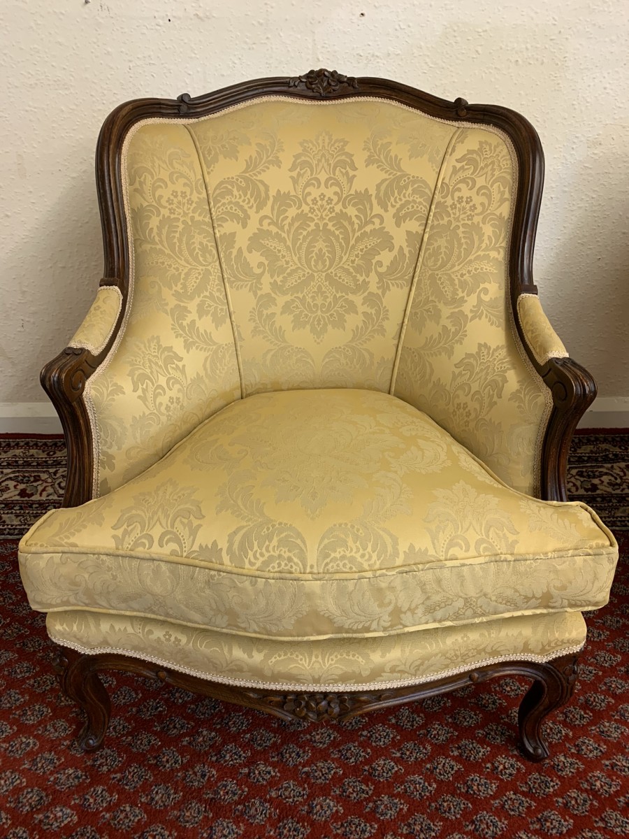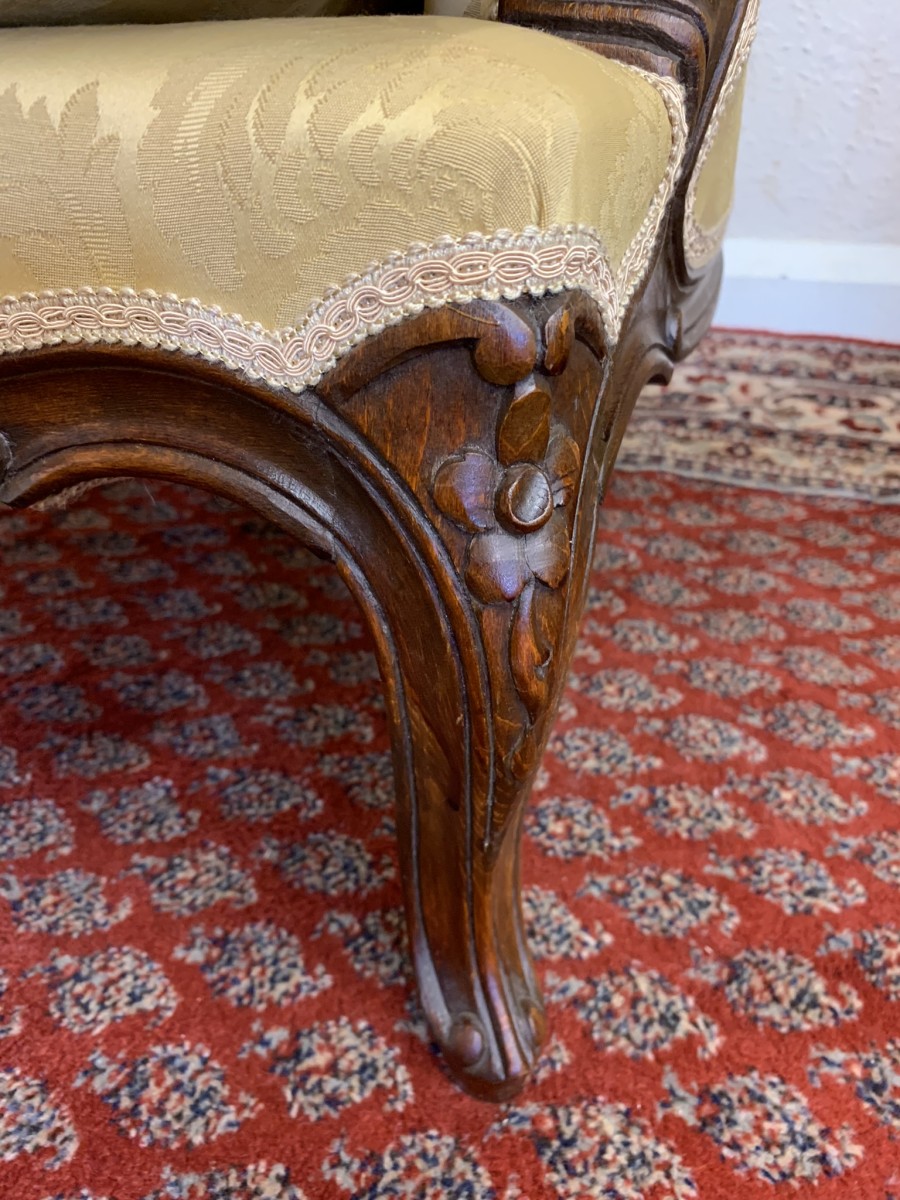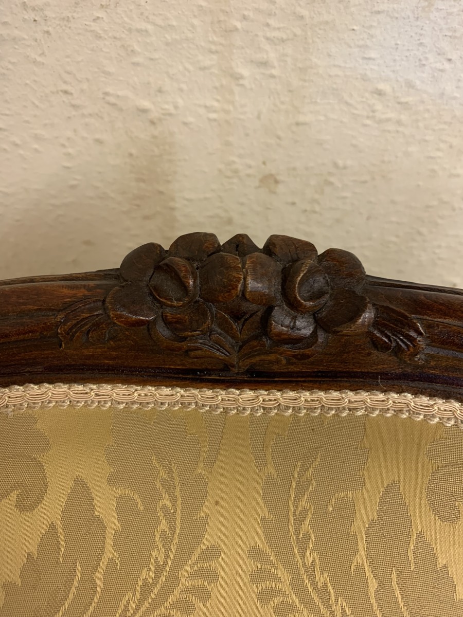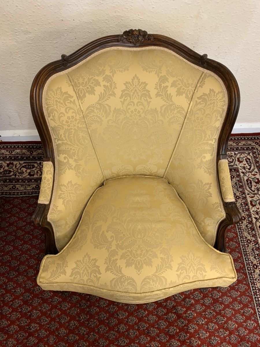These stylish chairs date circa 1920. Each chair has a shaped back which rises to a central carving. Carved flowing arms, shaped skirt with central carving and standing on four carved cabriole legs. The chairs are tastefully upholstered in a beautiful demask fabric.