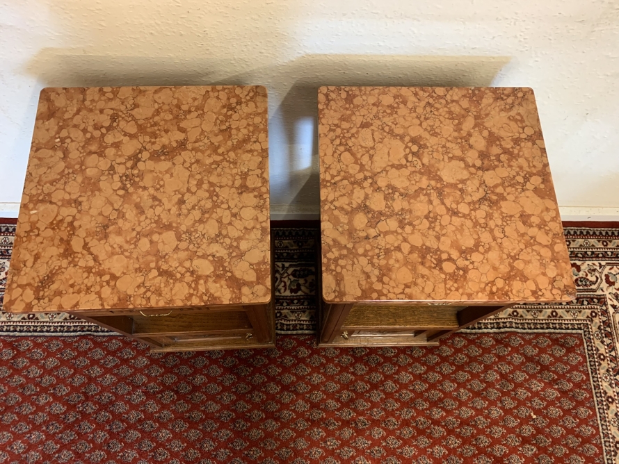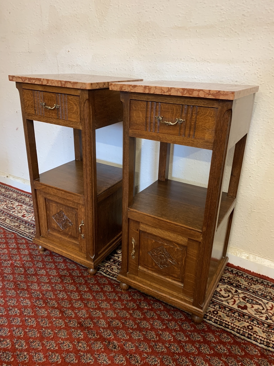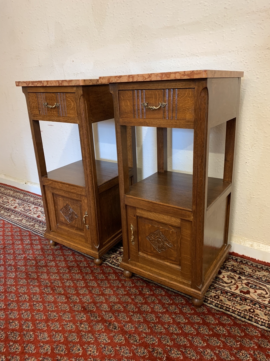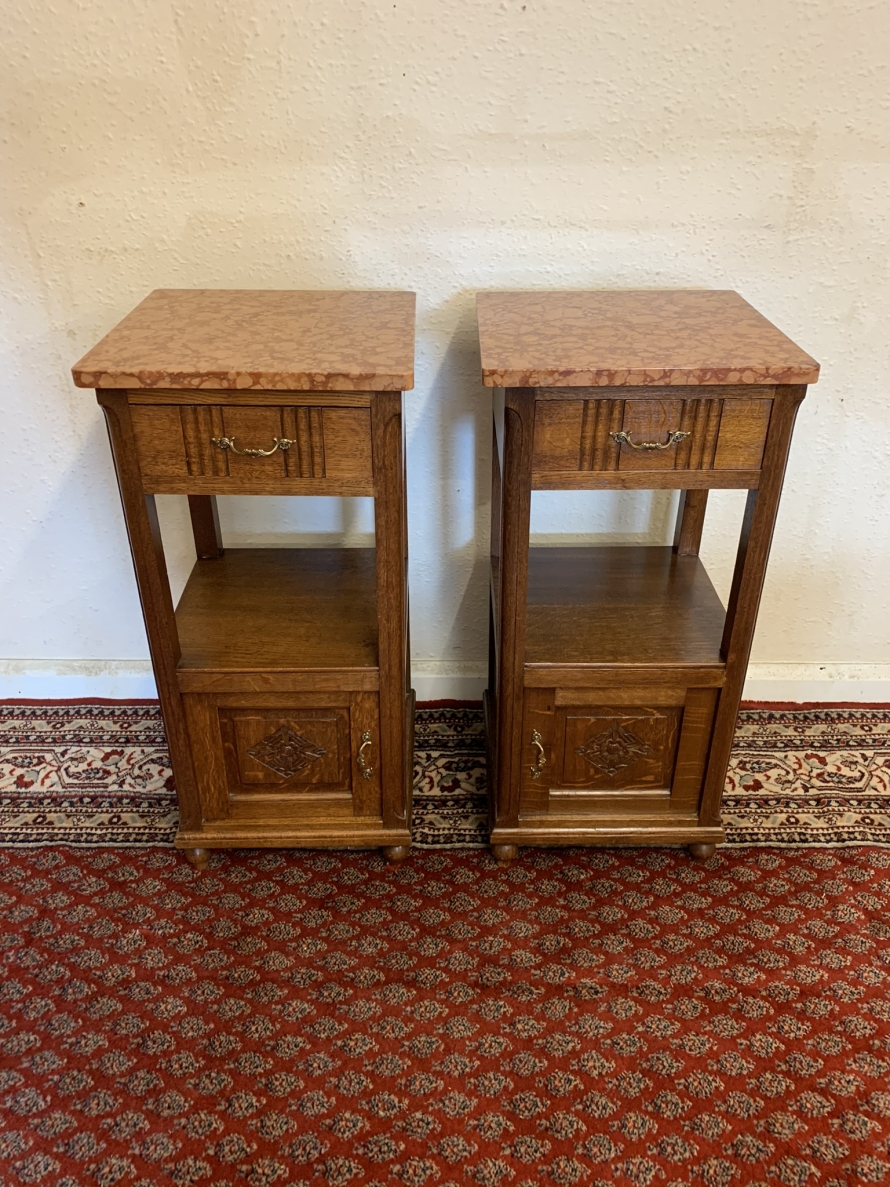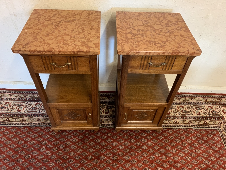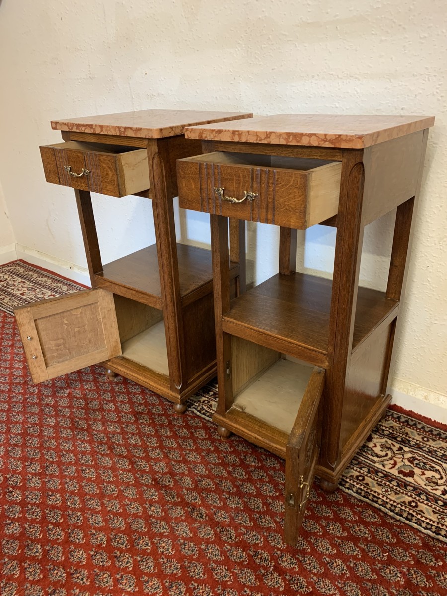 These bedside cabinets date circa 1920 and are in excellent condition. Each cabinet has a marble top, drawer with ornate brass handle with carved recessed panelled door below, the door has a brass ornate handle. Recessed panelled sides each cabinet sits on four turned feet. Please note we are also listing is a matching mirror door armoire and marble topped mirrored washstand (as pictured)