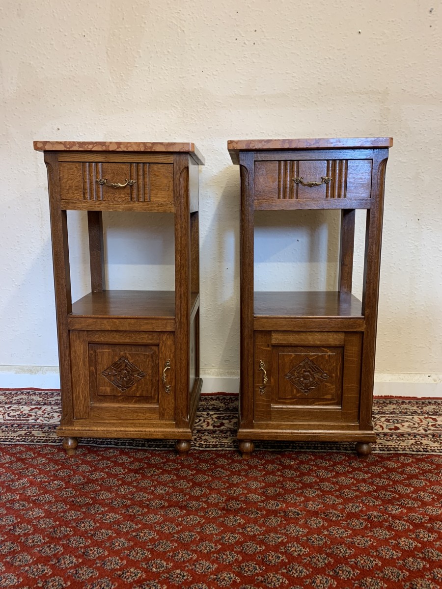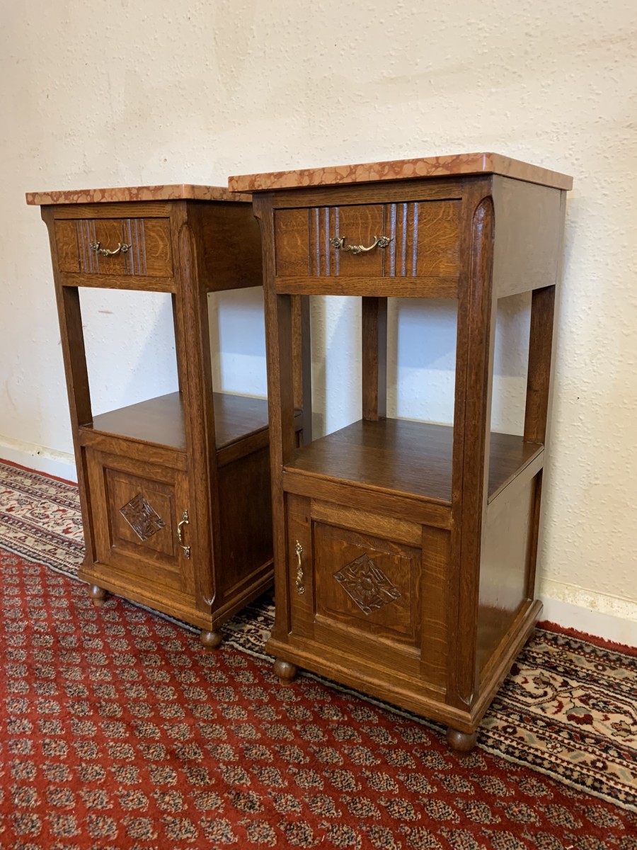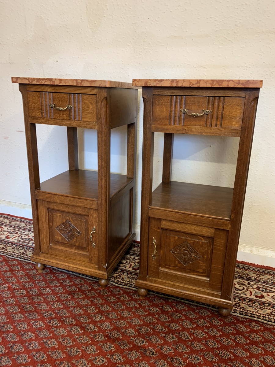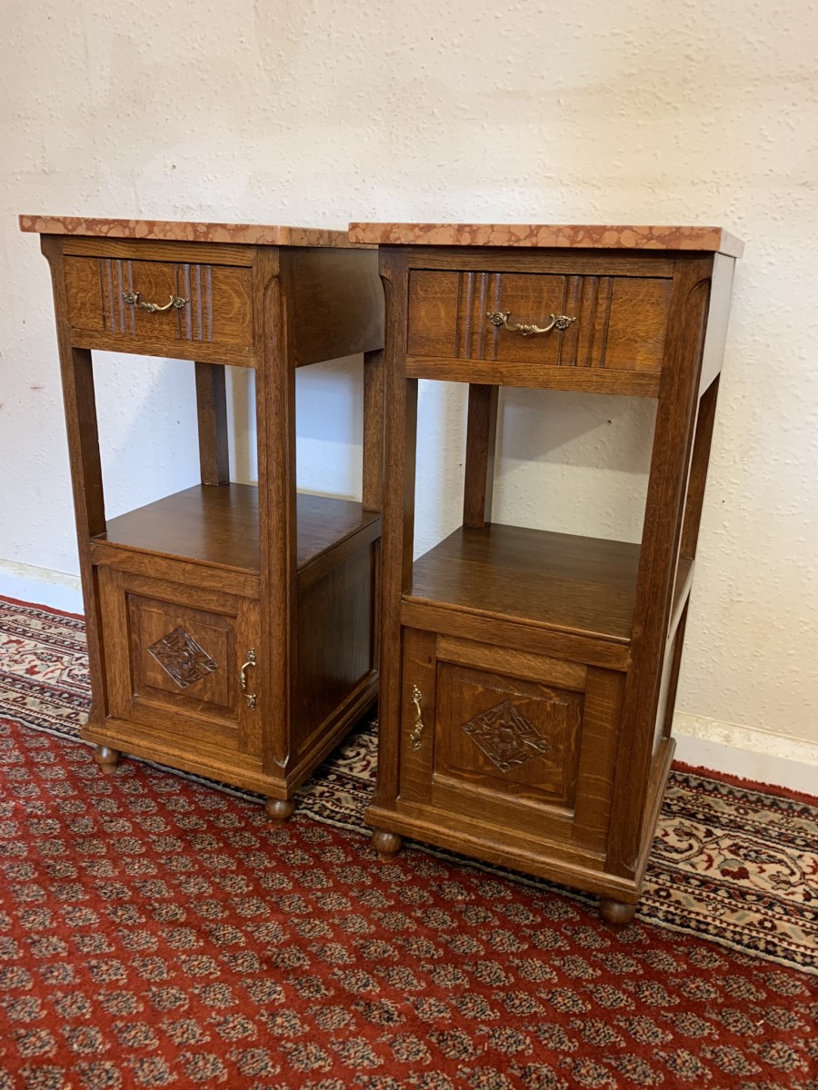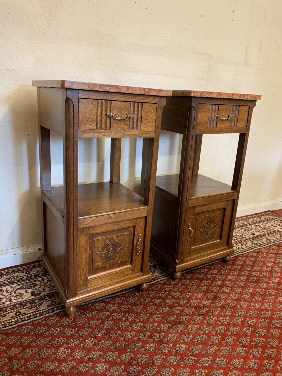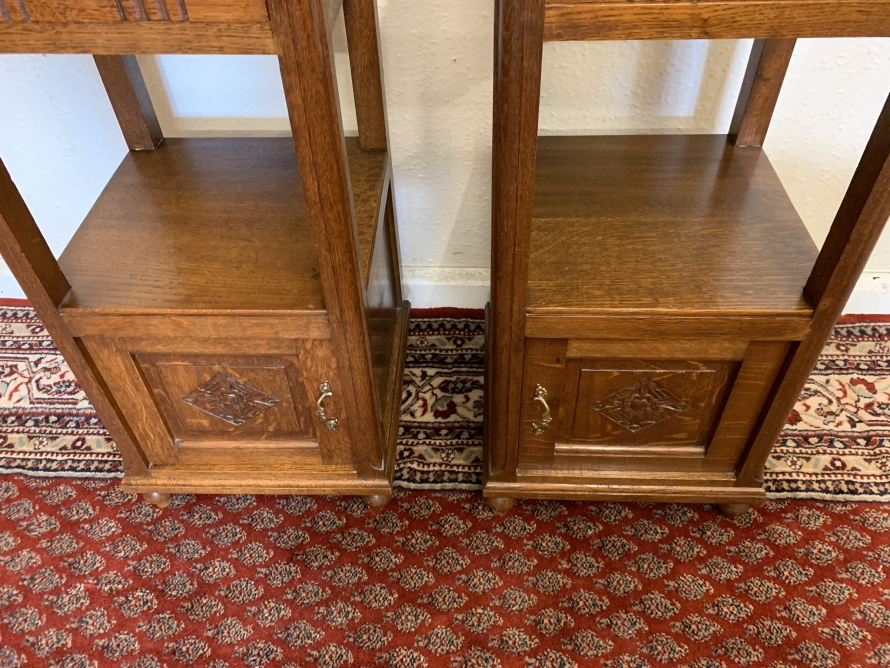 These bedside cabinets date circa 1920 and are in excellent condition. Each cabinet has a marble top, drawer with ornate brass handle with carved recessed panelled door below, the door has a brass ornate handle. Recessed panelled sides each cabinet sits on four turned feet. Please note we are also listing is a matching mirror door armoire and marble topped mirrored washstand (as pictured)