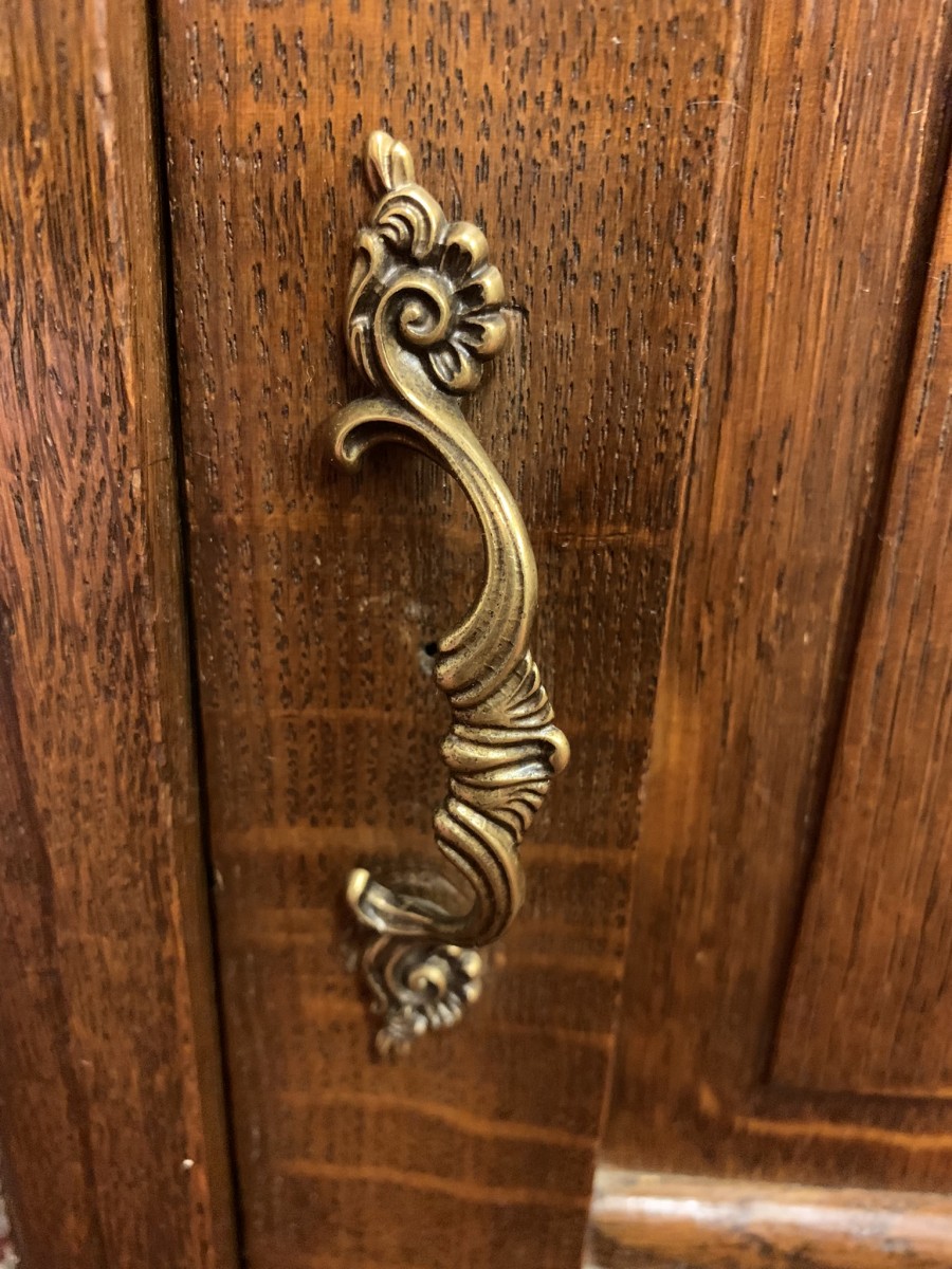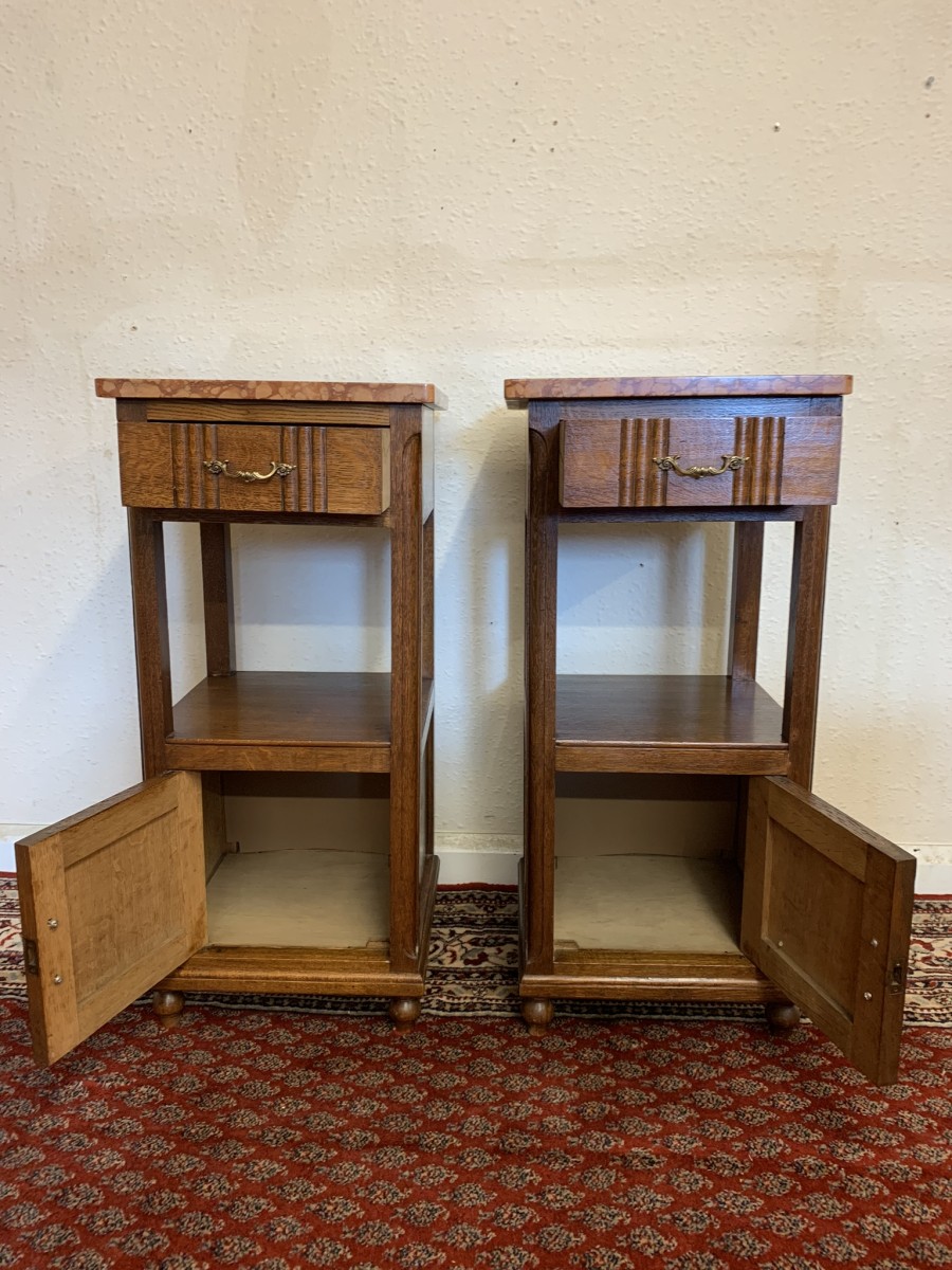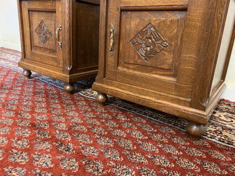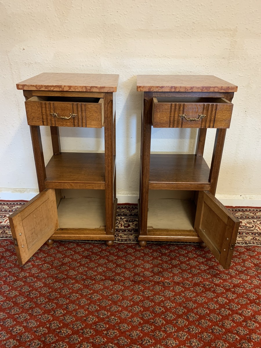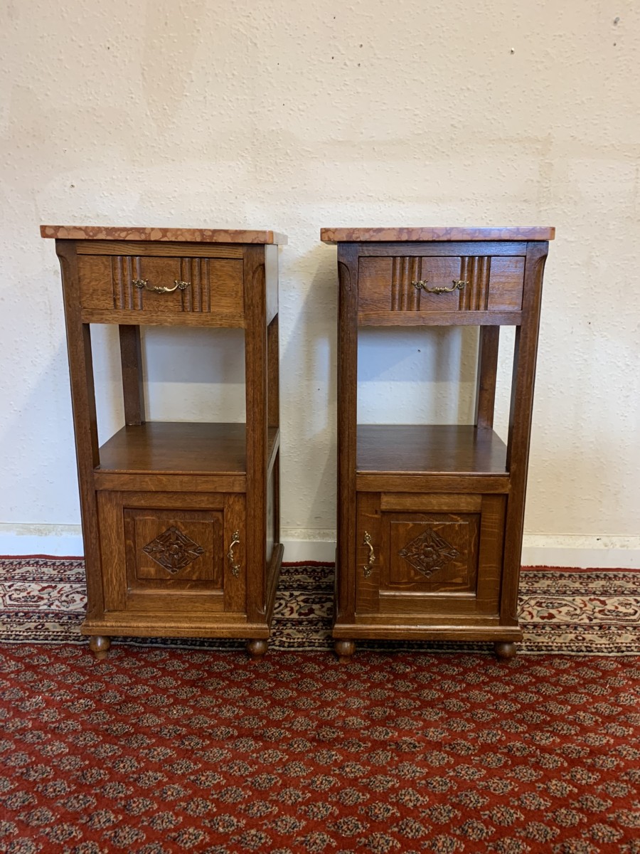 These bedside cabinets date circa 1920 and are in excellent condition. Each cabinet has a marble top, drawer with ornate brass handle with carved recessed panelled door below, the door has a brass ornate handle. Recessed panelled sides each cabinet sits on four turned feet. Please note we are also listing is a matching mirror door armoire and marble topped mirrored washstand (as pictured)