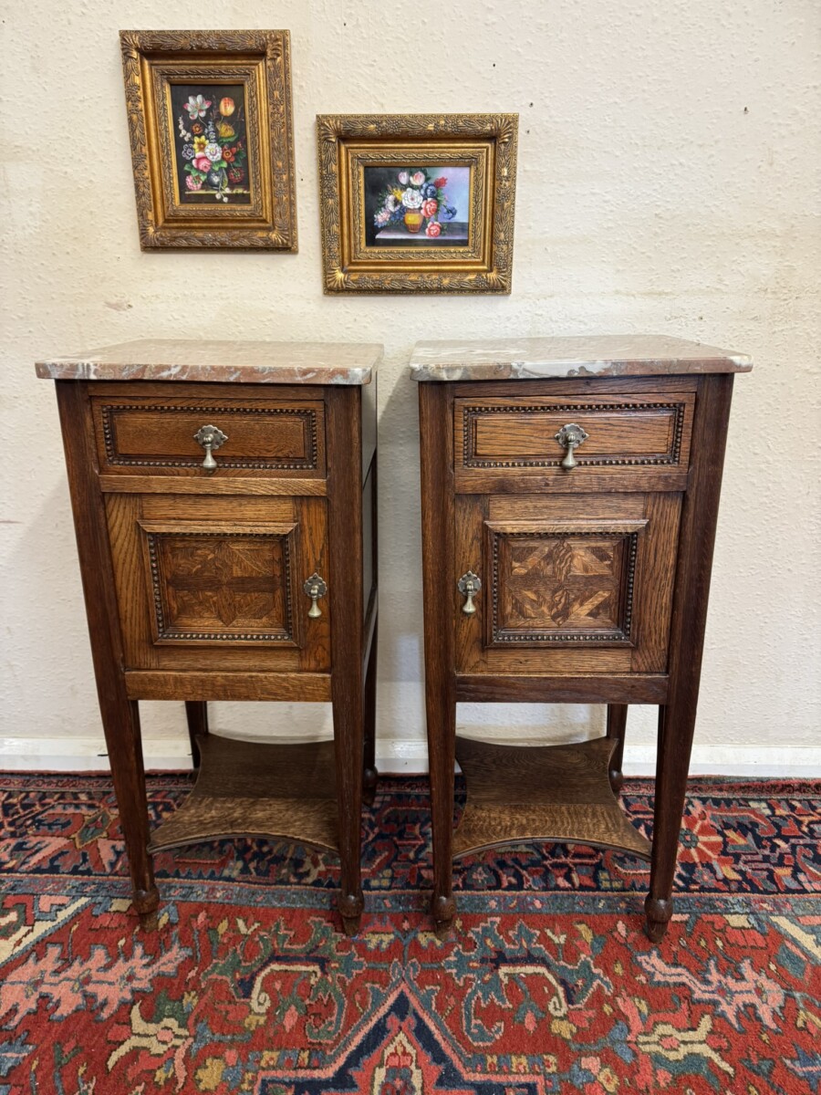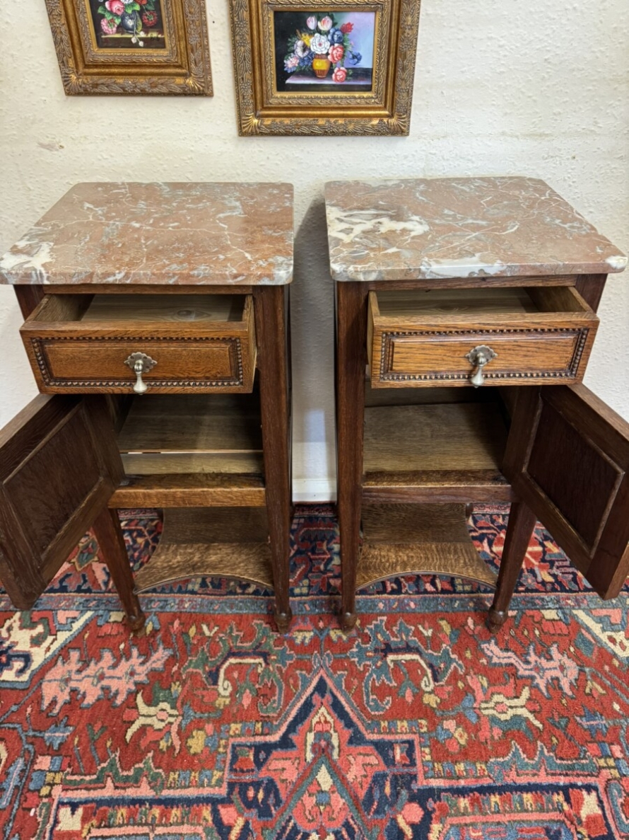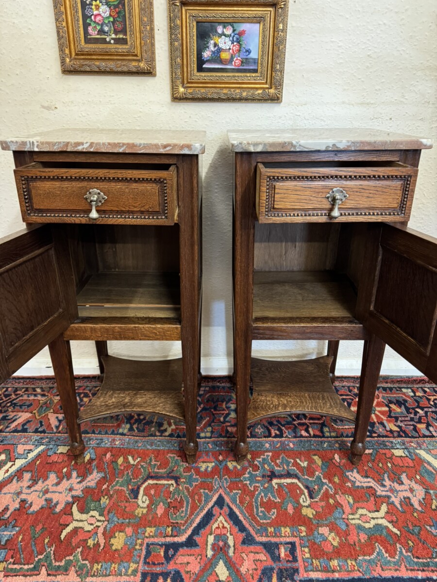 The oversailing marble top sits above a drawer, the drawer having a brass drop handle with carved decoration to the edge, below is a recessed panelled door, each door having a brass drop handle with a carved decoration. Shaped shelf below, recessed panelled sides and standing on four tapered legs with turned feet. The cabinets dates circa 1900.