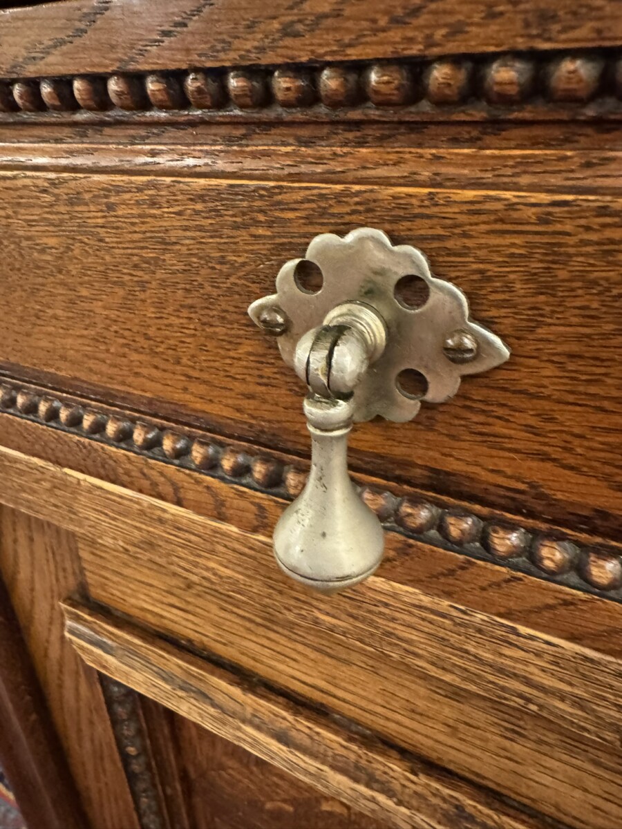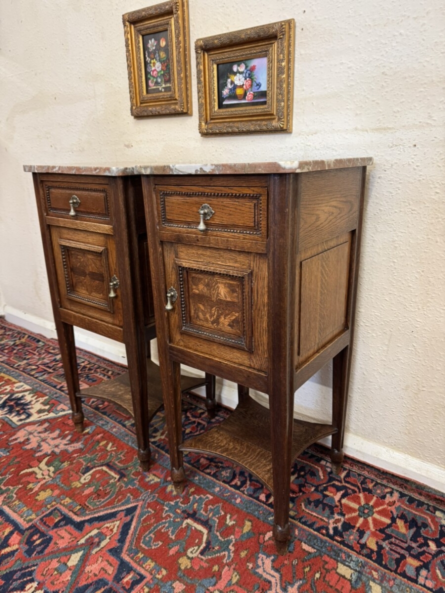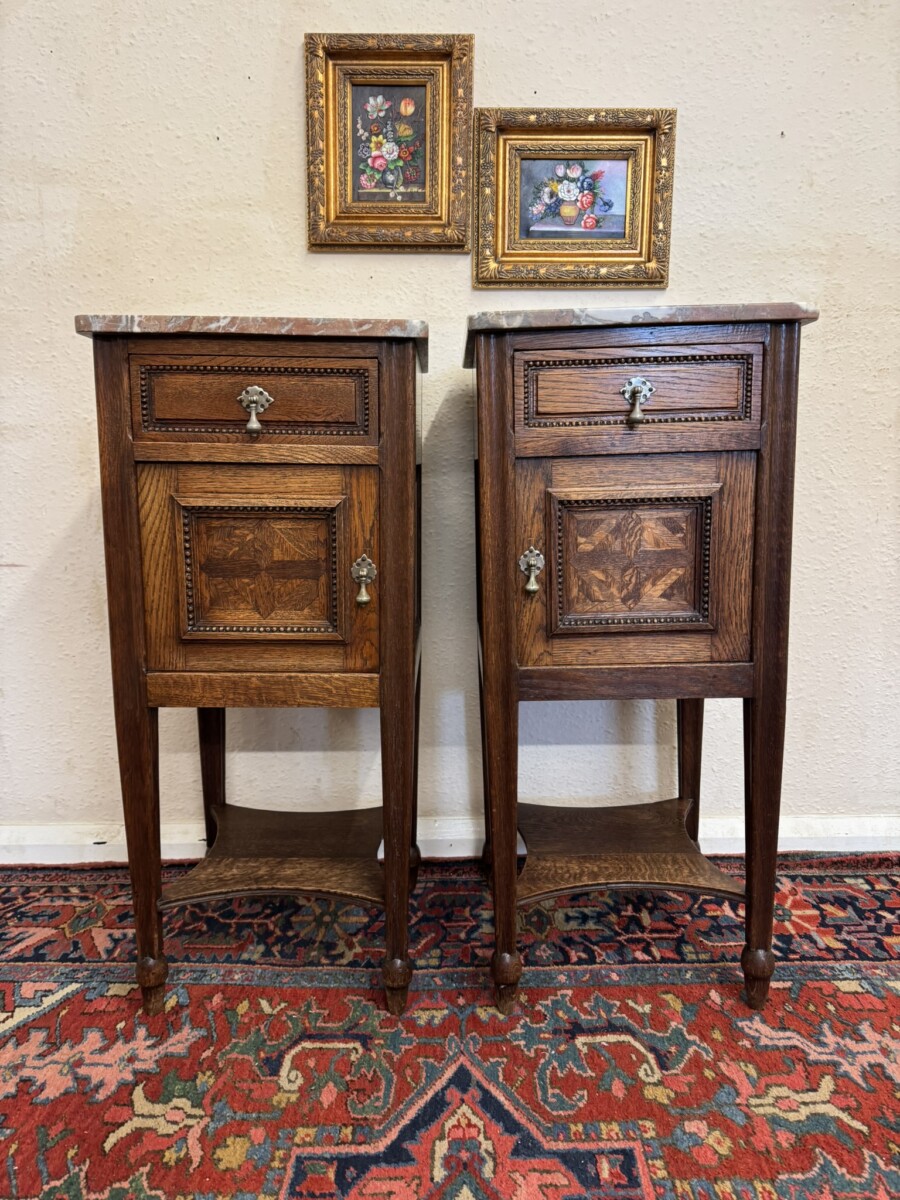 The oversailing marble top sits above a drawer, the drawer having a brass drop handle with carved decoration to the edge, below is a recessed panelled door, each door having a brass drop handle with a carved decoration. Shaped shelf below, recessed panelled sides and standing on four tapered legs with turned feet. The cabinets dates circa 1900.