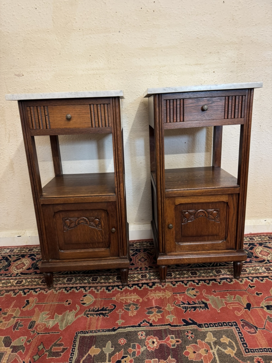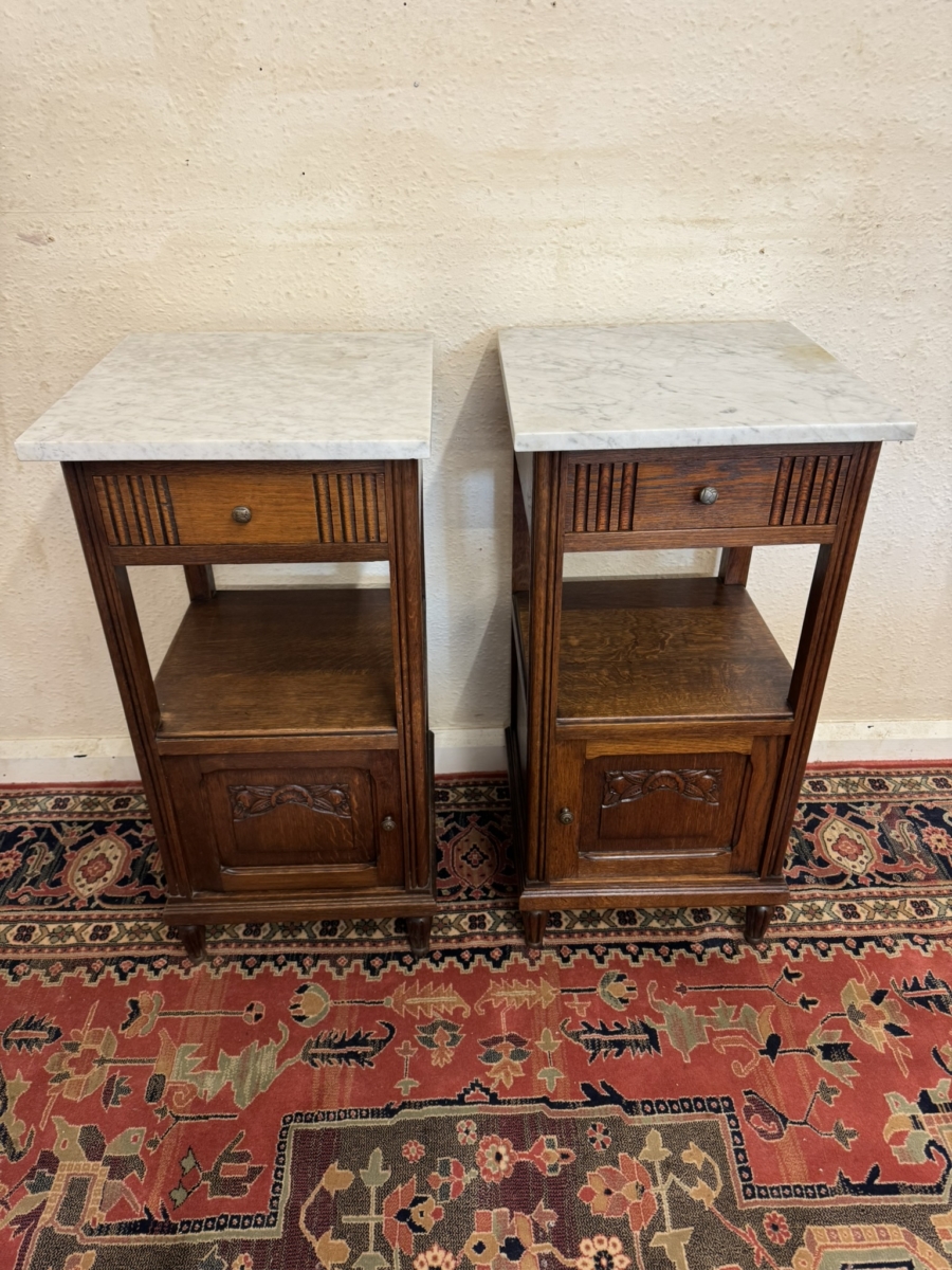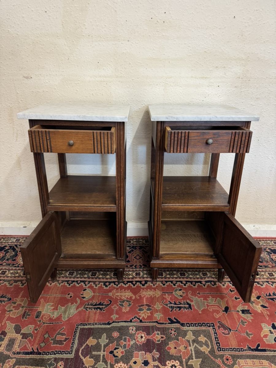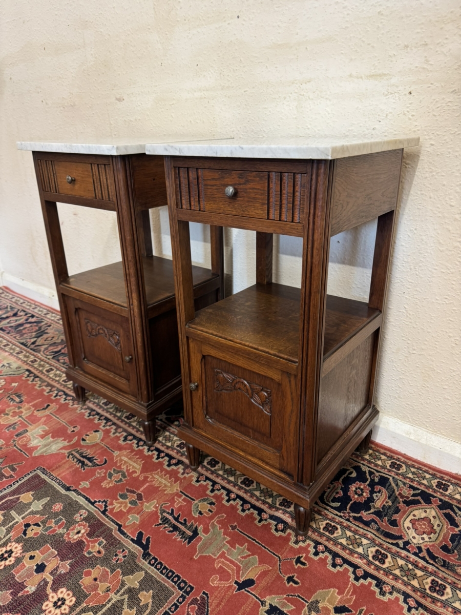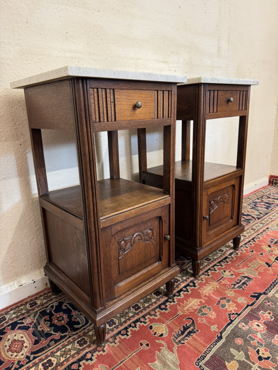 This beautiful pair of French cabinets date circa 1920. Each cabinet having a marble top, carved drawer with brass button handle, shelf, carved recessed panelled door which opens to offer a storage space and standing on reeded turned feet.