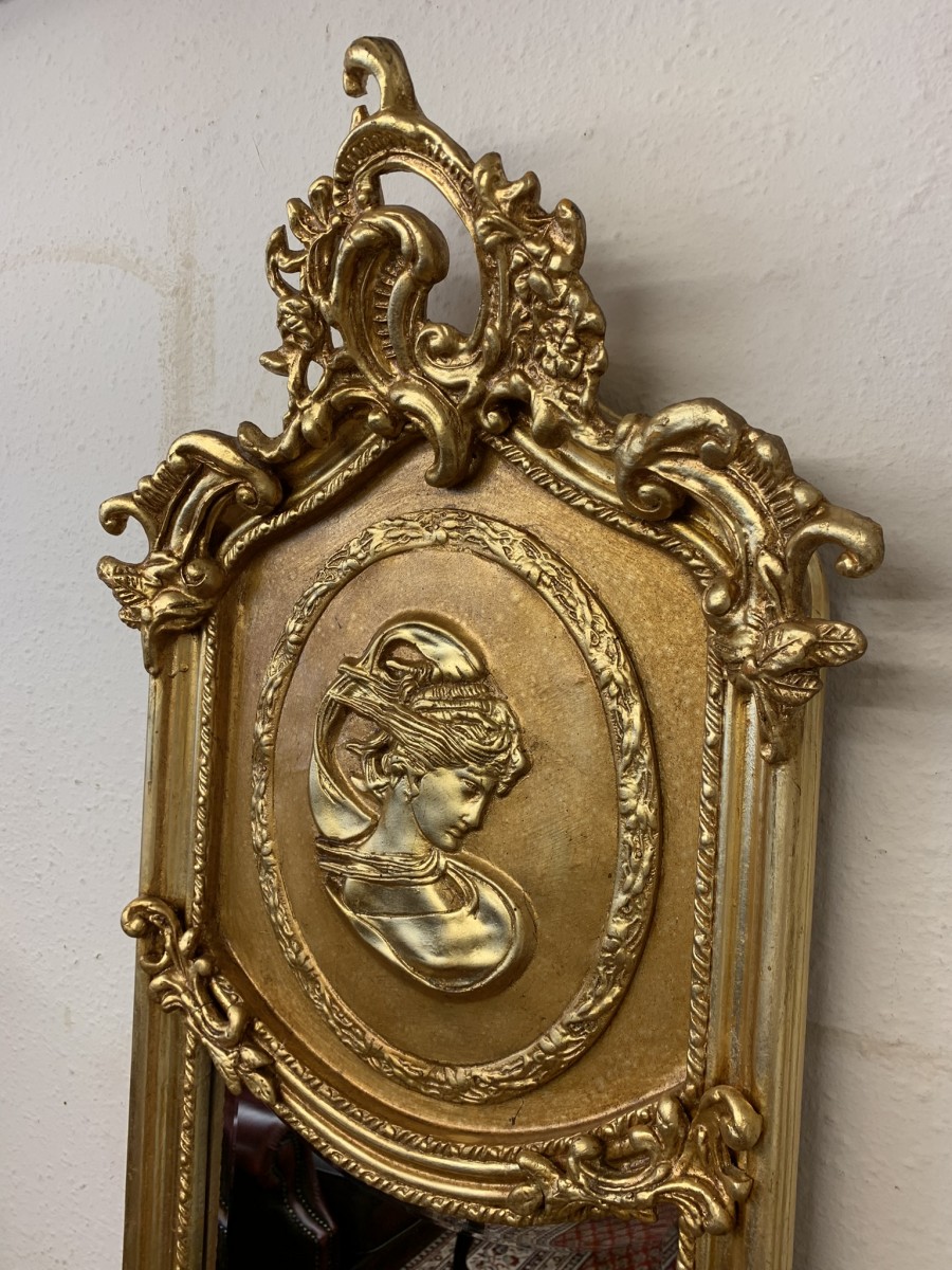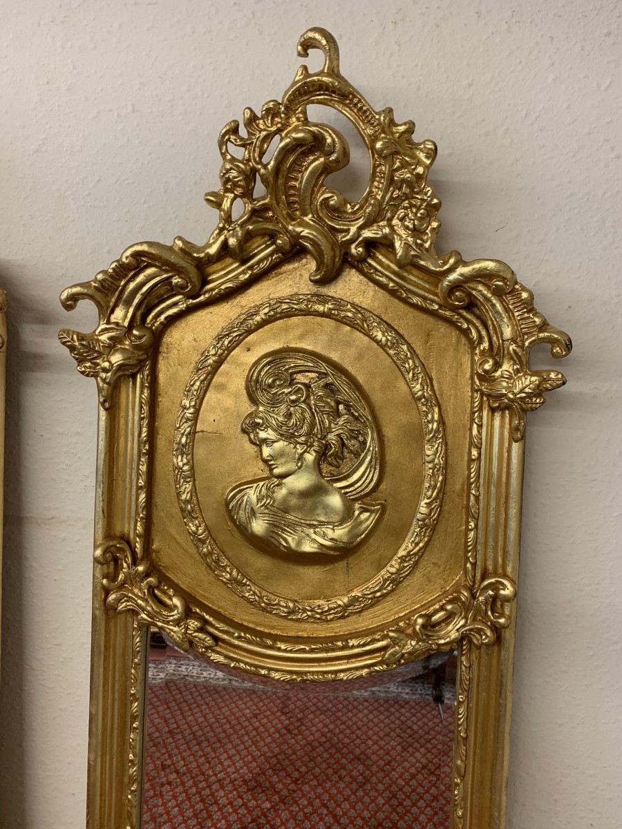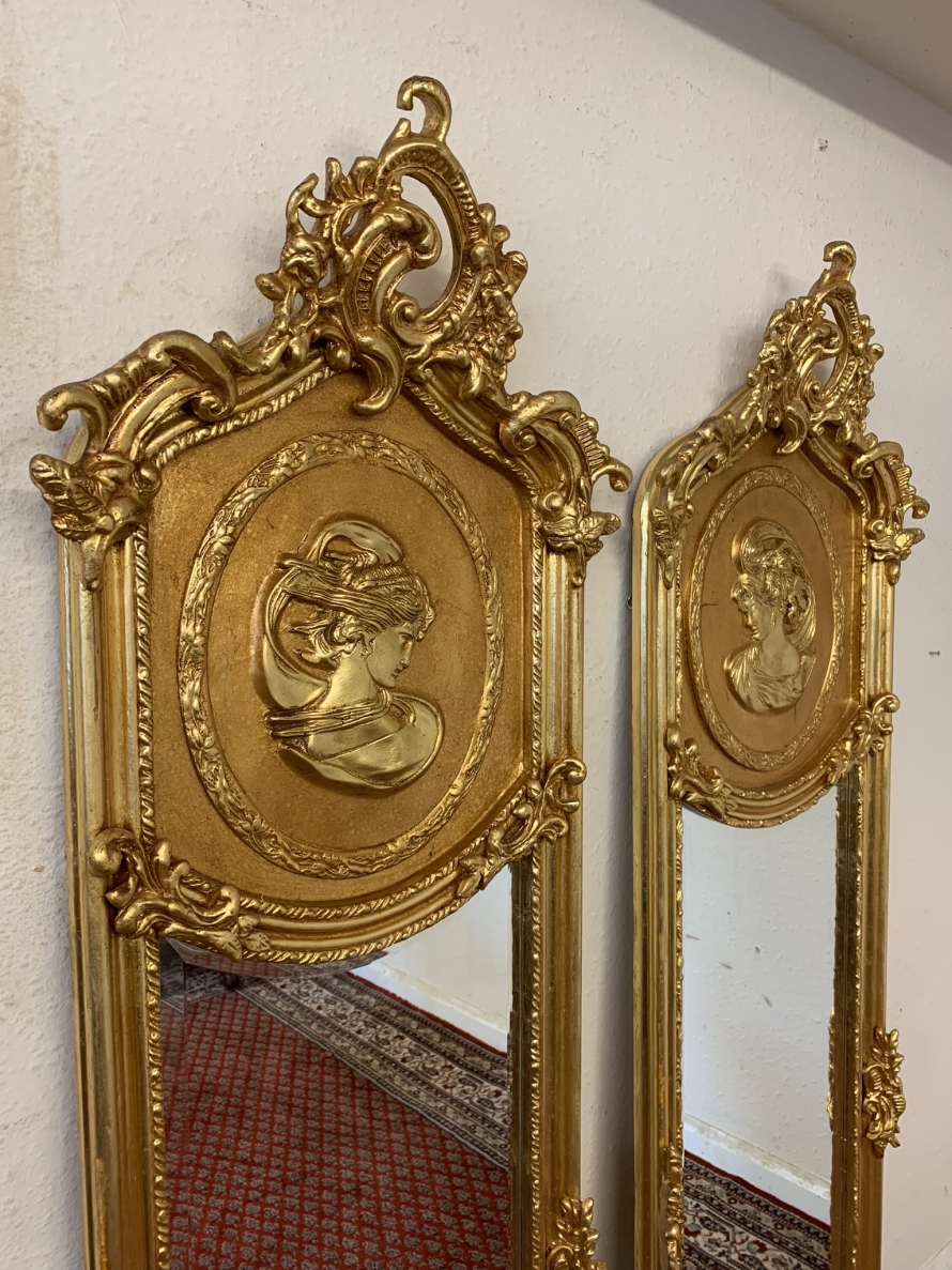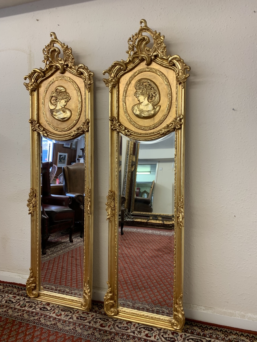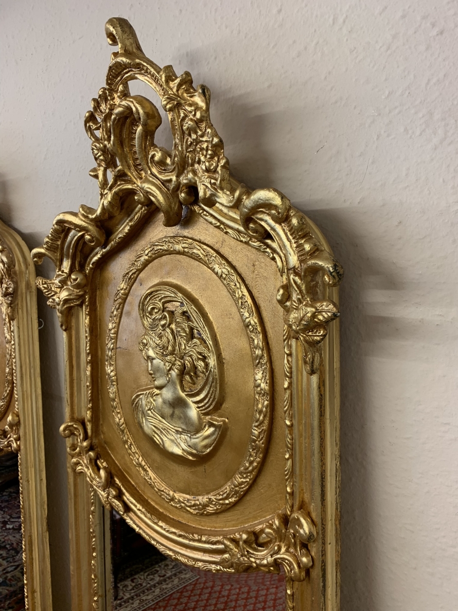 Each shaped bevel edge mirror has a cameo decoration. Above is beautifully ornate shaped carving. Carved guilt decoration throughout.