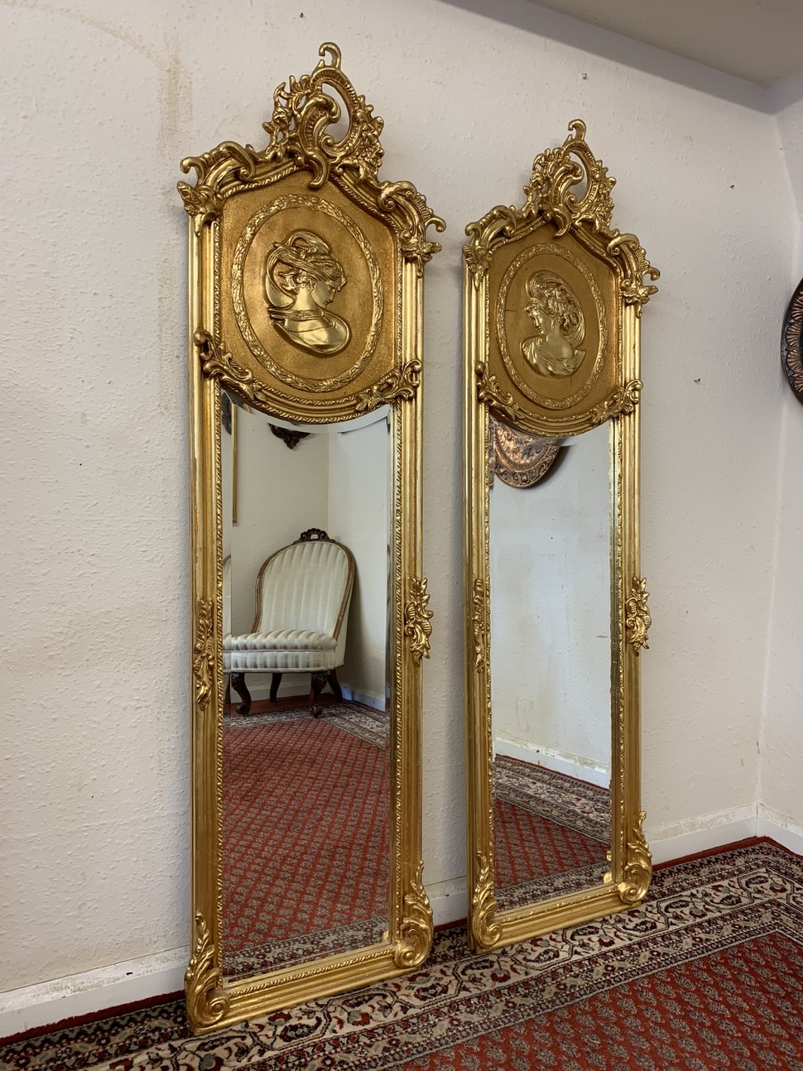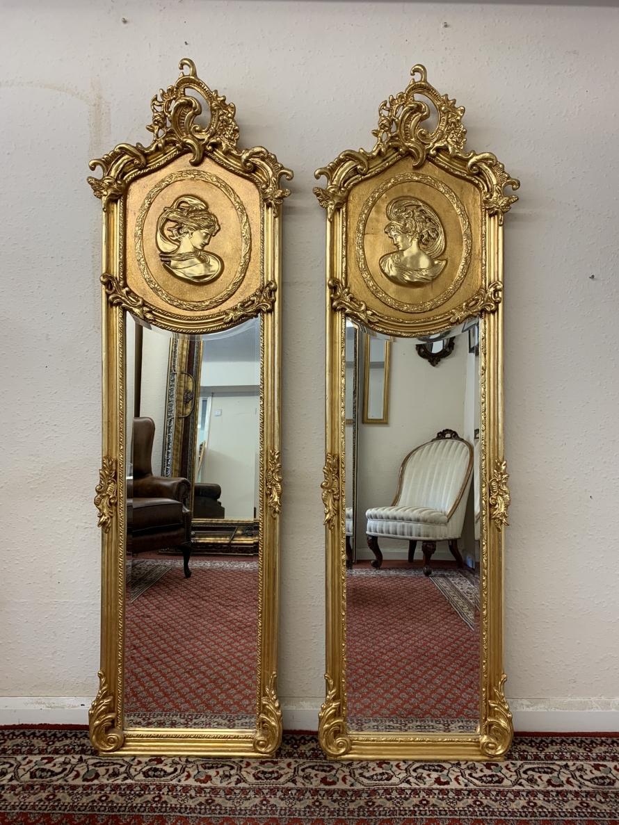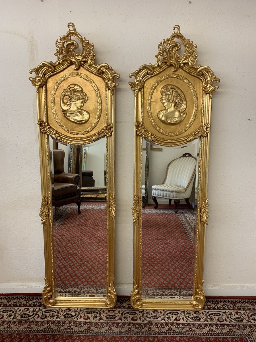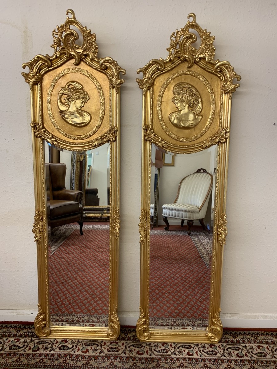 Each shaped bevel edge mirror has a cameo decoration. Above is beautifully ornate shaped carving. Carved guilt decoration throughout.