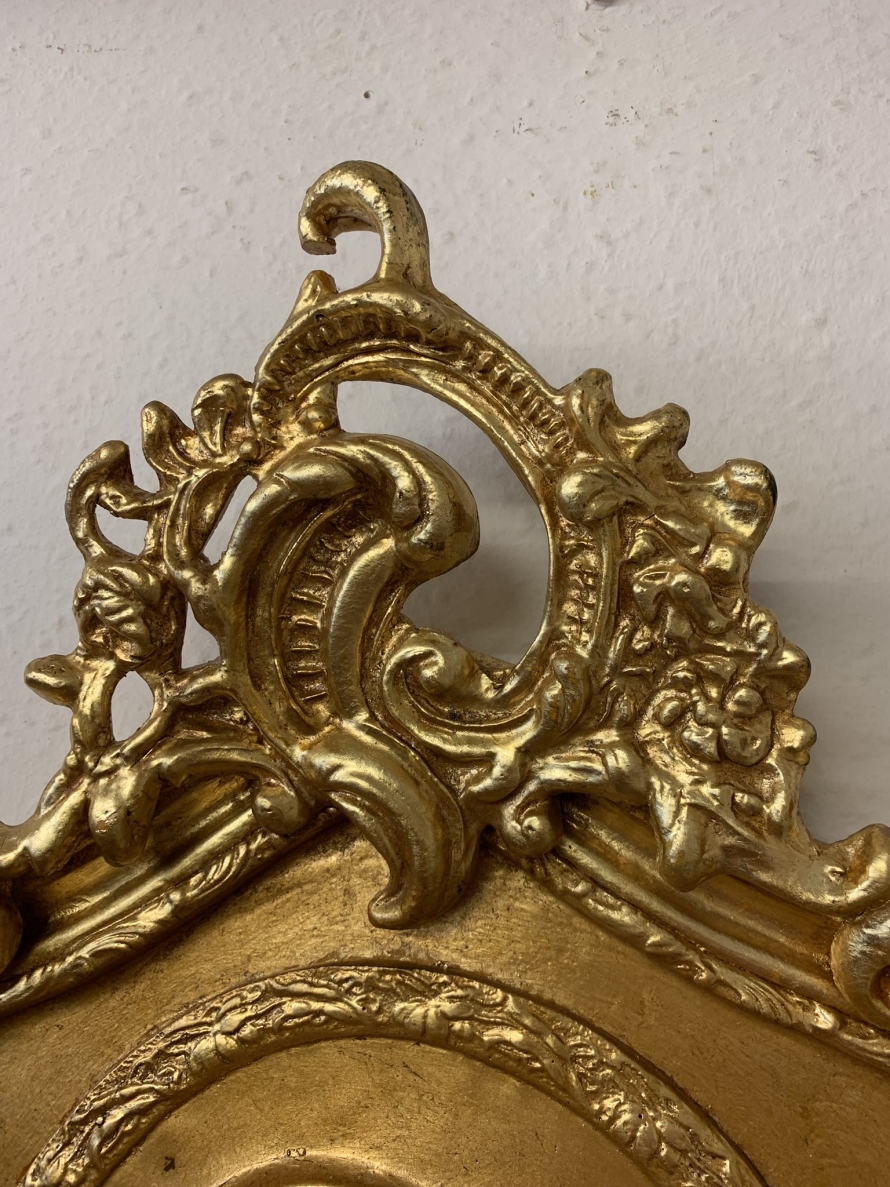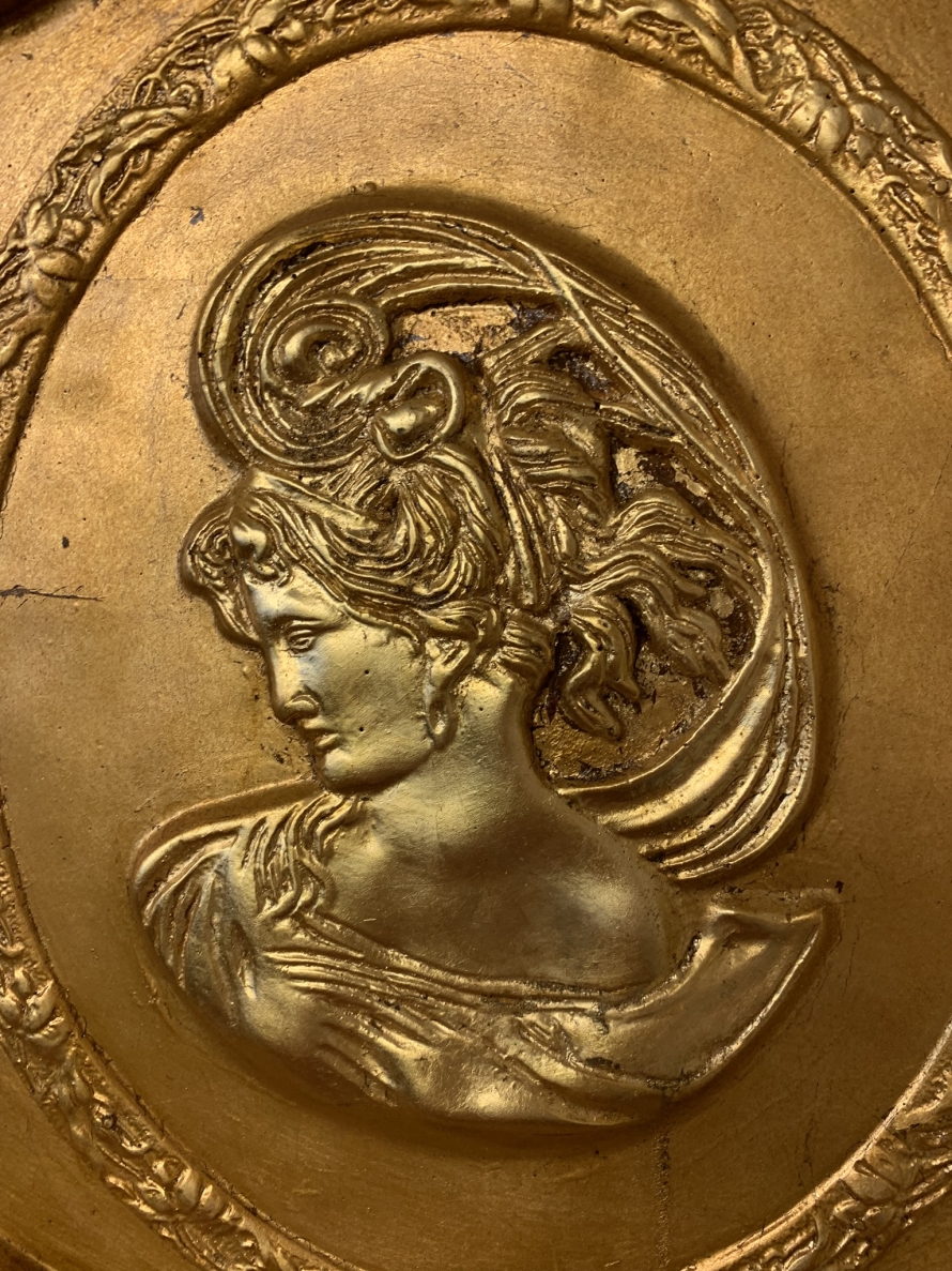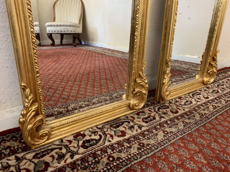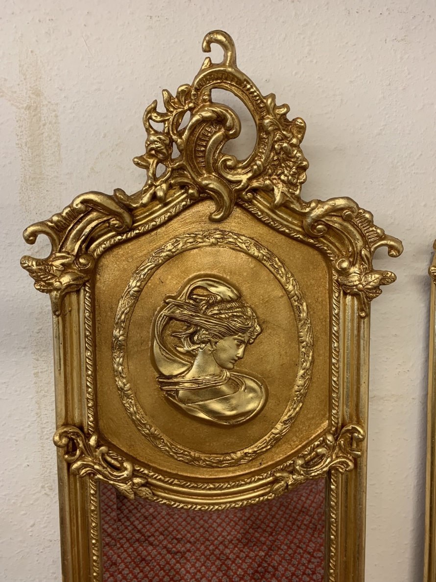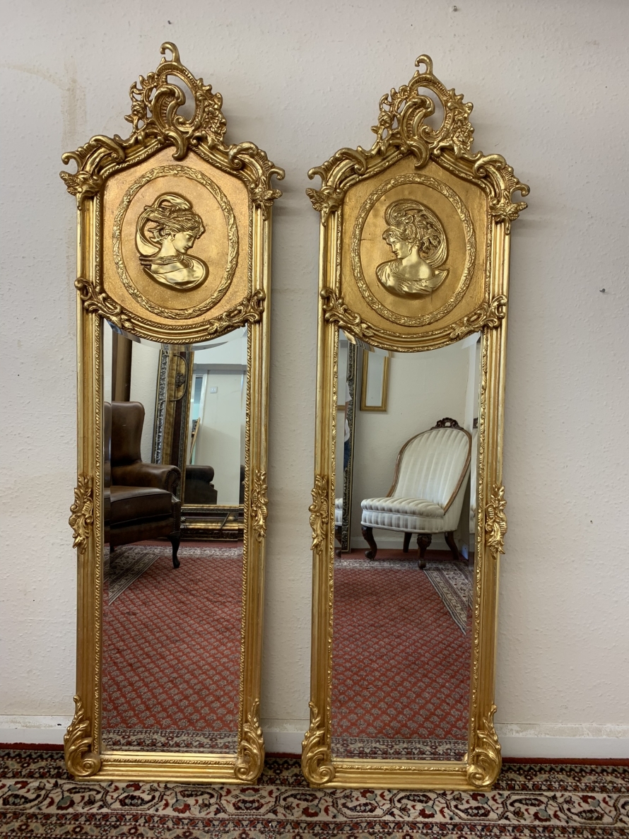 Each shaped bevel edge mirror has a cameo decoration. Above is beautifully ornate shaped carving. Carved guilt decoration throughout.
