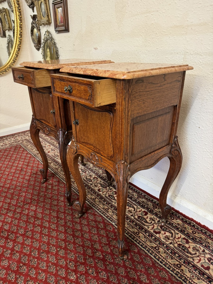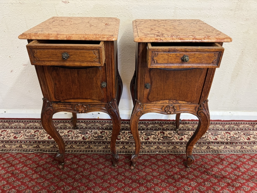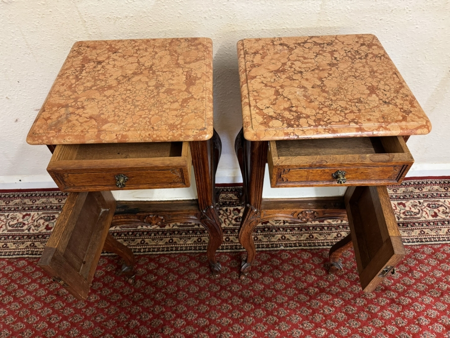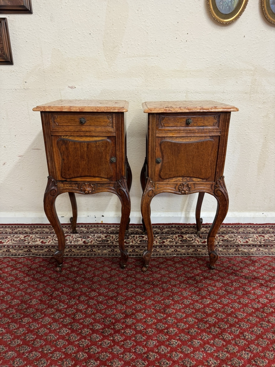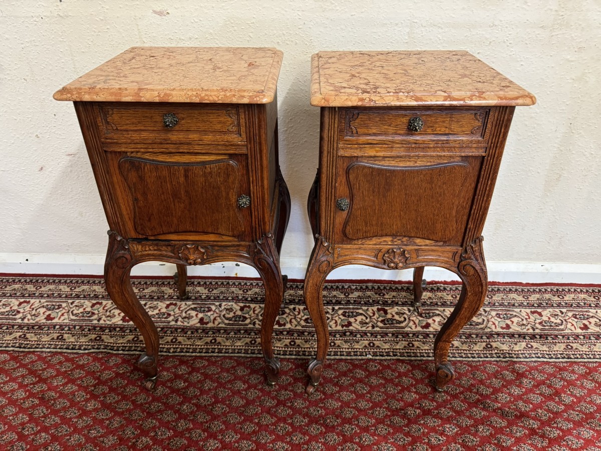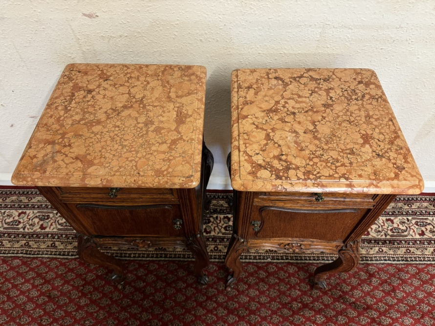 - Fabulous Pair Of French Carved Oak Marble Top Bedside Cabinets Circa 1890