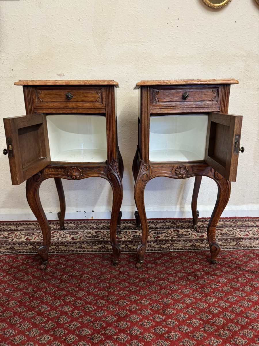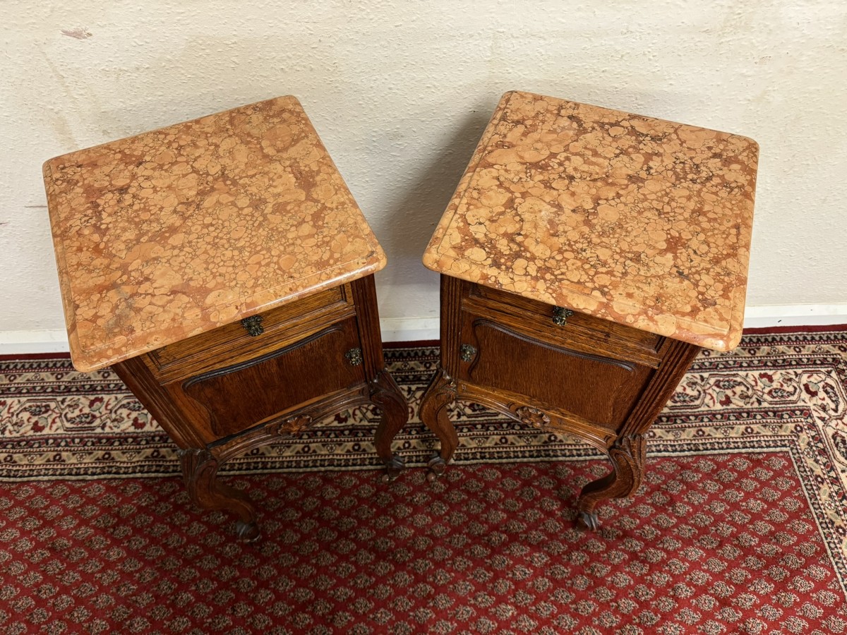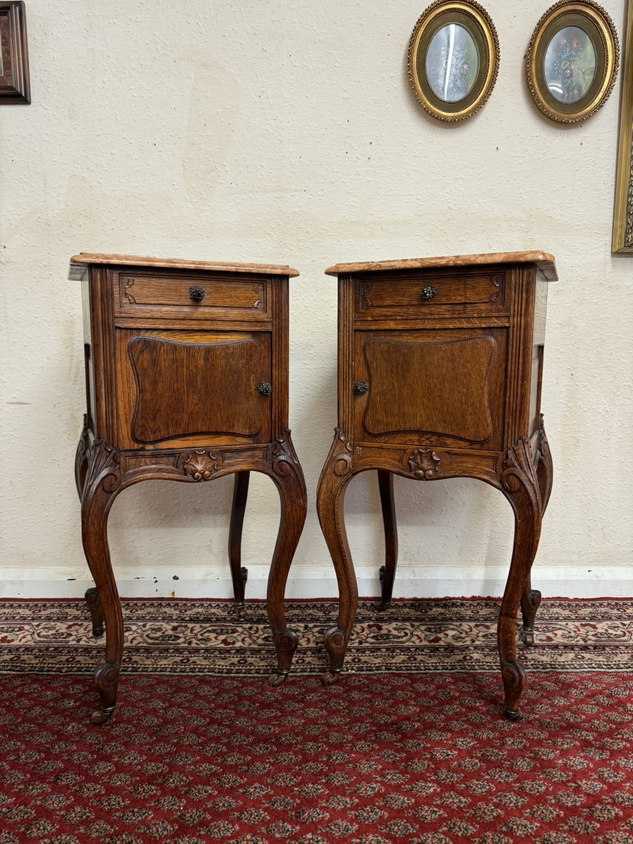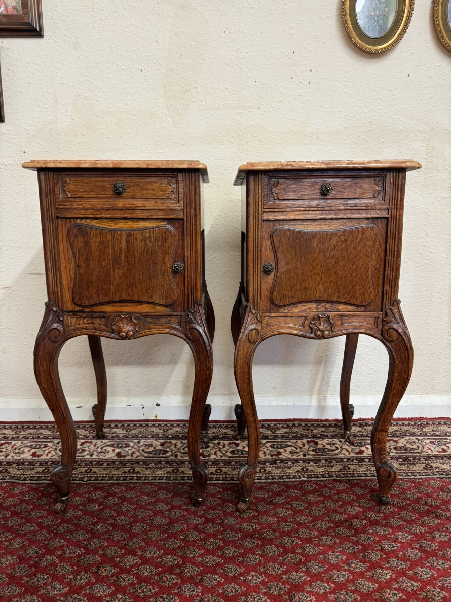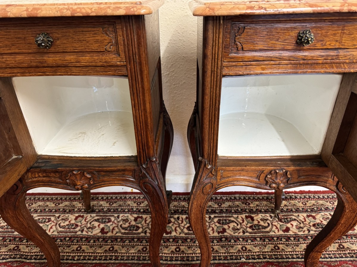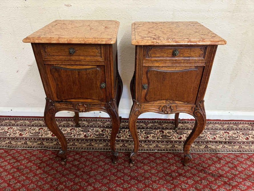- Fabulous Pair Of French Carved Oak Marble Top Bedside Cabinets Circa 1890