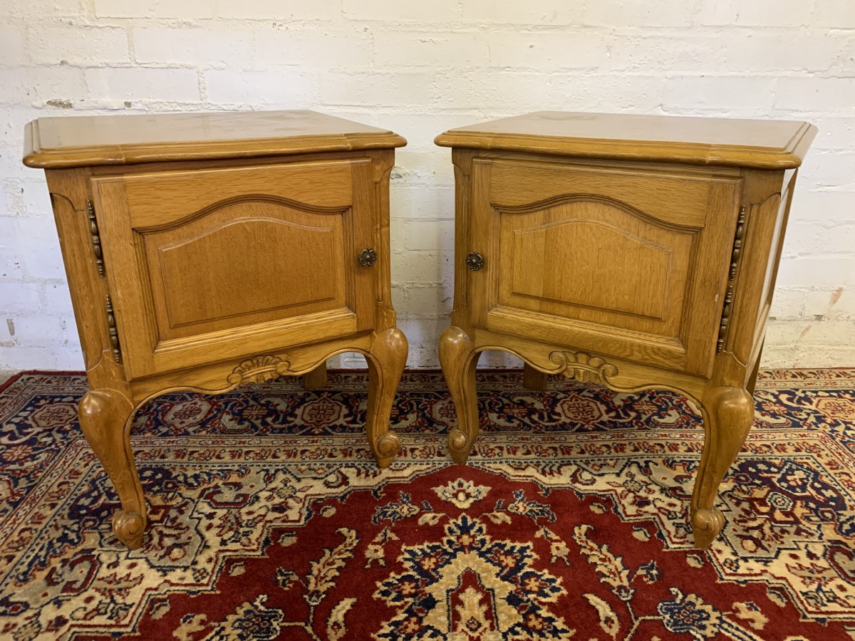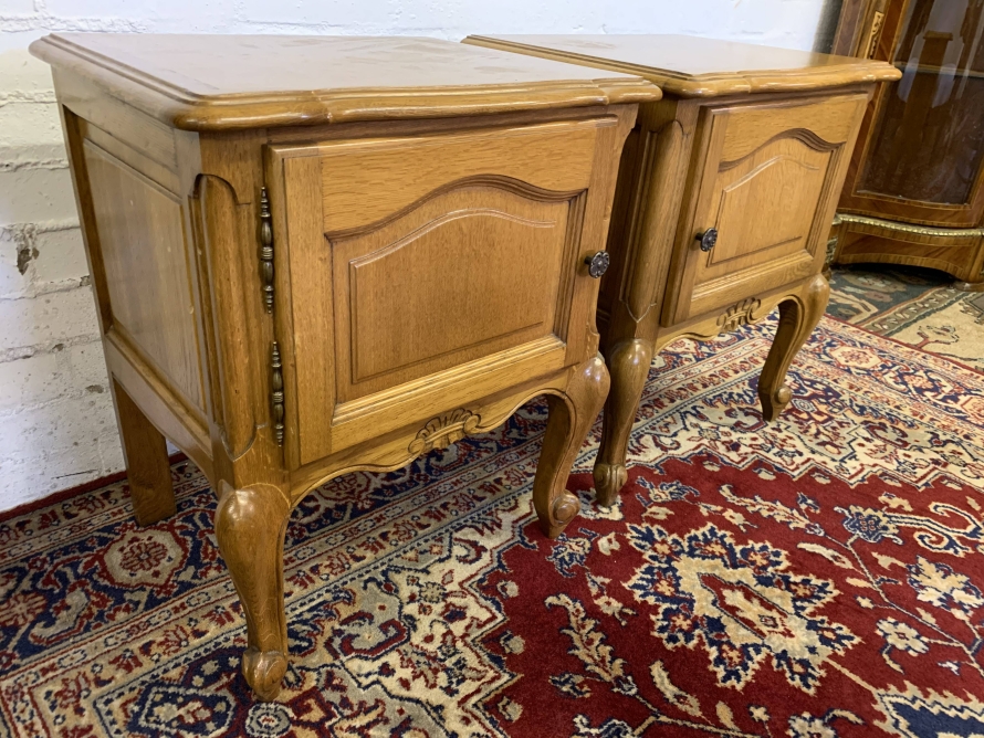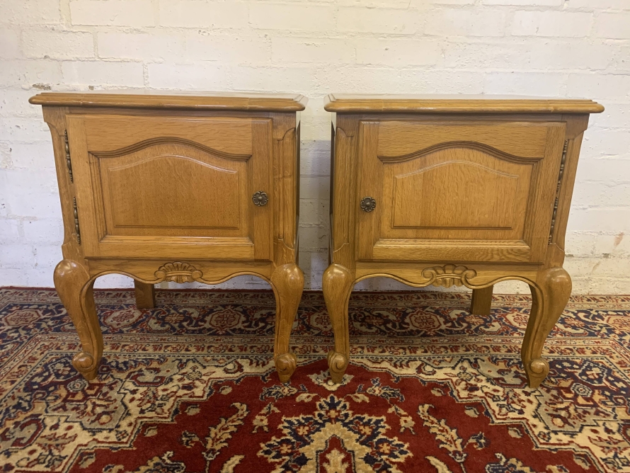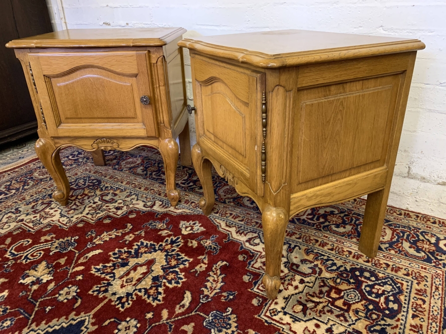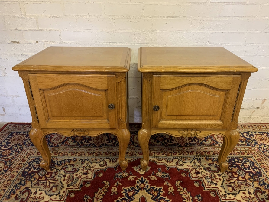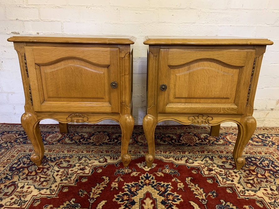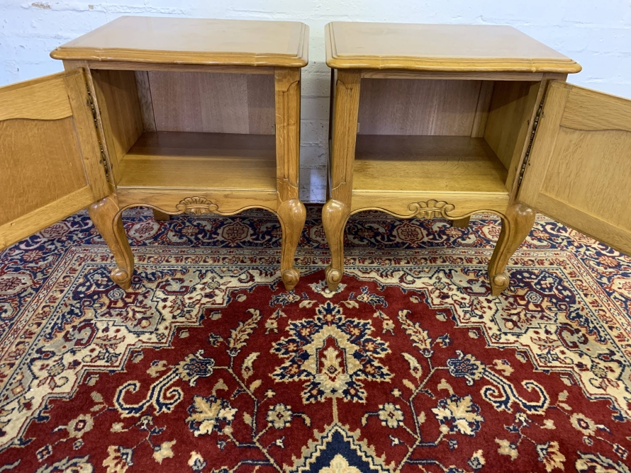 Each cabinet has a shaped oversailing top which sits above a shaped recessed panelled door, each door having brass hinges and ornate brass handle. The doors open to reveal a storage area. Recessed panelled sides shaped skirt with decorative central carving each cabinet stands on two carved cabriole shaped legs to the front.
