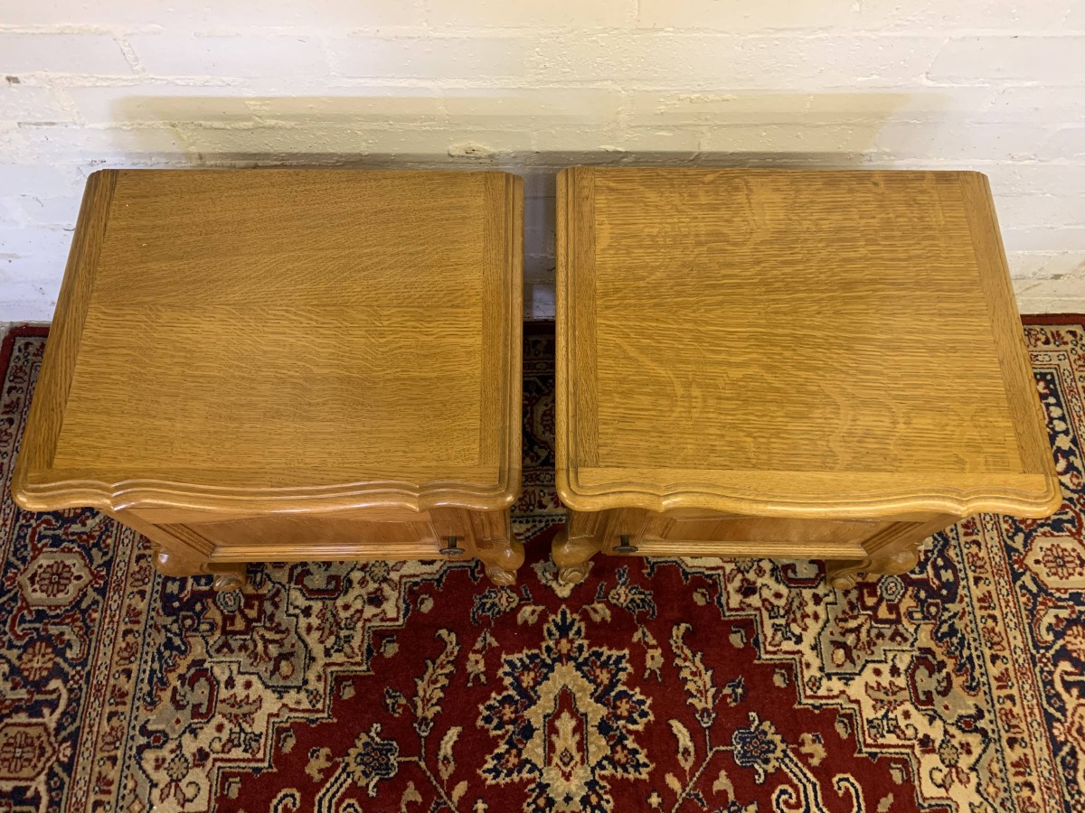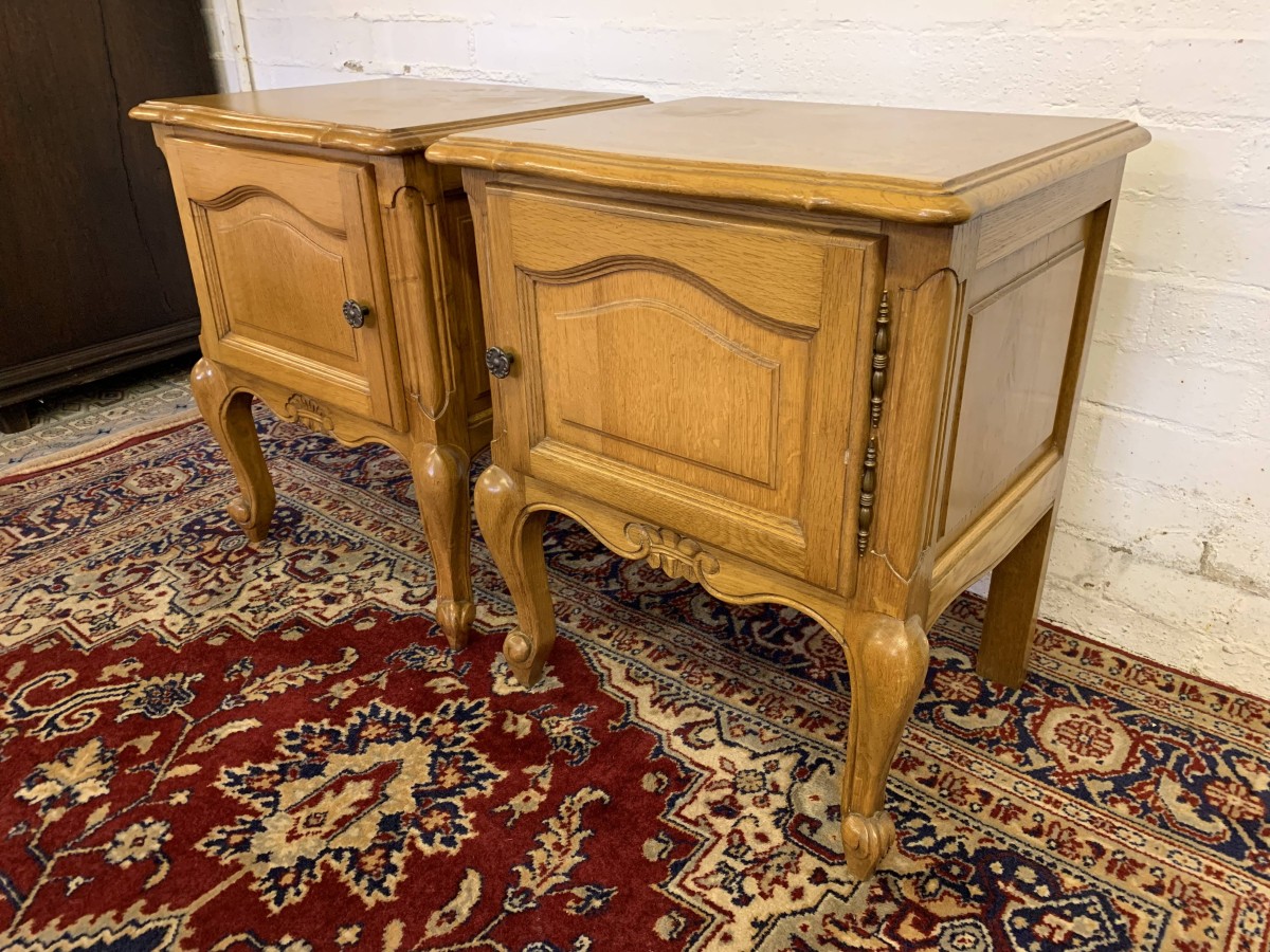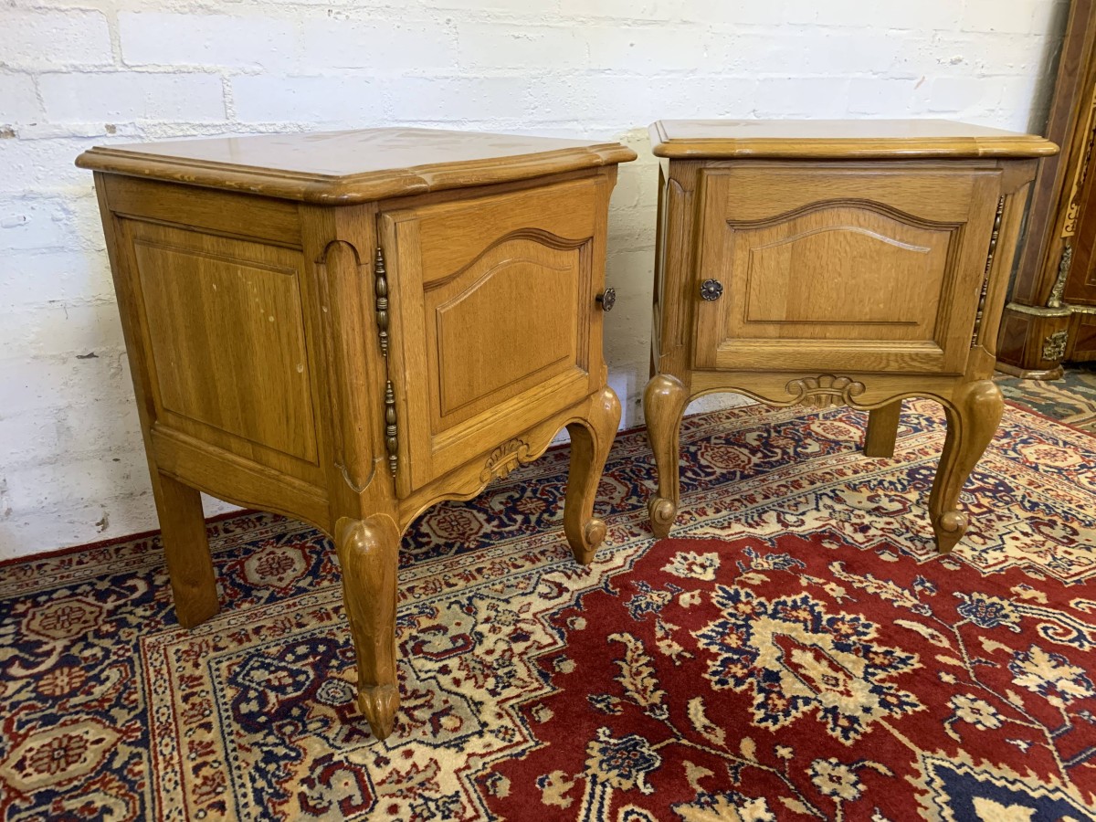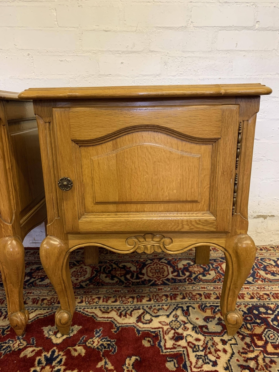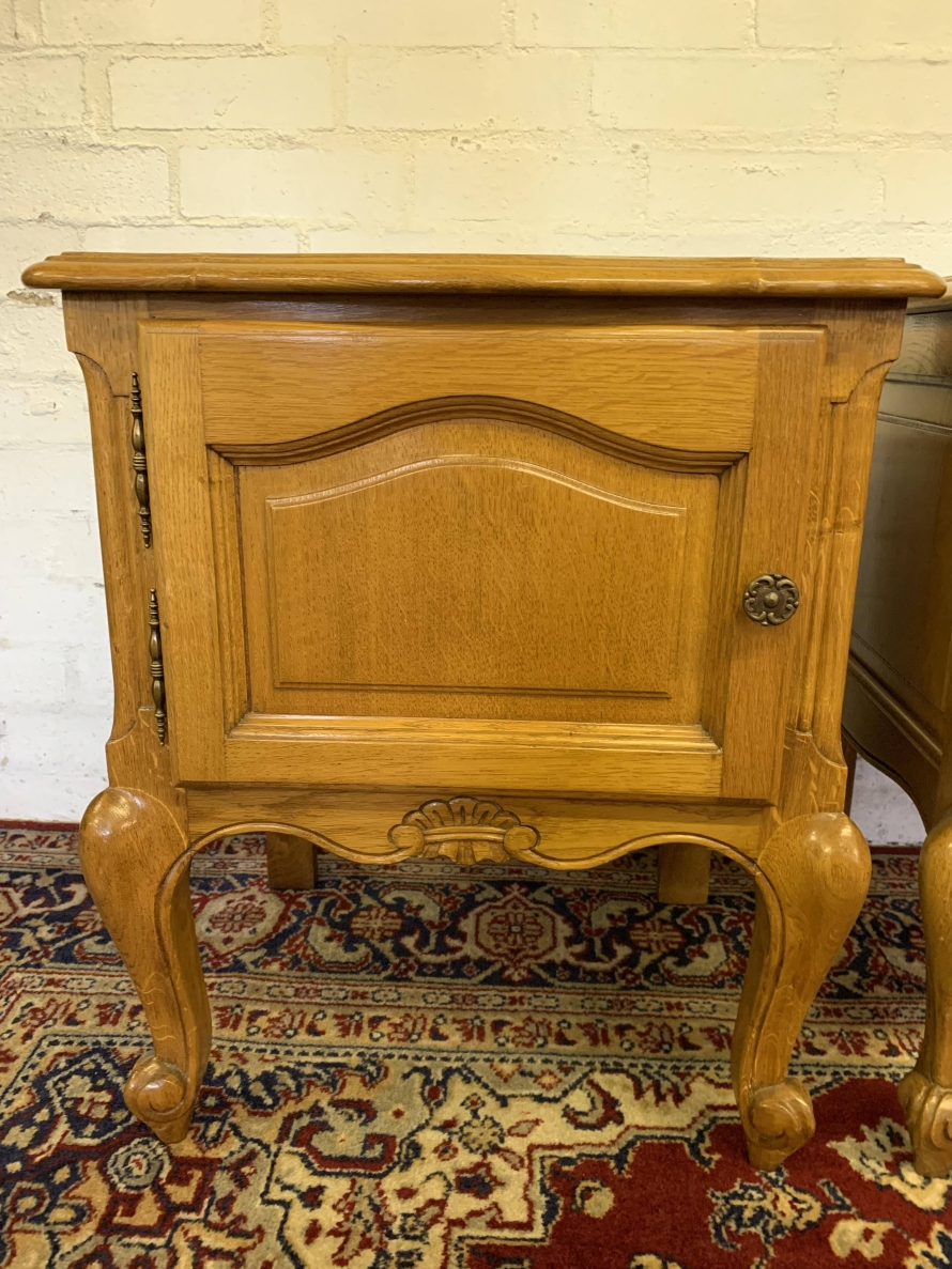 Each cabinet has a shaped oversailing top which sits above a shaped recessed panelled door, each door having brass hinges and ornate brass handle. The doors open to reveal a storage area. Recessed panelled sides shaped skirt with decorative central carving each cabinet stands on two carved cabriole shaped legs to the front.