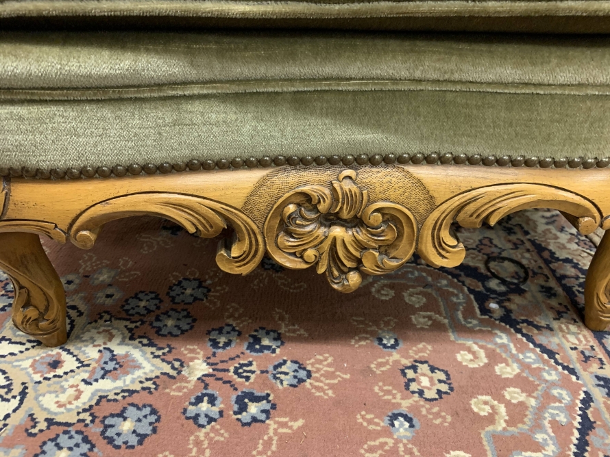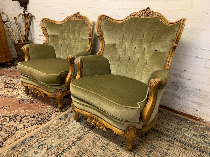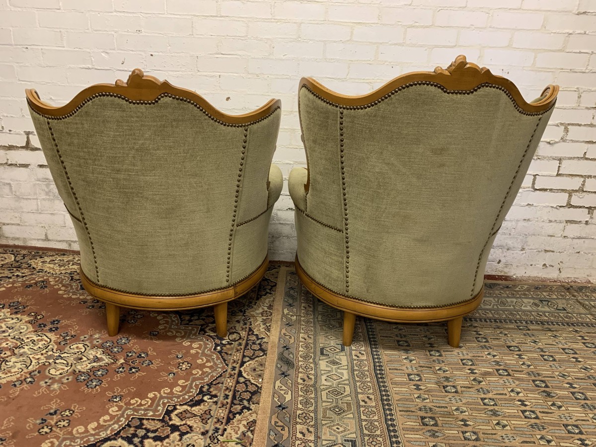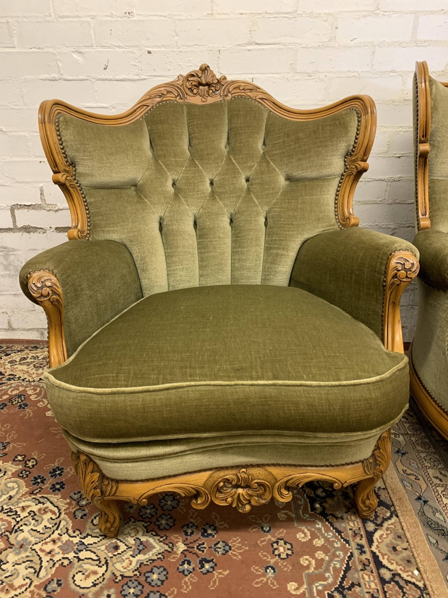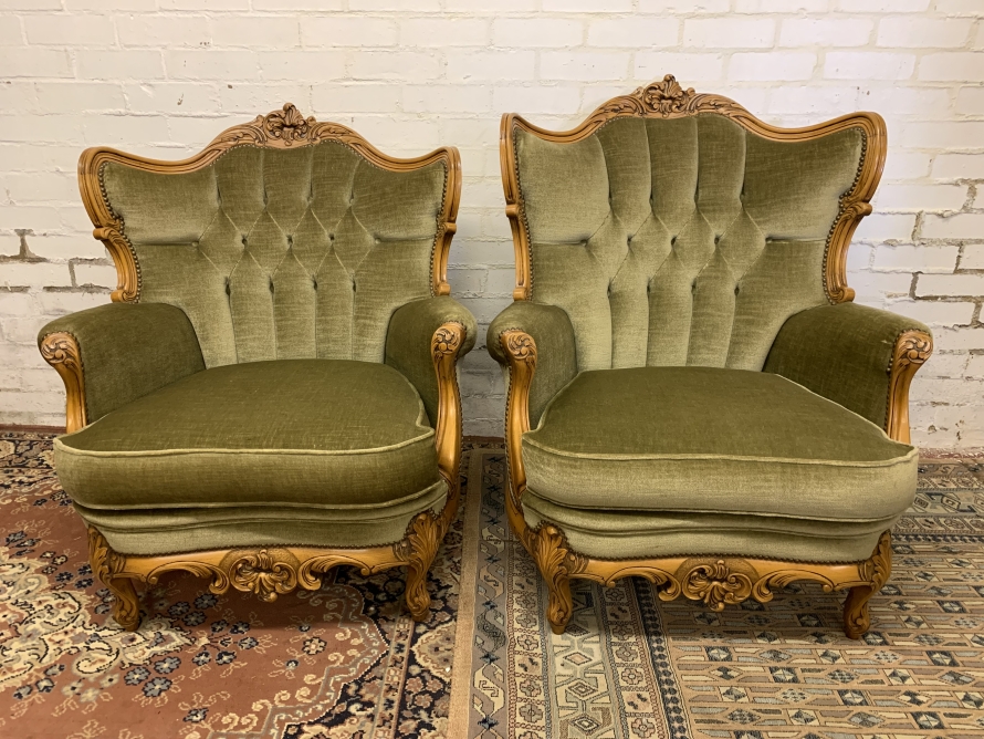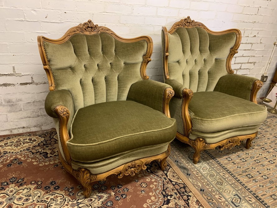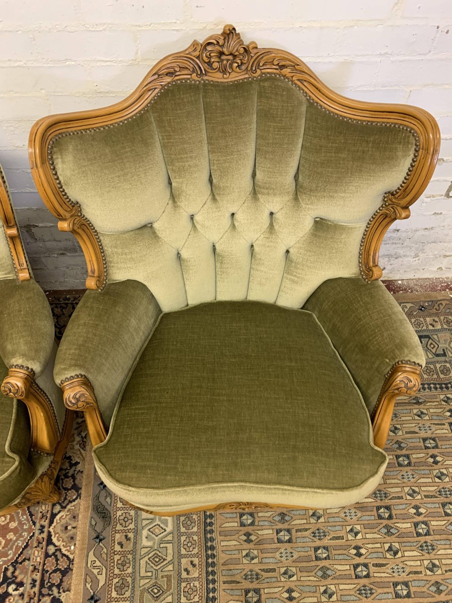 This fantastic pair of French his and hers armchairs are in excellent condition. Having a shaped back rising to a central decorative carving, buttoned upholstered back and arms having brass studding, carved arms, removable seat cushion. The front has a beautiful central carving , the chairs stand on carved cabriole legs to the front.