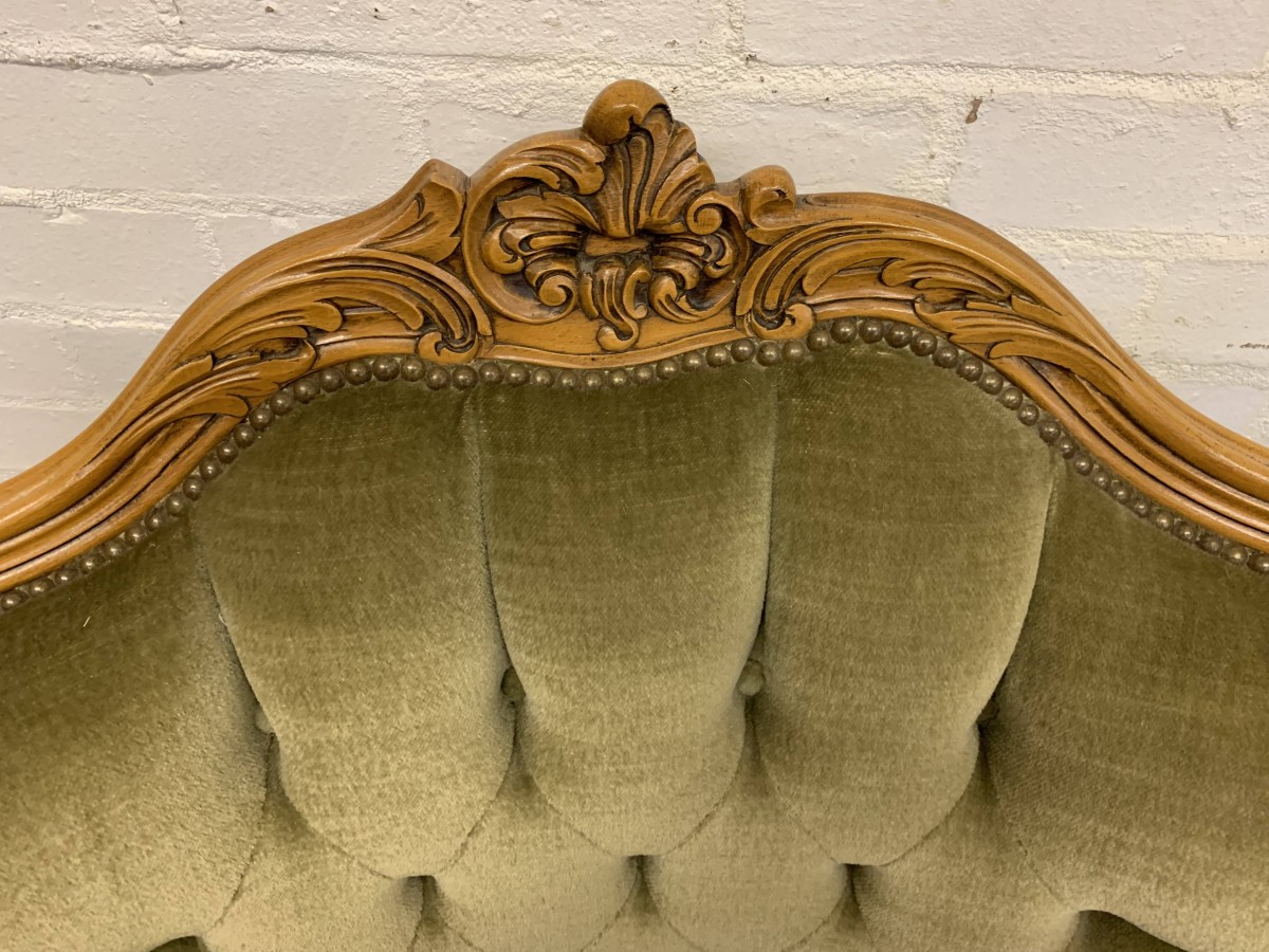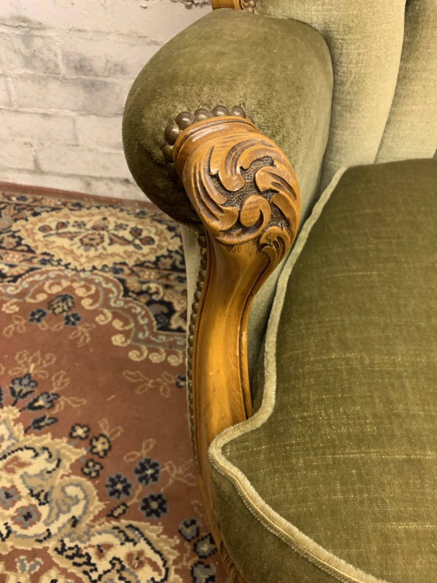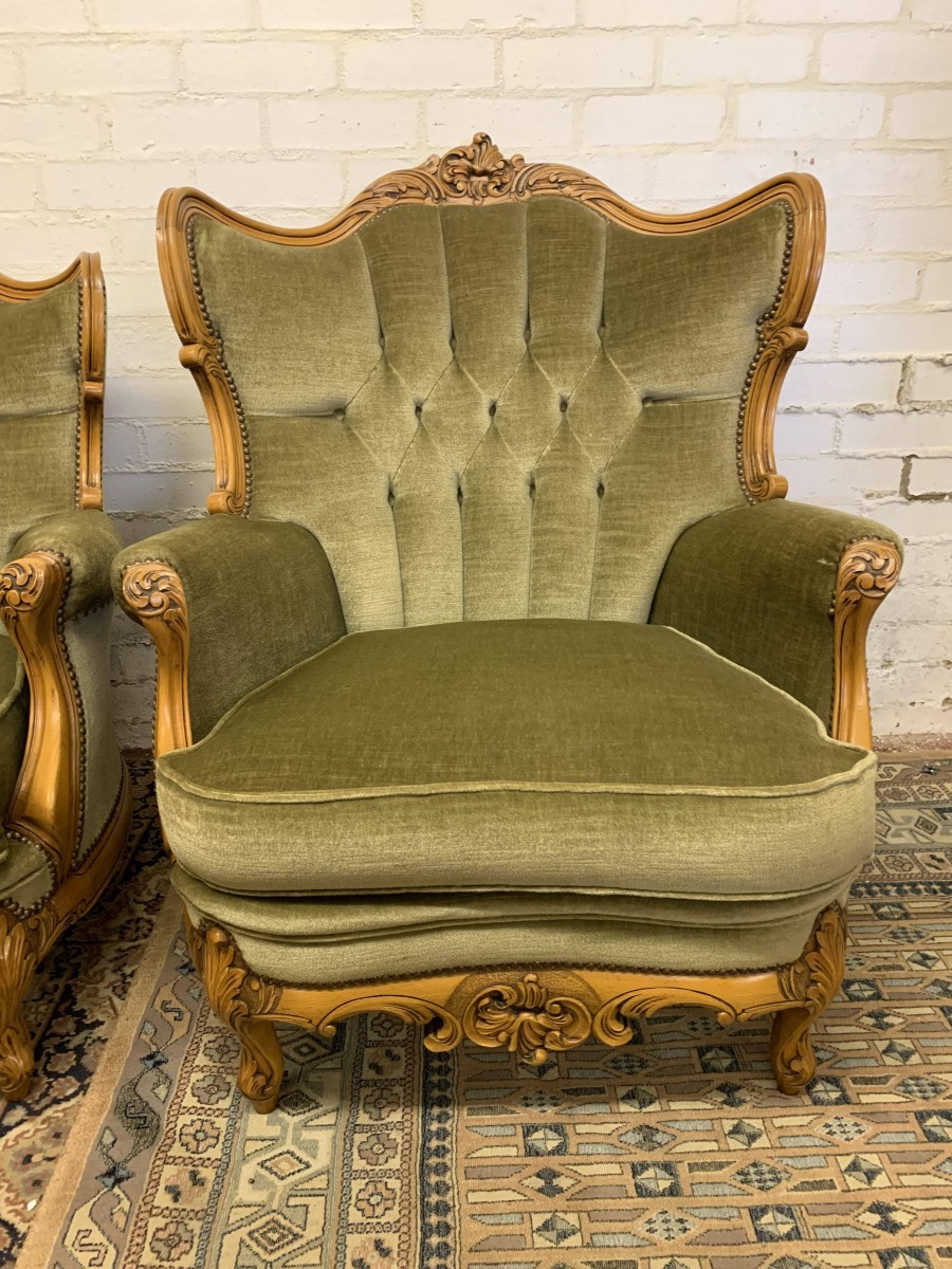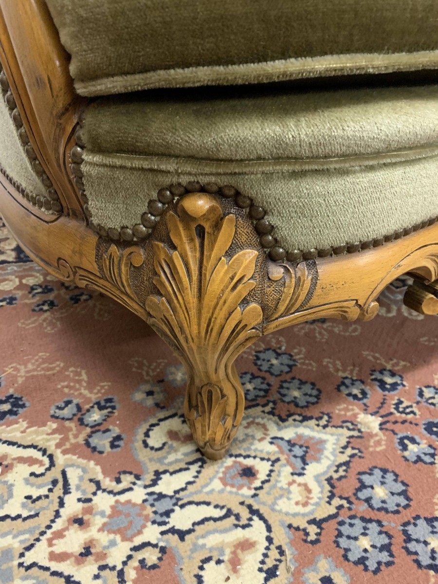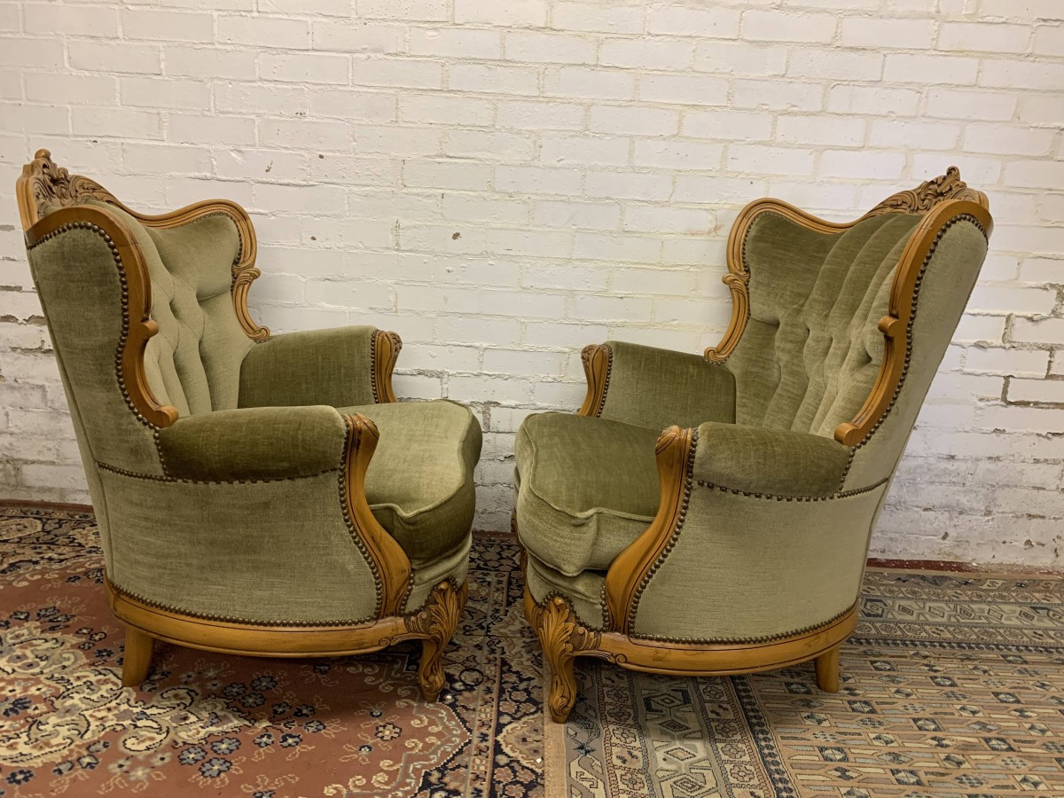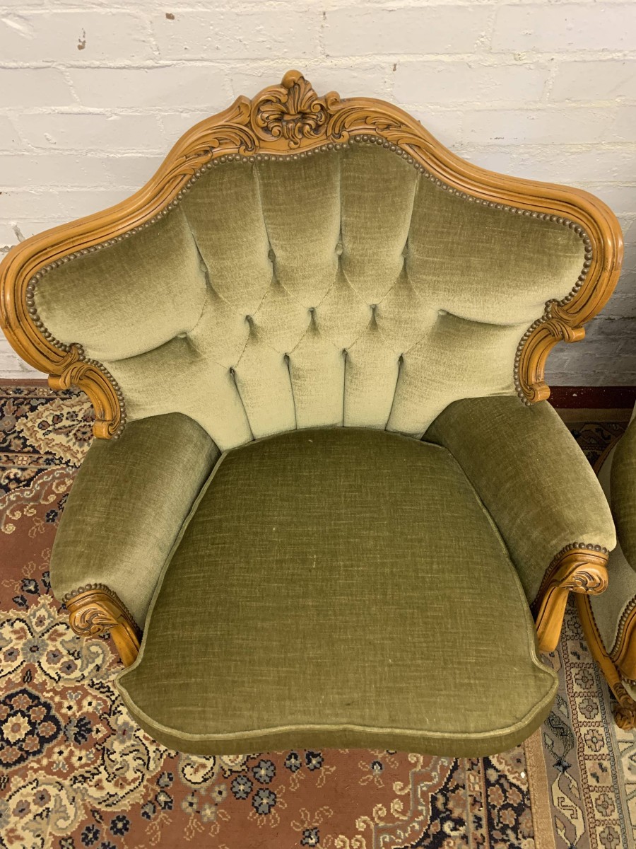 This fantastic pair of French his and hers armchairs are in excellent condition. Having a shaped back rising to a central decorative carving, buttoned upholstered back and arms having brass studding, carved arms, removable seat cushion. The front has a beautiful central carving , the chairs stand on carved cabriole legs to the front.