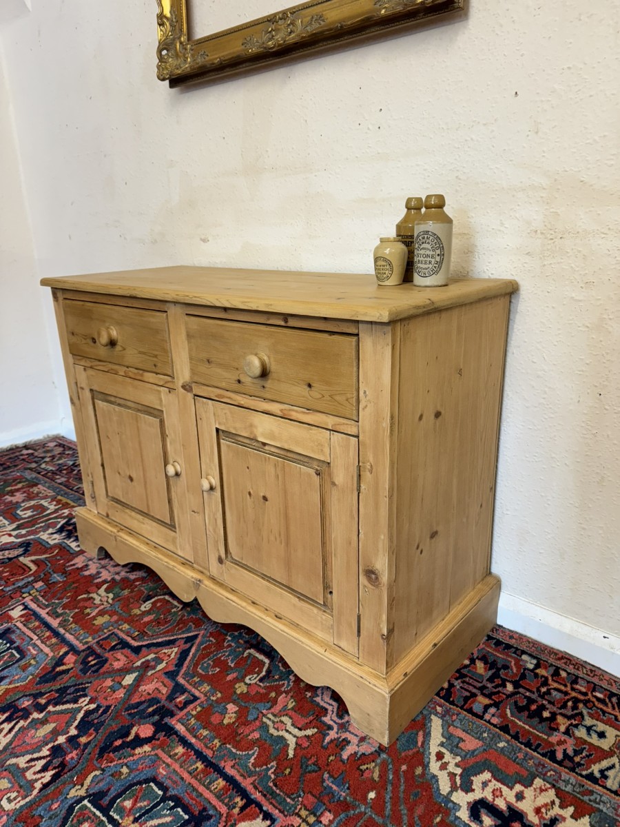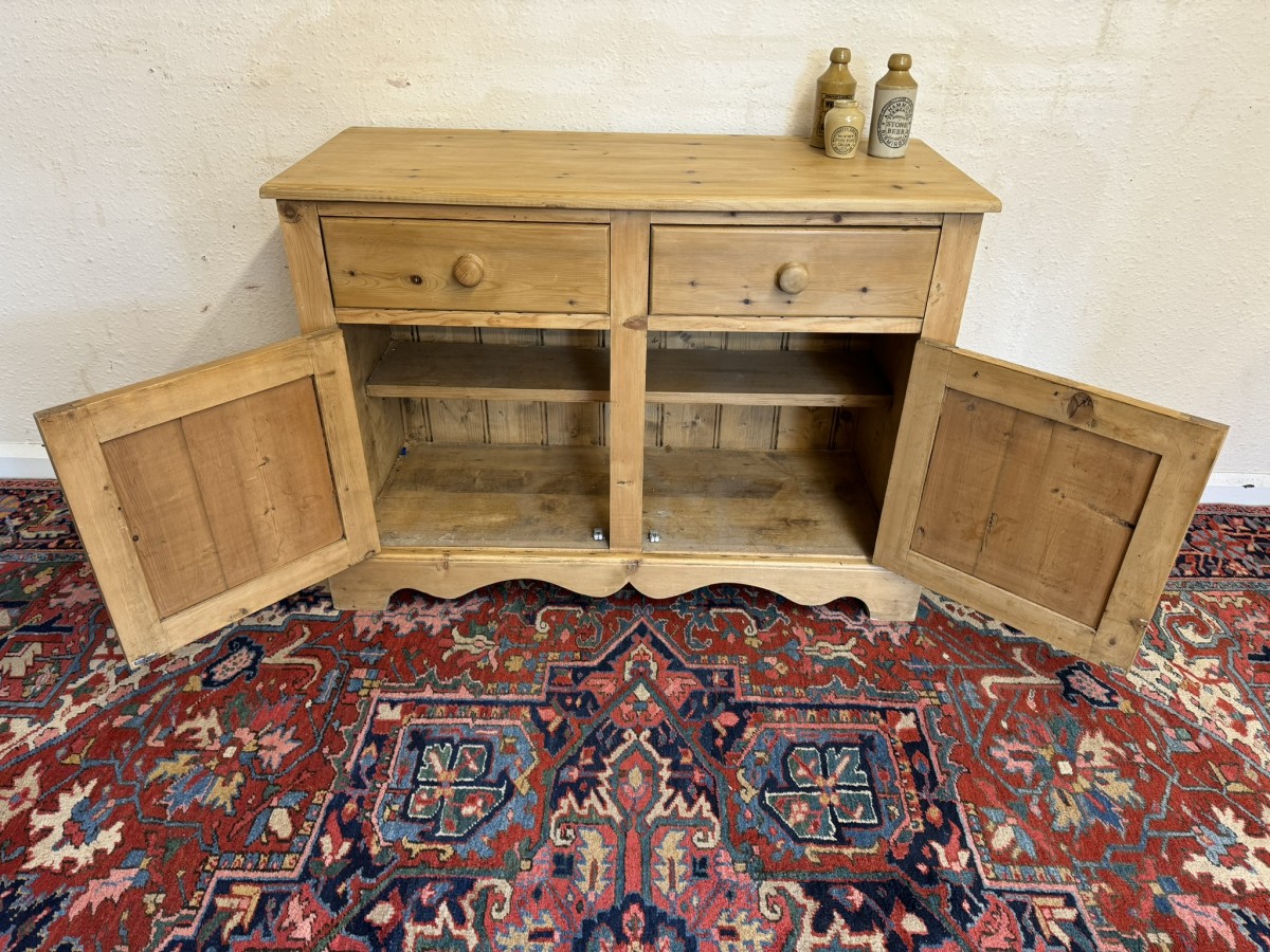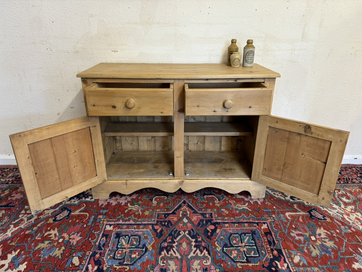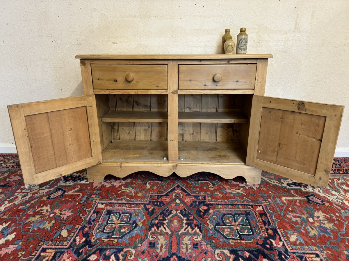 This fabulous pine cupboard is in excellent condition. The oversailing top sits above two drawers, each drawer having a turned knob handle. Below are a pair of fielded panelled cupboard doors, each door having a turned knob handle. The doors open to reveal a fixed wooden shelf. Shaped skirt with a platform base.