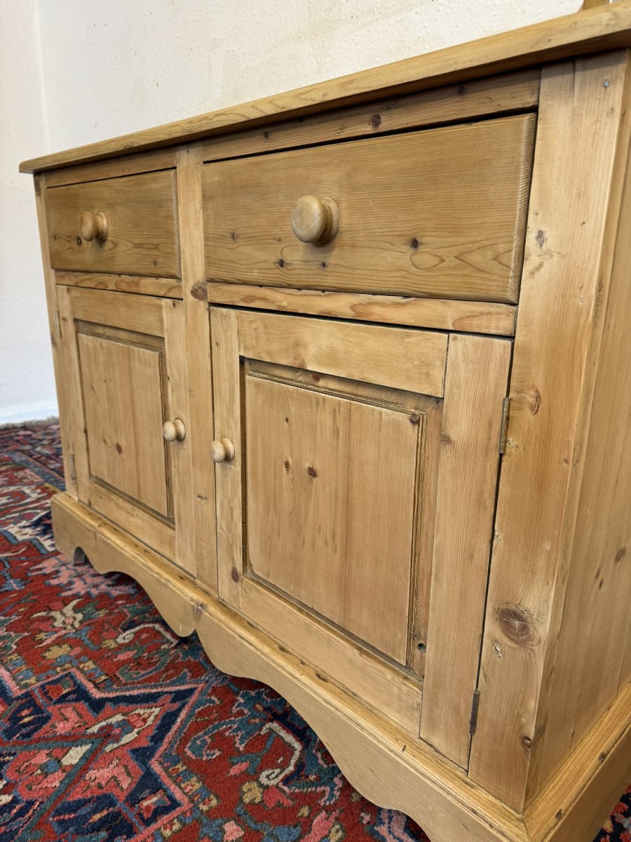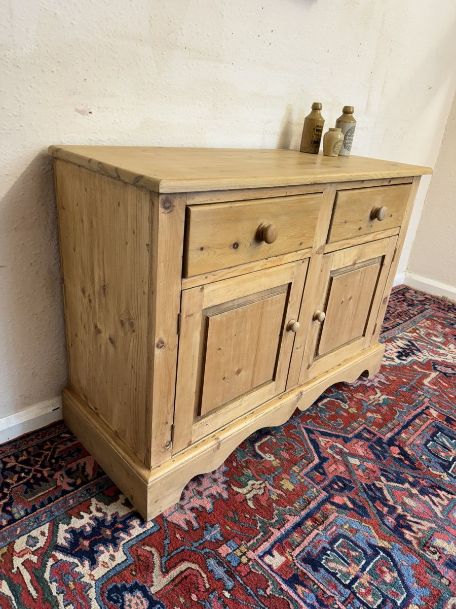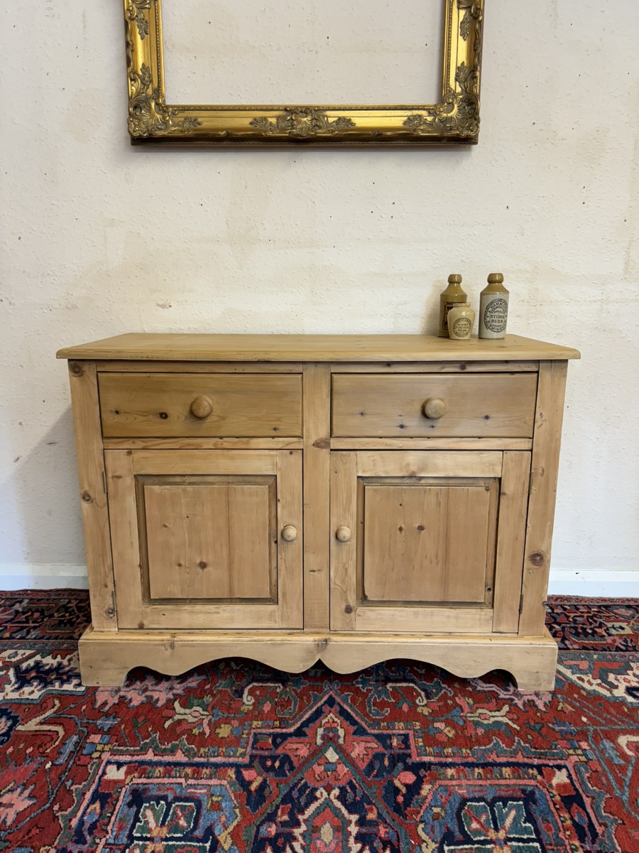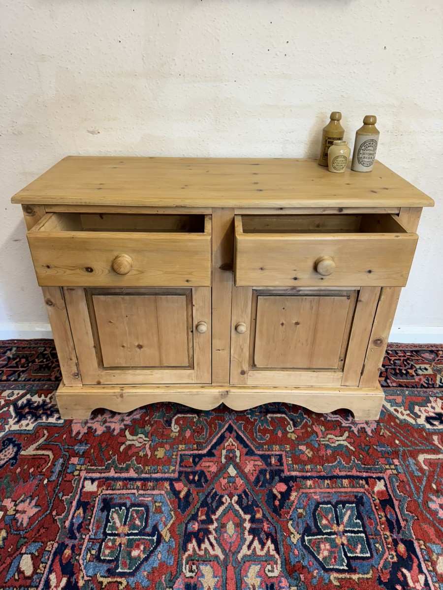 This fabulous pine cupboard is in excellent condition. The oversailing top sits above two drawers, each drawer having a turned knob handle. Below are a pair of fielded panelled cupboard doors, each door having a turned knob handle. The doors open to reveal a fixed wooden shelf. Shaped skirt with a platform base.
