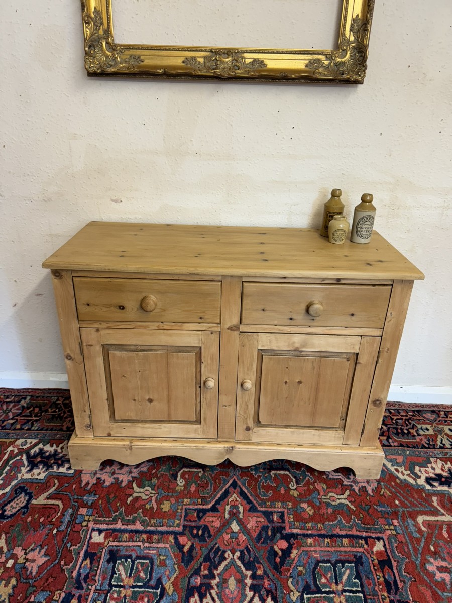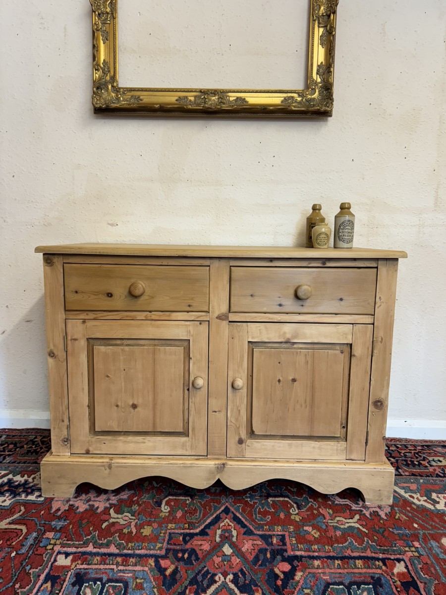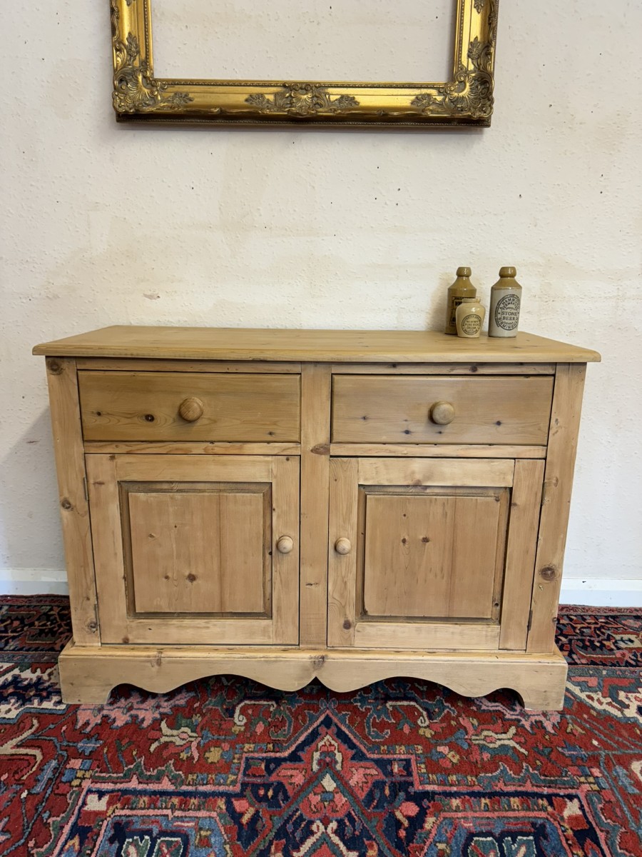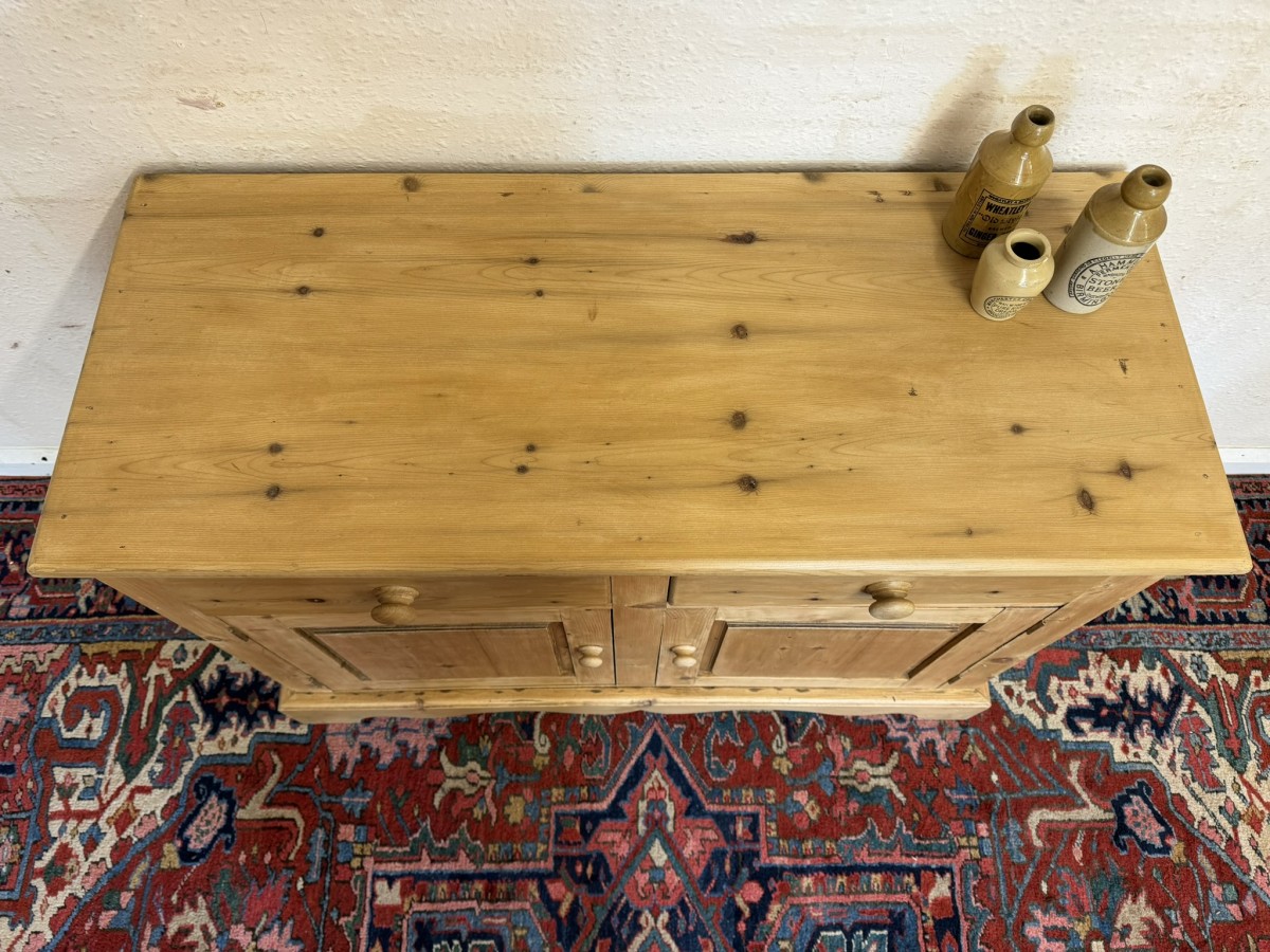 This fabulous pine cupboard is in excellent condition. The oversailing top sits above two drawers, each drawer having a turned knob handle. Below are a pair of fielded panelled cupboard doors, each door having a turned knob handle. The doors open to reveal a fixed wooden shelf. Shaped skirt with a platform base.