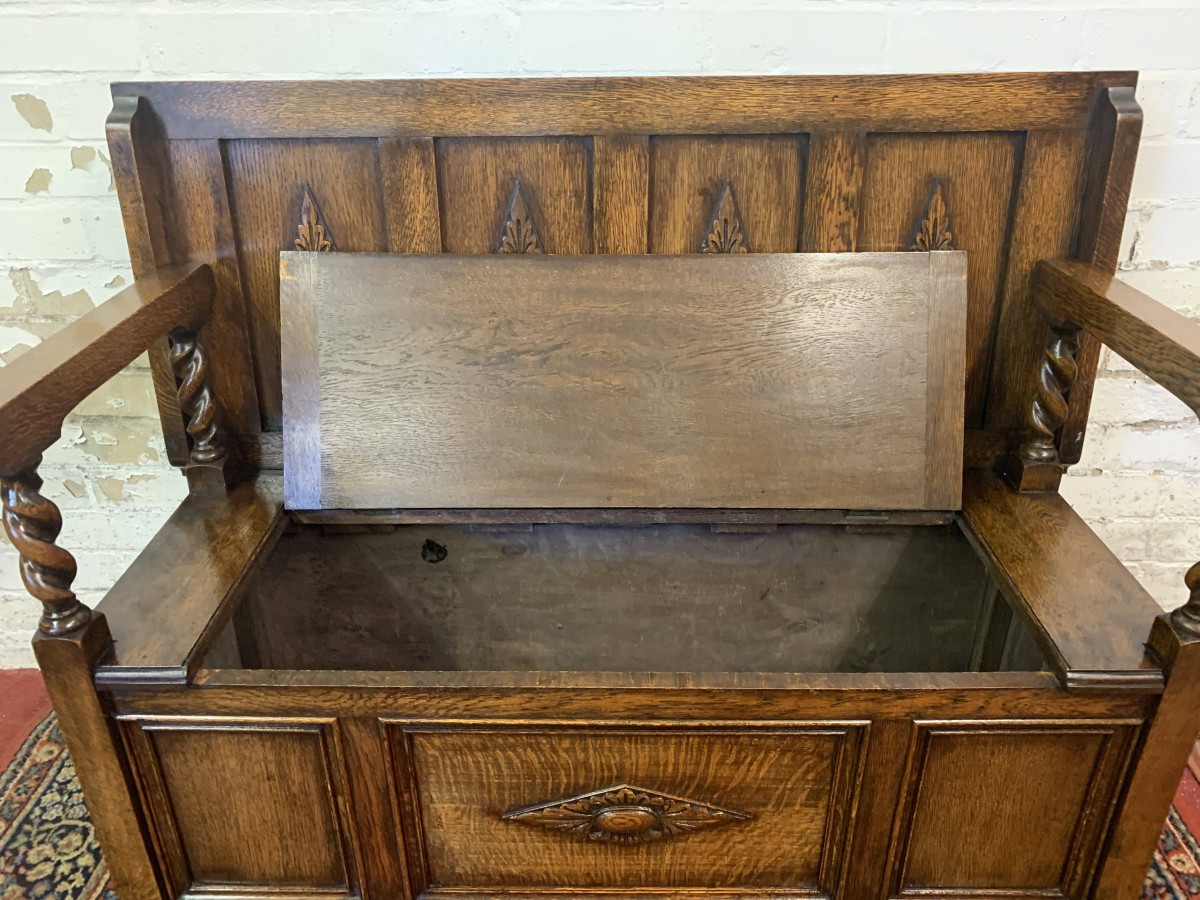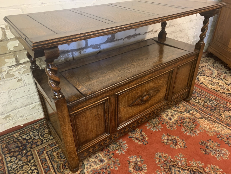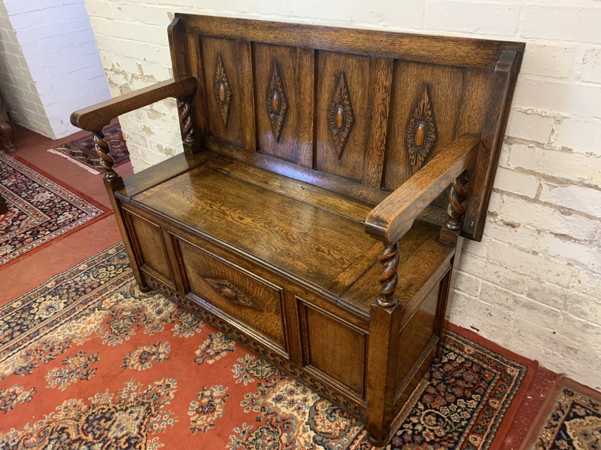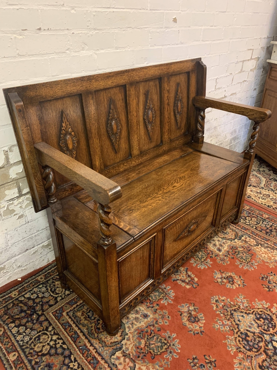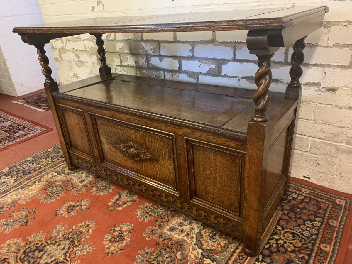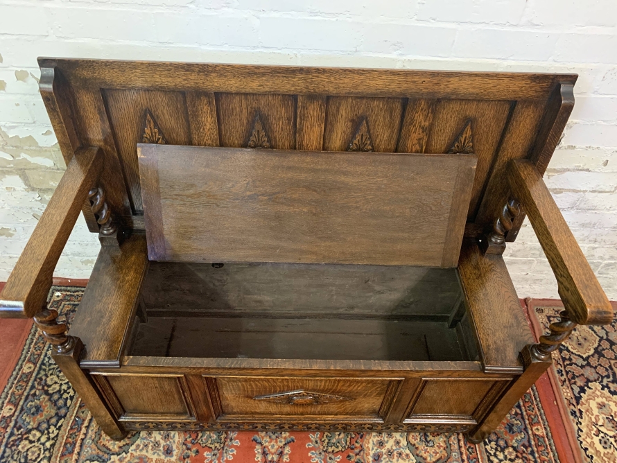 The four panelled top slides back to produce a seat with a lift up lid. Ornately carved back rest, the two arms sit on fabulous barley twist supports. The lift up seat rises to produce a great storage space. Three panelled front with central carved decoration. Recessed panelled sides decorative carved front skirt, this great item sits on four turned feet.