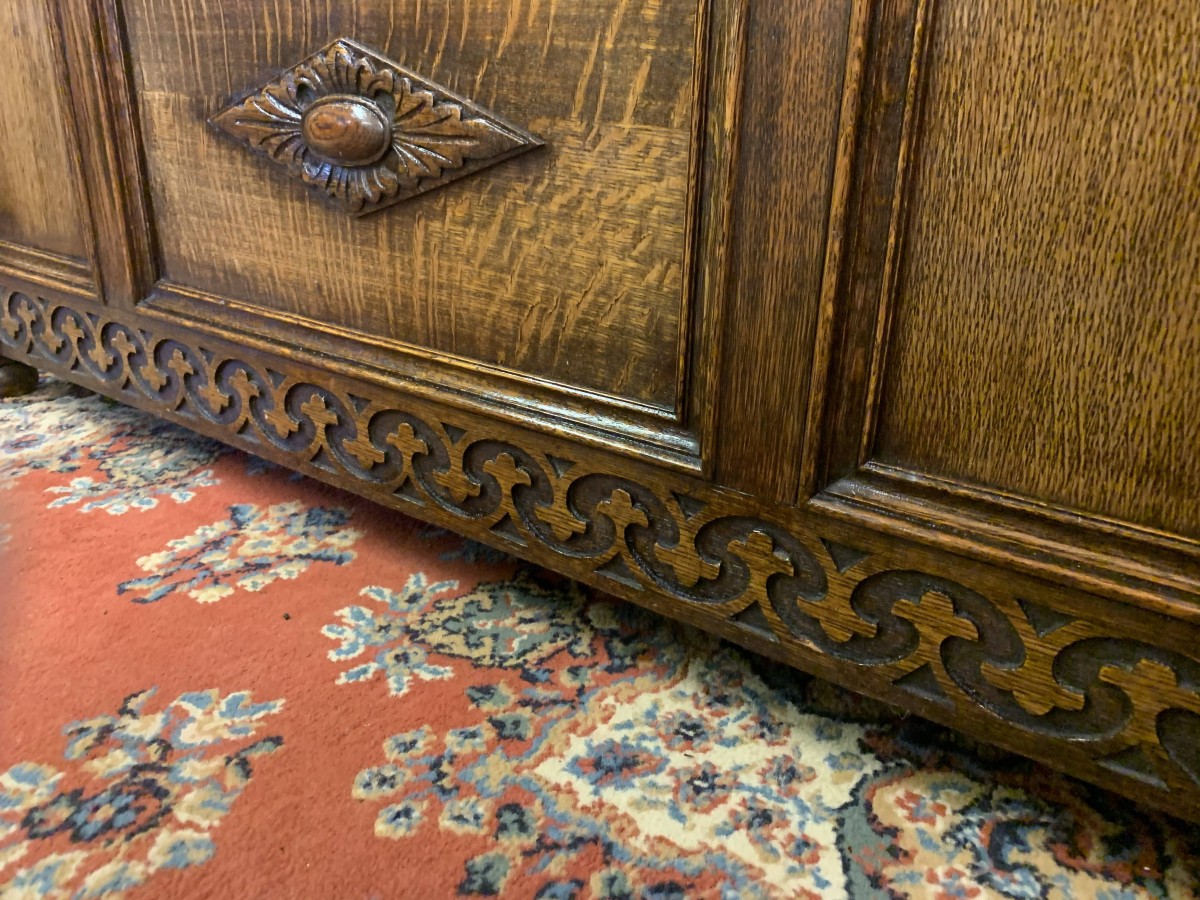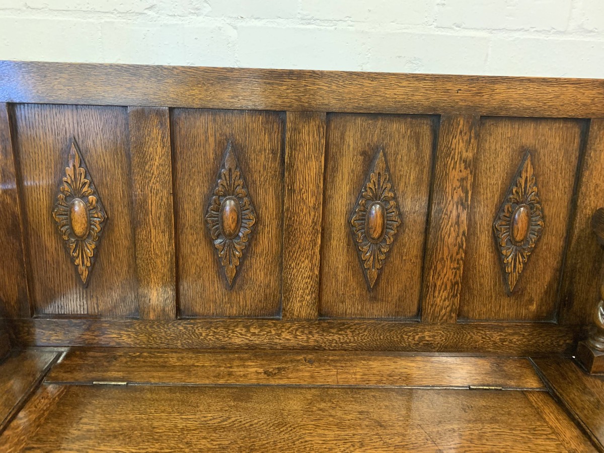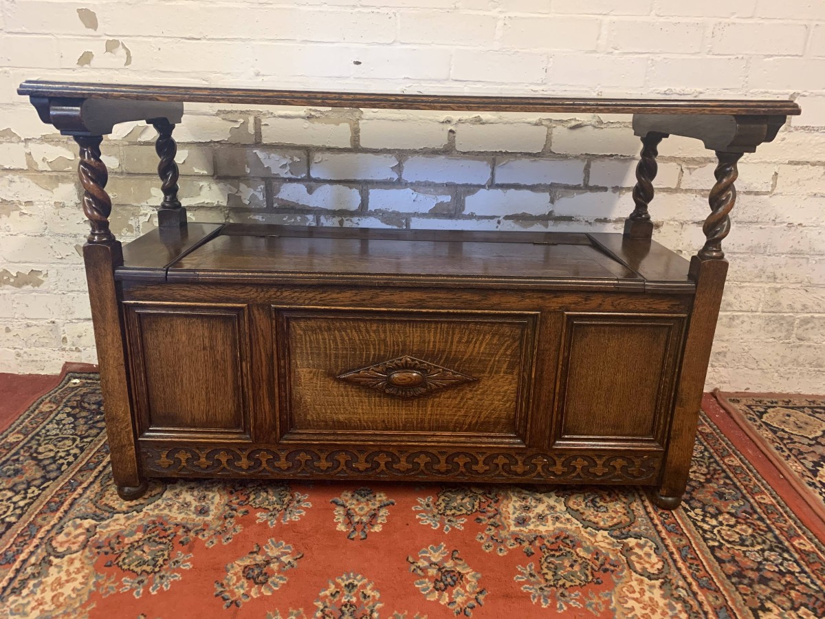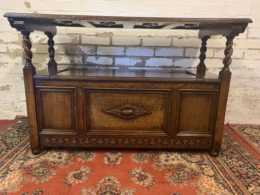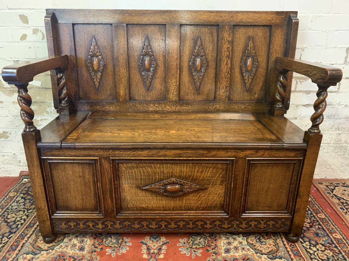 The four panelled top slides back to produce a seat with a lift up lid. Ornately carved back rest, the two arms sit on fabulous barley twist supports. The lift up seat rises to produce a great storage space. Three panelled front with central carved decoration. Recessed panelled sides decorative carved front skirt, this great item sits on four turned feet.