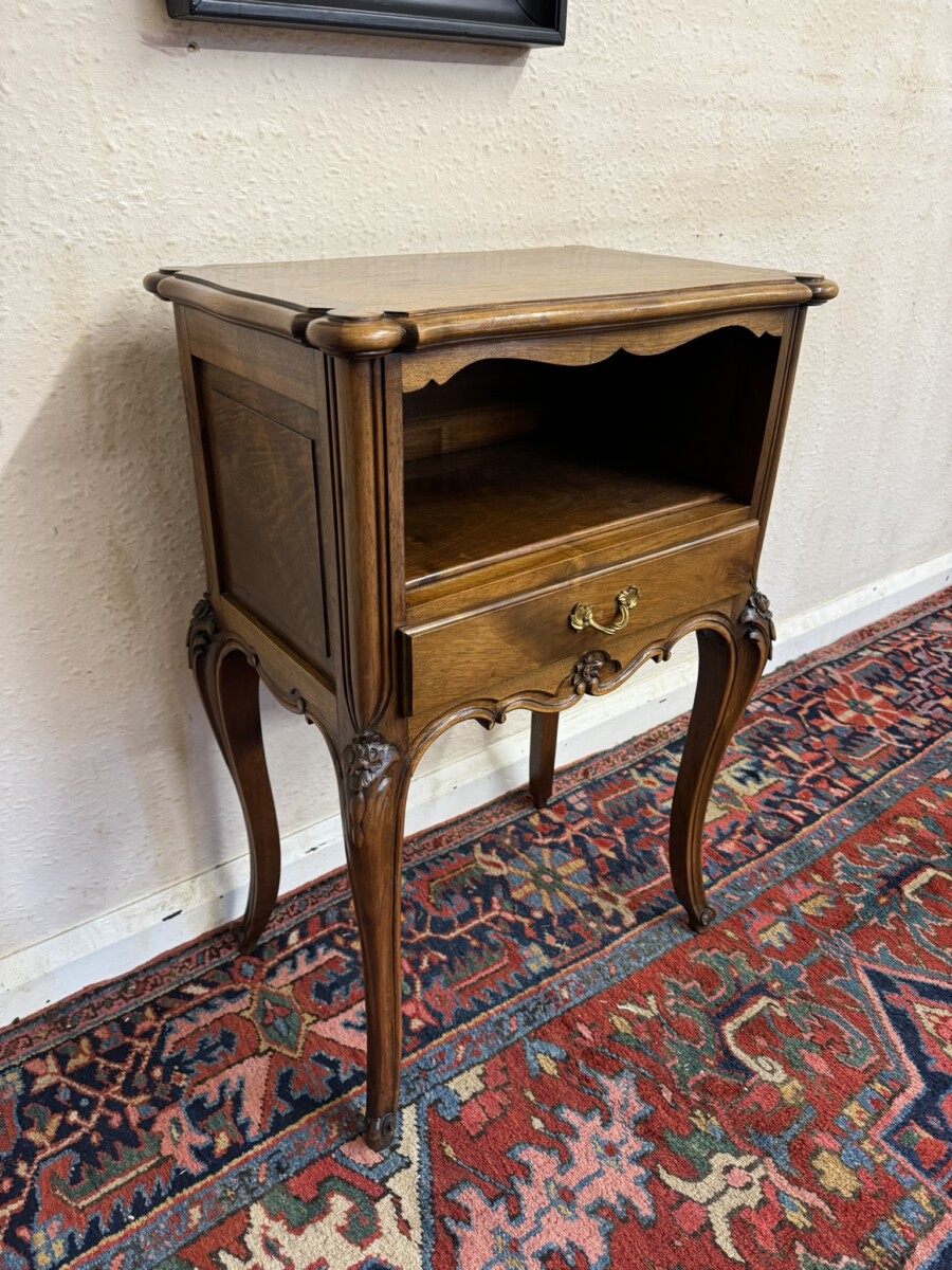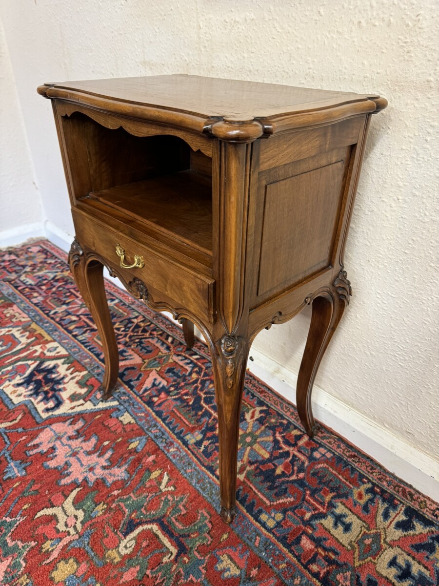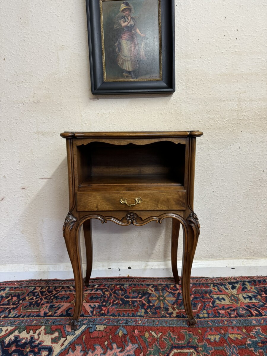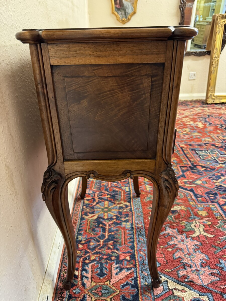 The shaped oversailing top has rounded corners. Open section has a drawer below, the drawer having an ornate brass handle. Recessed panelled sides shaped carved skirt this fabulous walnut French side table stands on four elegant carved cabriole shaped legs.