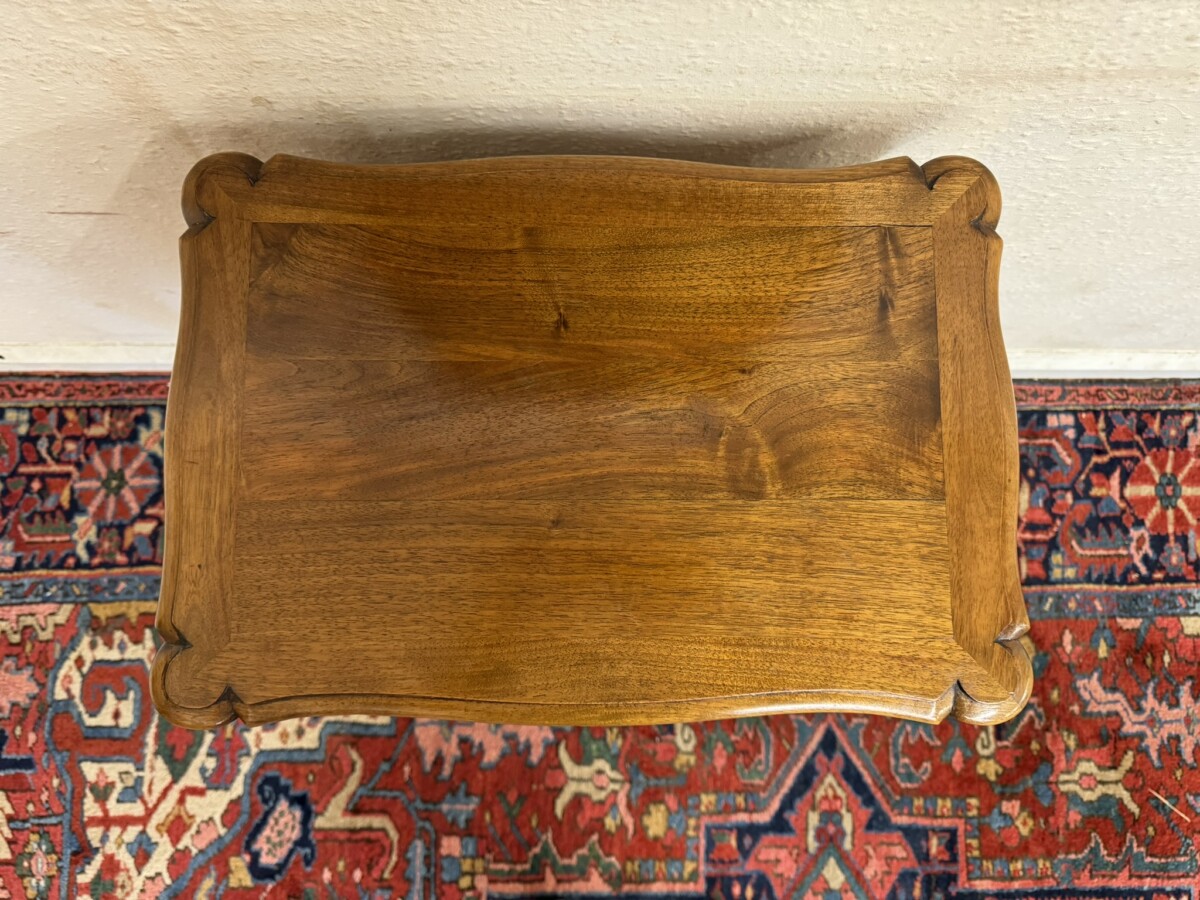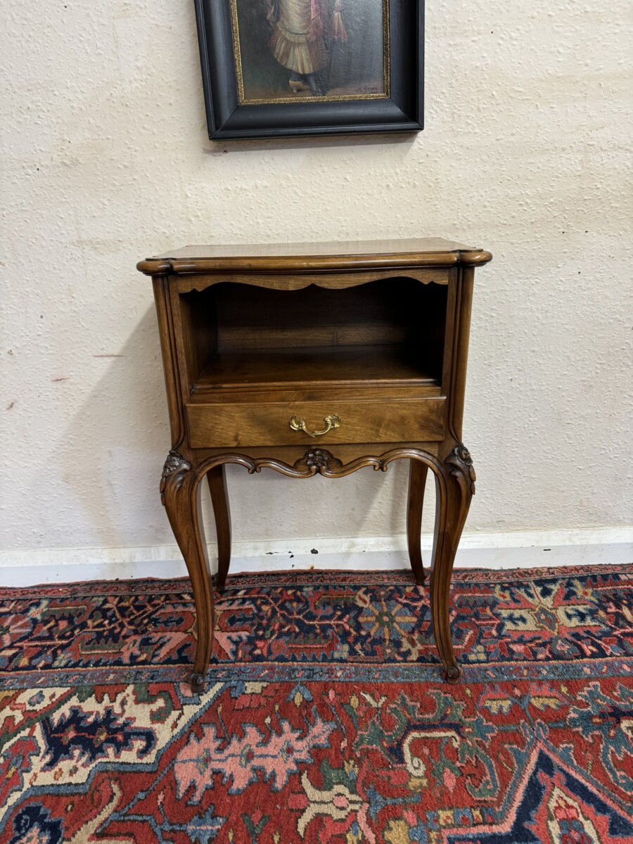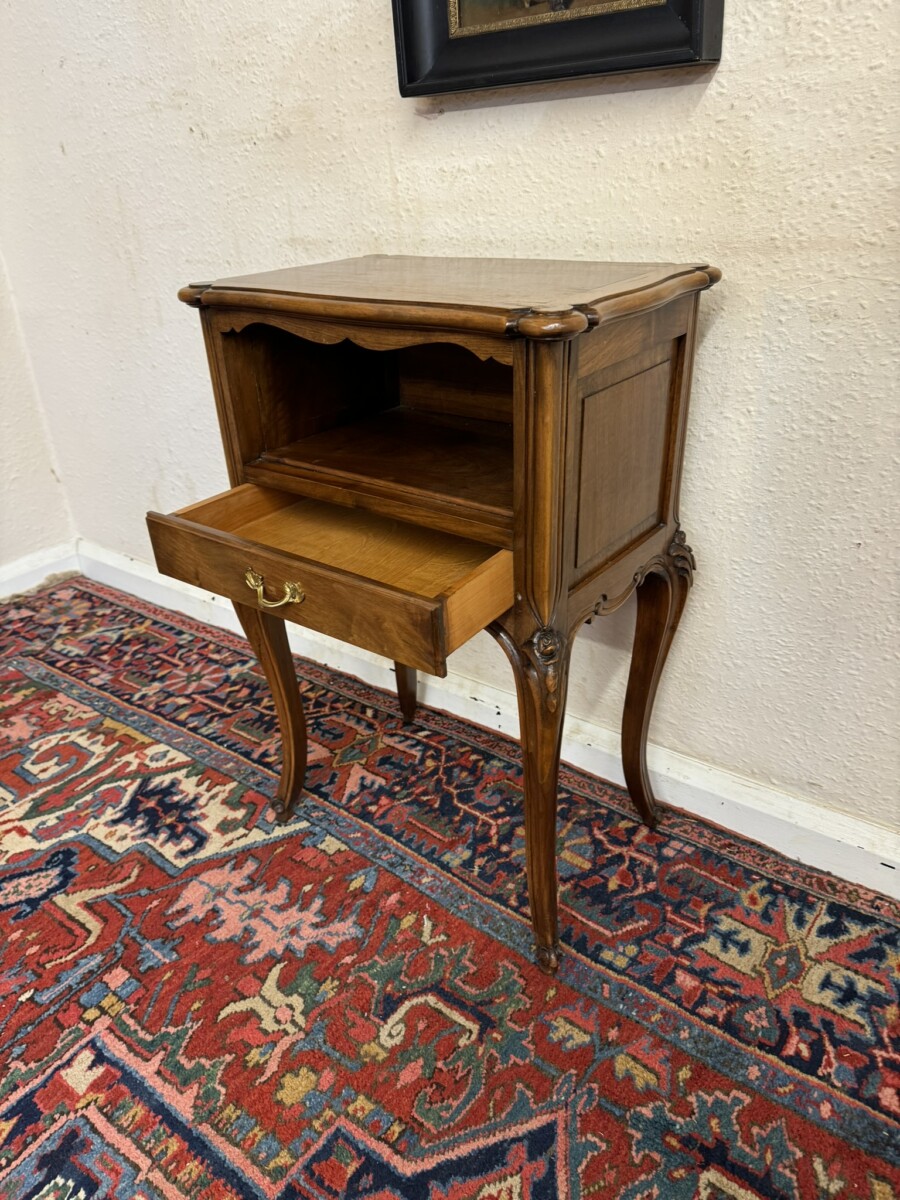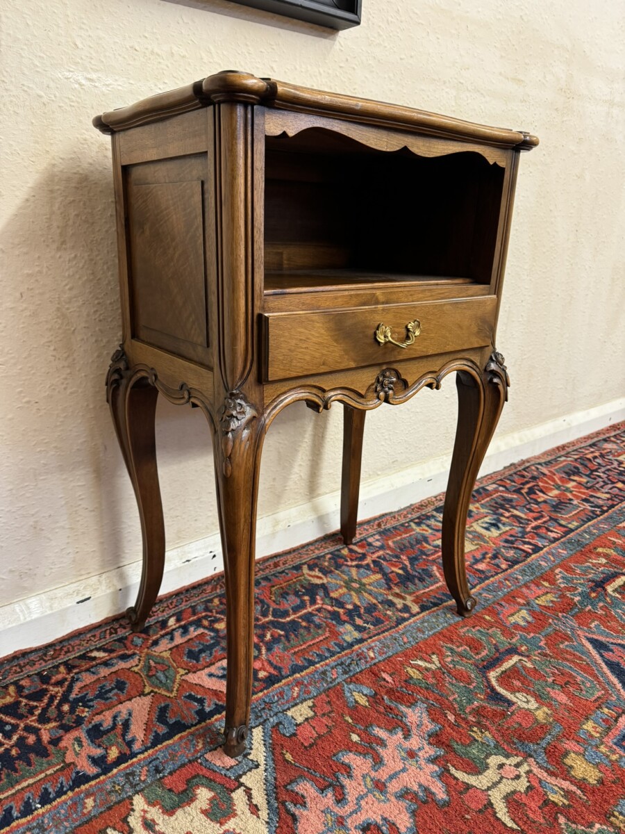 The shaped oversailing top has rounded corners. Open section has a drawer below, the drawer having an ornate brass handle. Recessed panelled sides shaped carved skirt this fabulous walnut French side table stands on four elegant carved cabriole shaped legs.