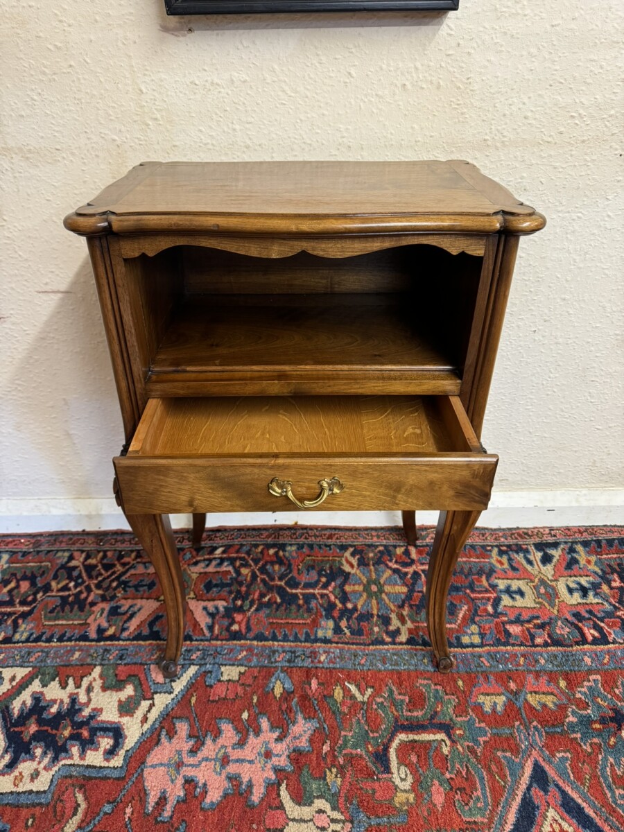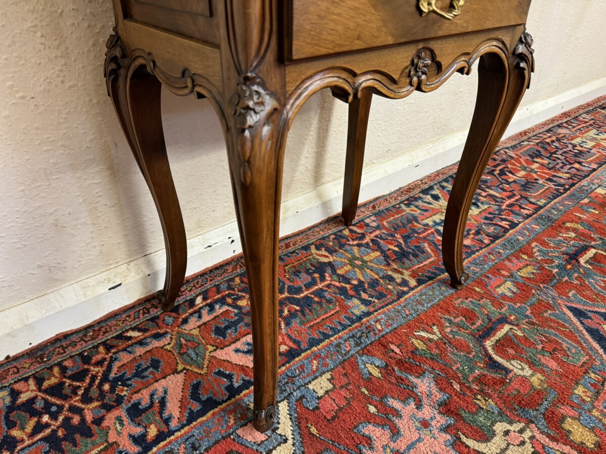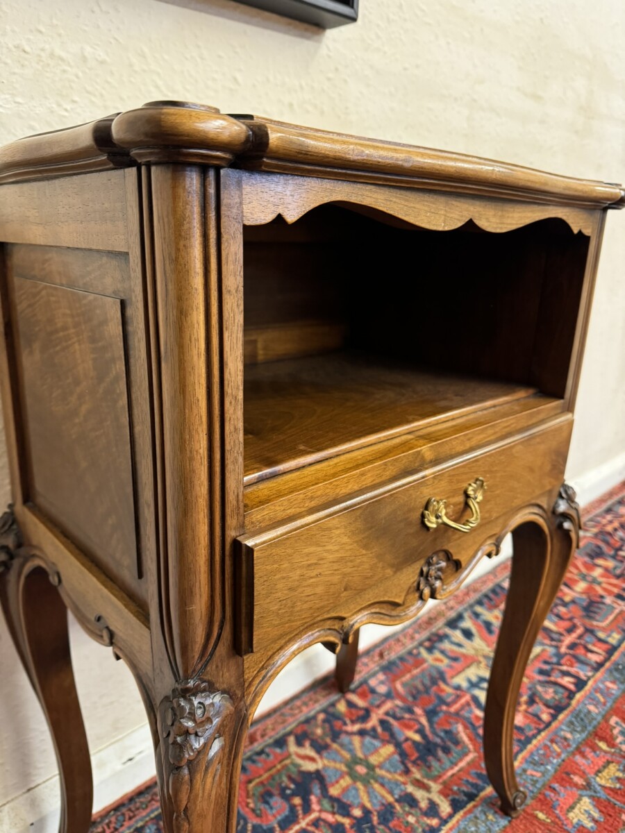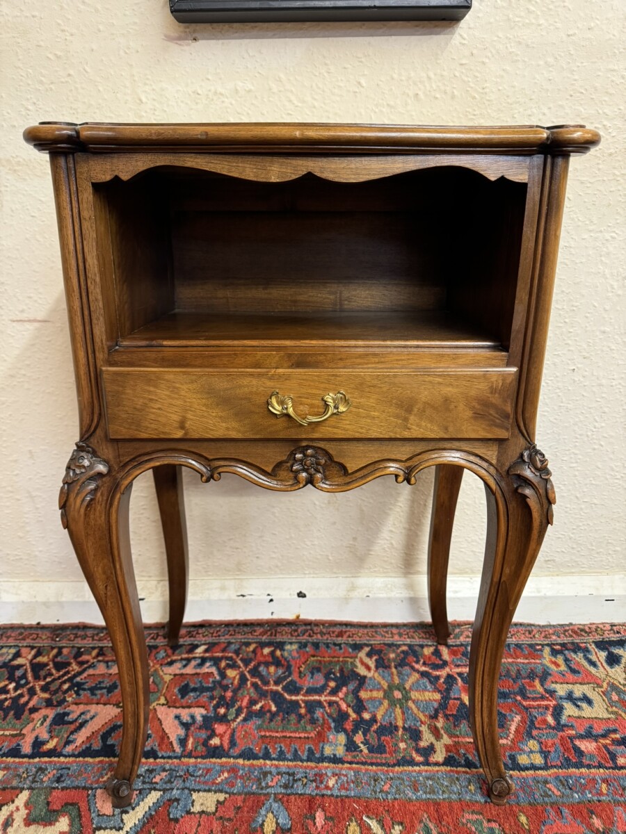 The shaped oversailing top has rounded corners. Open section has a drawer below, the drawer having an ornate brass handle. Recessed panelled sides shaped carved skirt this fabulous walnut French side table stands on four elegant carved cabriole shaped legs.