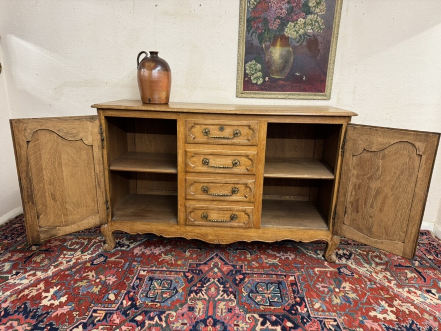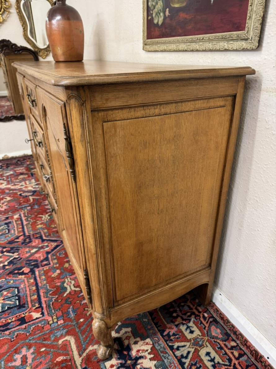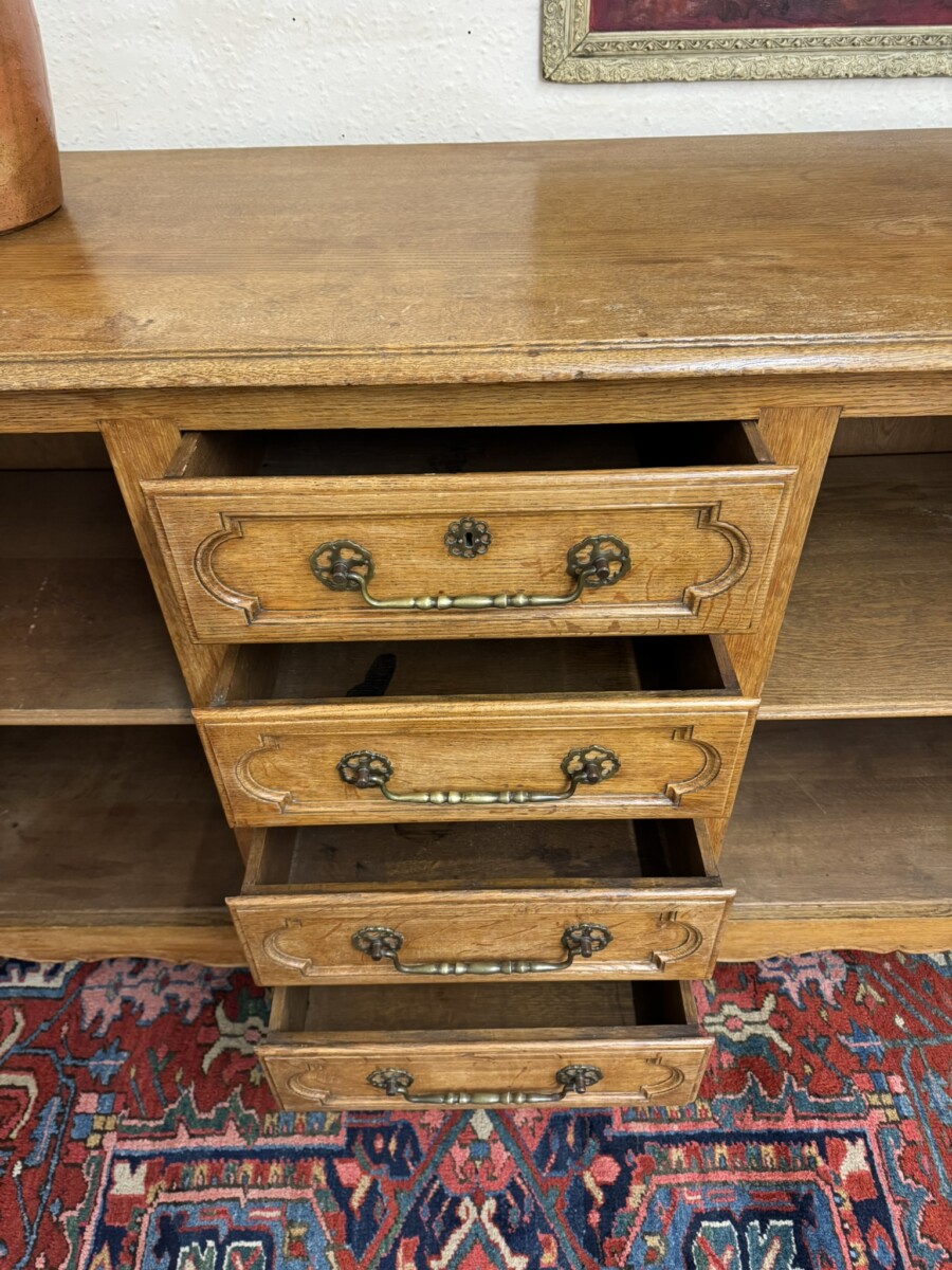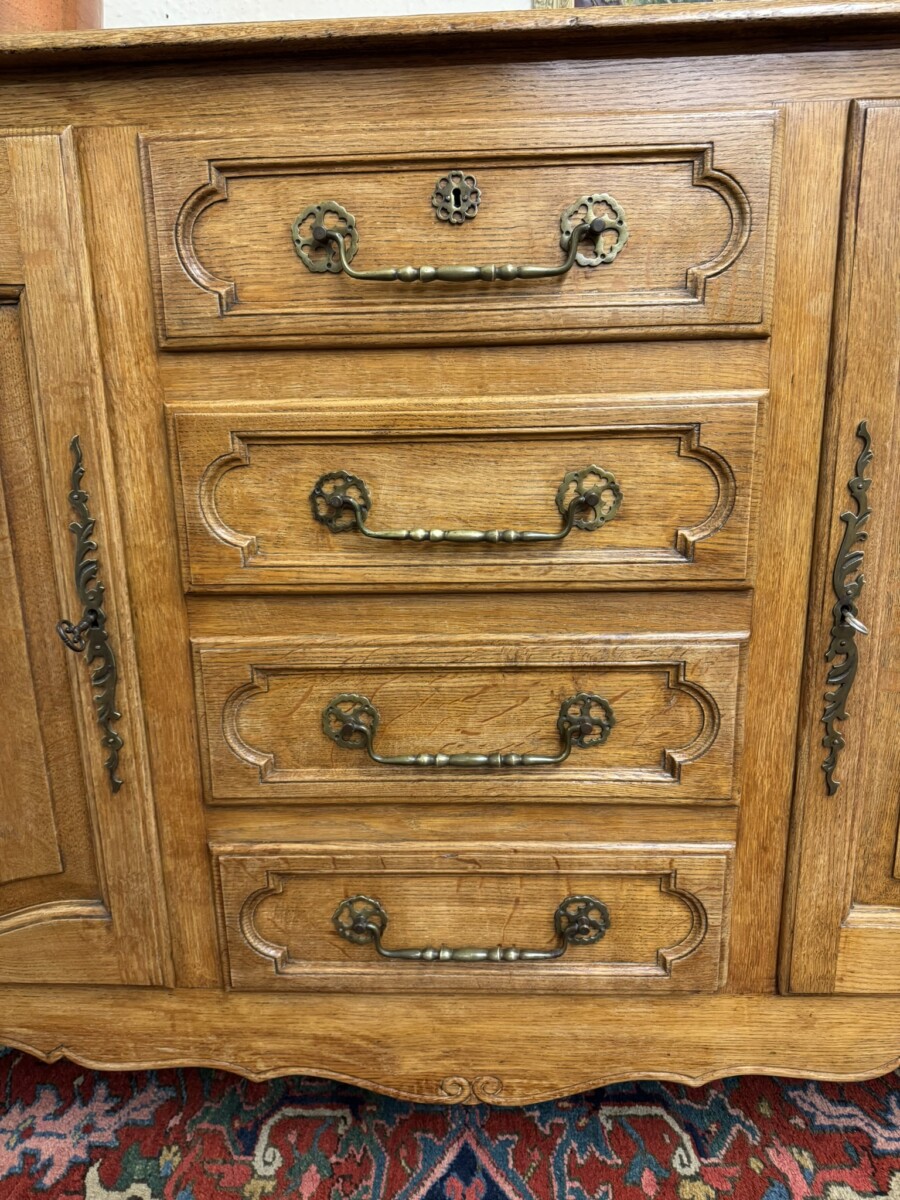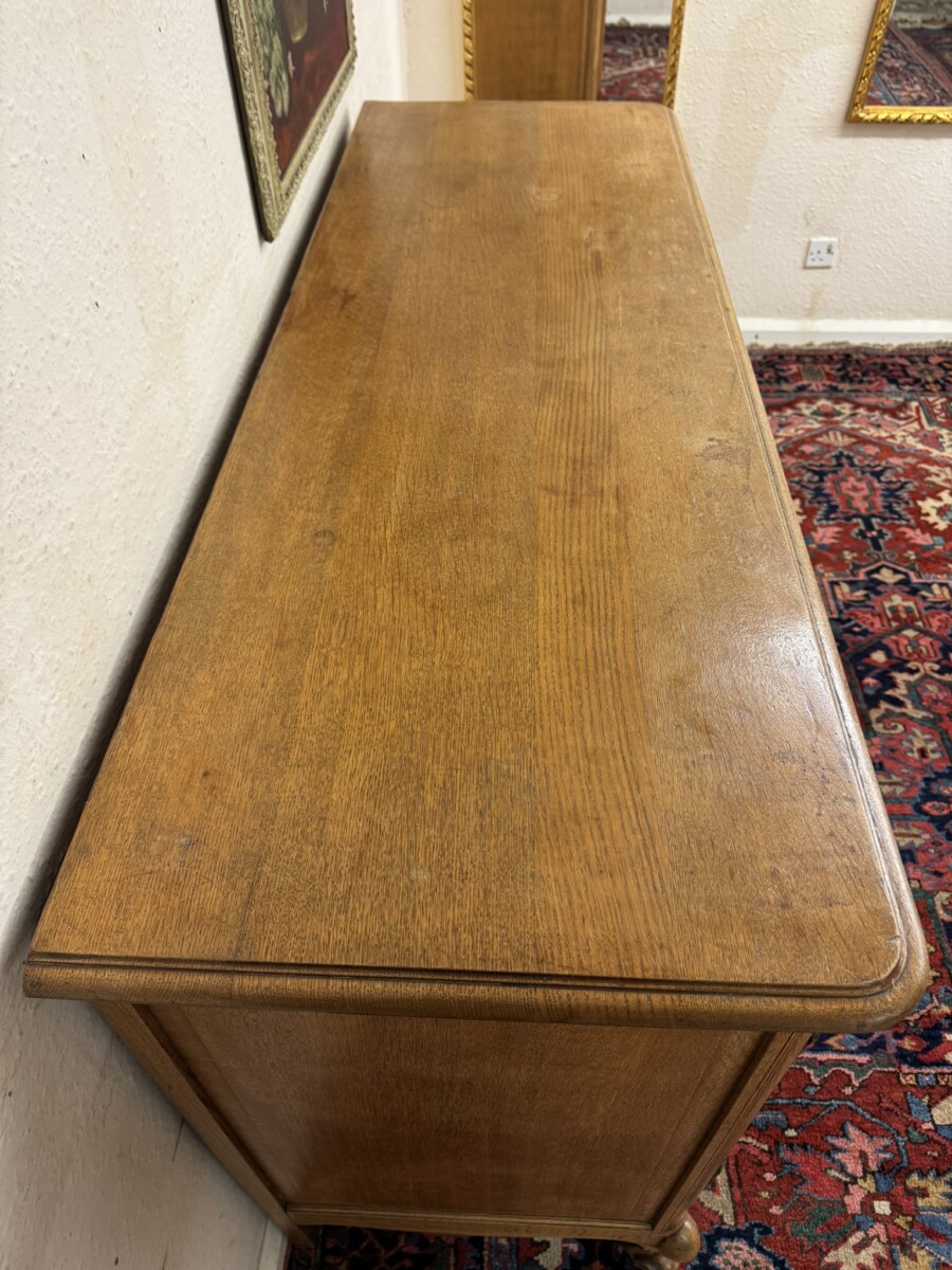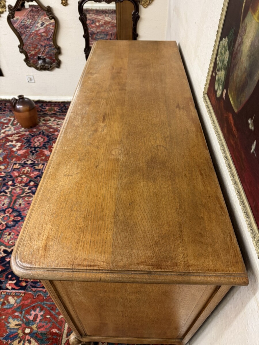 This super dresser dates circa 1900 and in is made in solid oak. The oversailing top has rounded corners to the front, below is a central bank of four drawers, each drawer having a large brass handle. The central bank of drawers is flanked by a pair of lockable recessed panelled doors, the doors open to reveal a removable shelf. Recessed panelled sides, shaped skirt with central carving and standing on two carved cabriole shaped legs to the front.