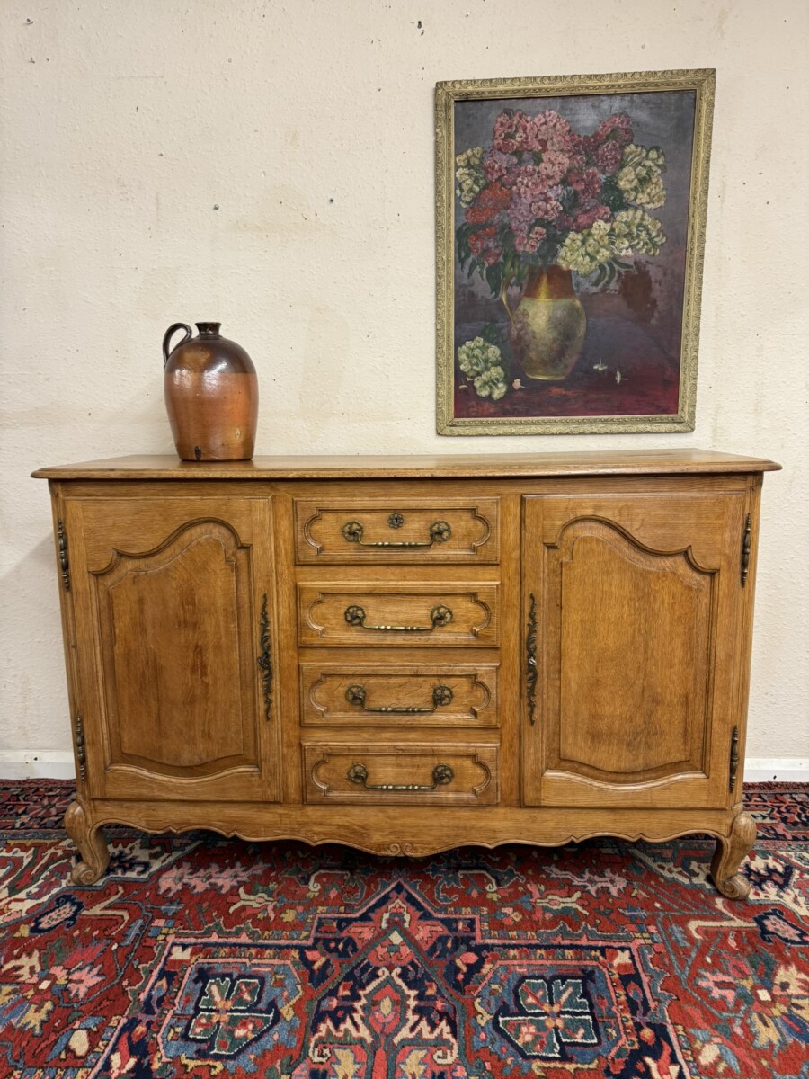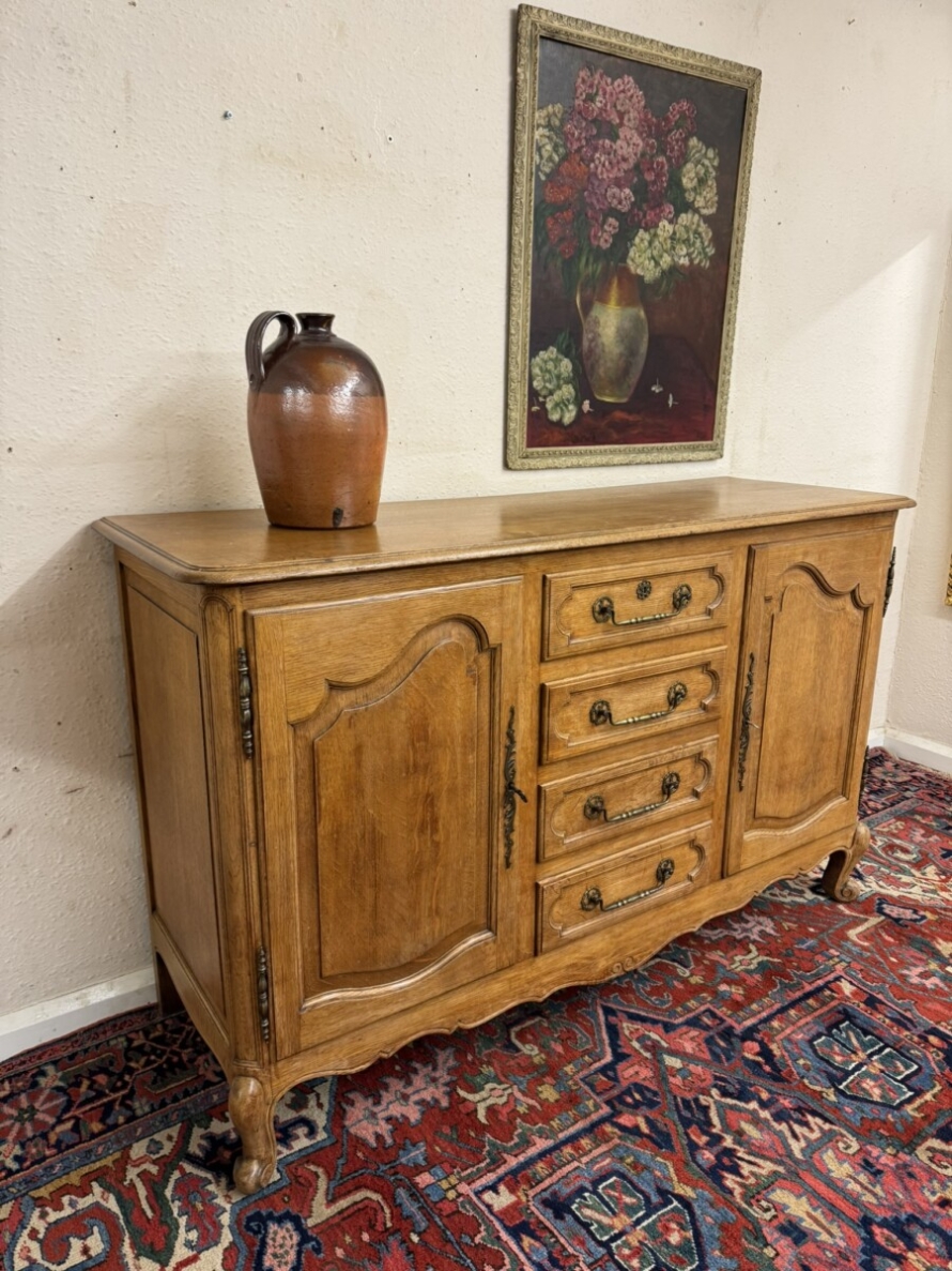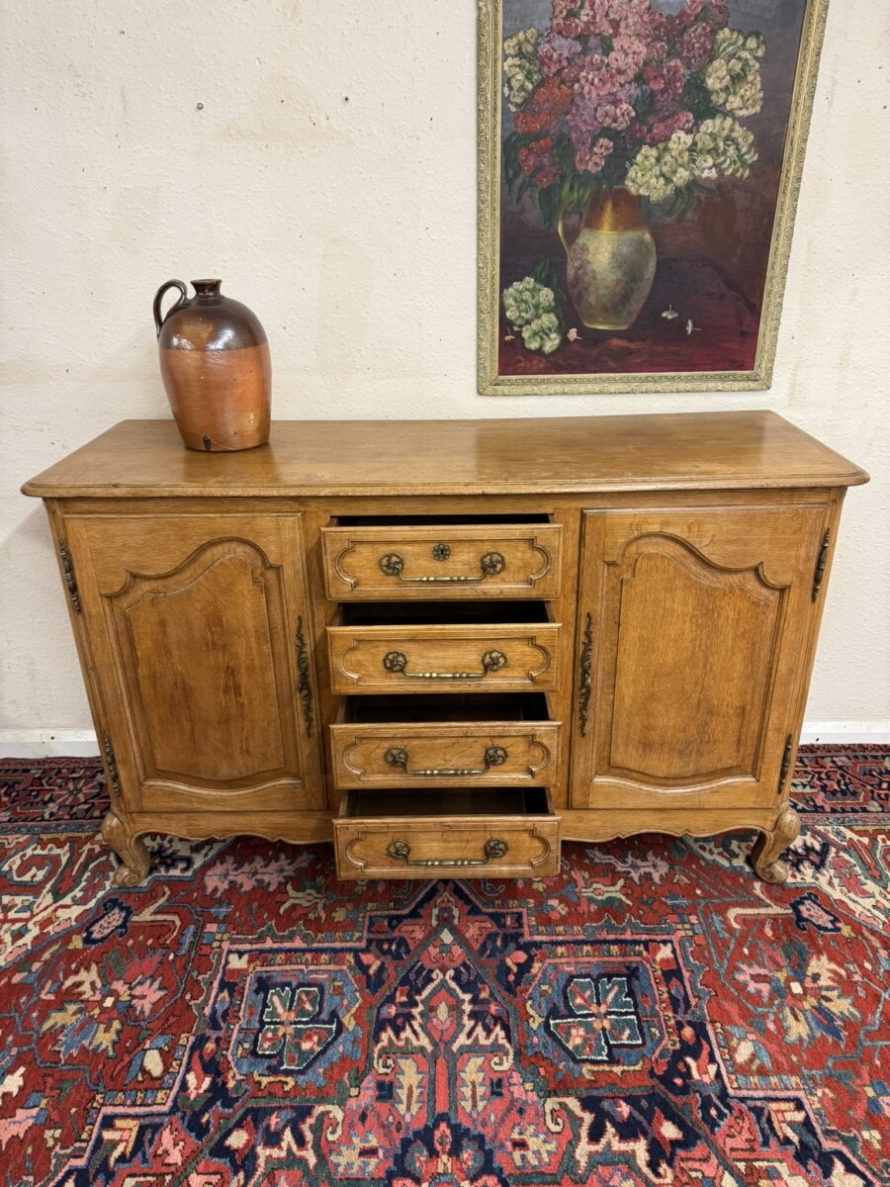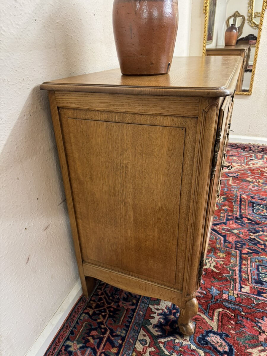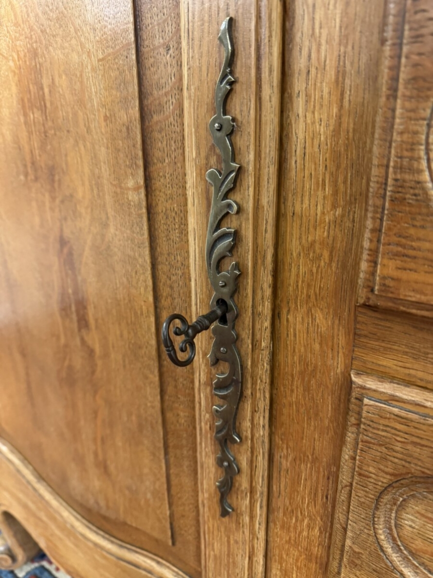 This super dresser dates circa 1900 and in is made in solid oak. The oversailing top has rounded corners to the front, below is a central bank of four drawers, each drawer having a large brass handle. The central bank of drawers is flanked by a pair of lockable recessed panelled doors, the doors open to reveal a removable shelf. Recessed panelled sides, shaped skirt with central carving and standing on two carved cabriole shaped legs to the front.