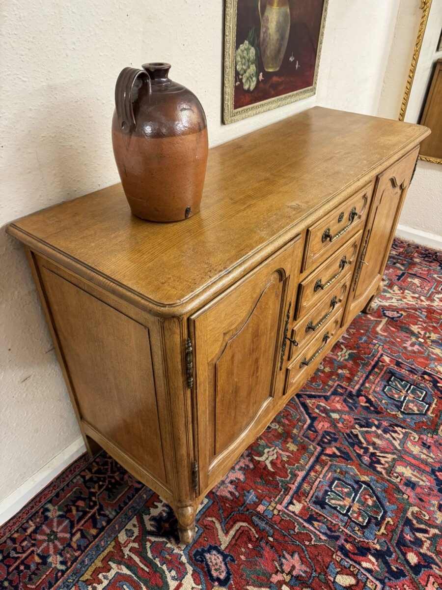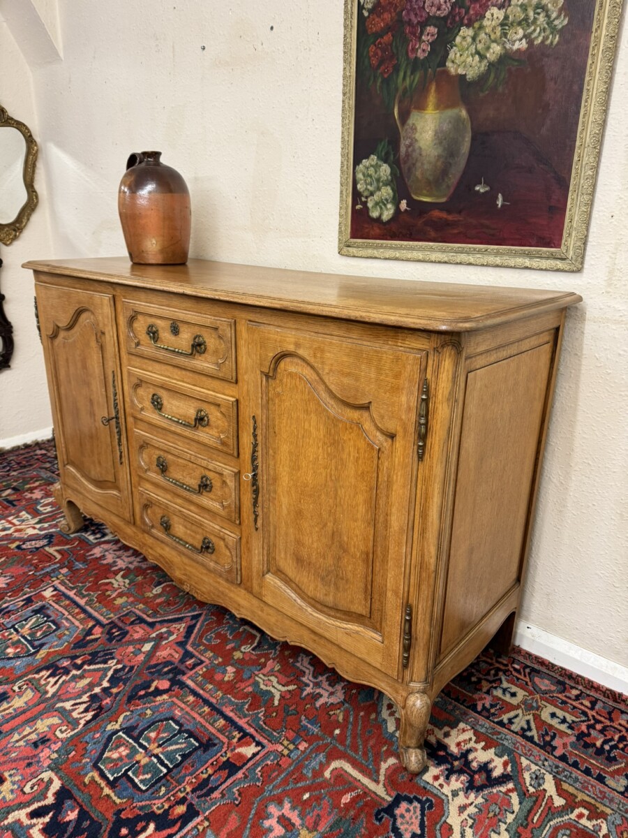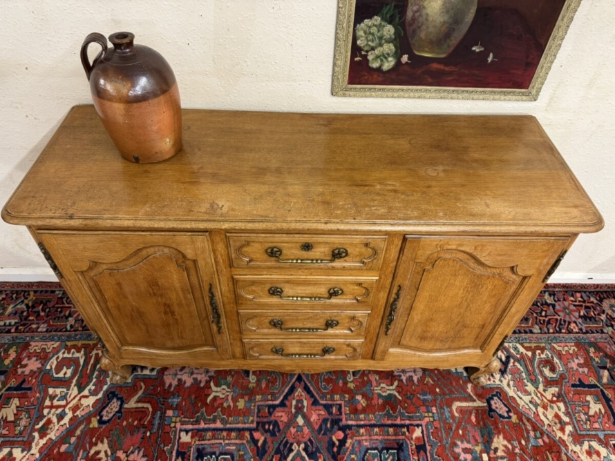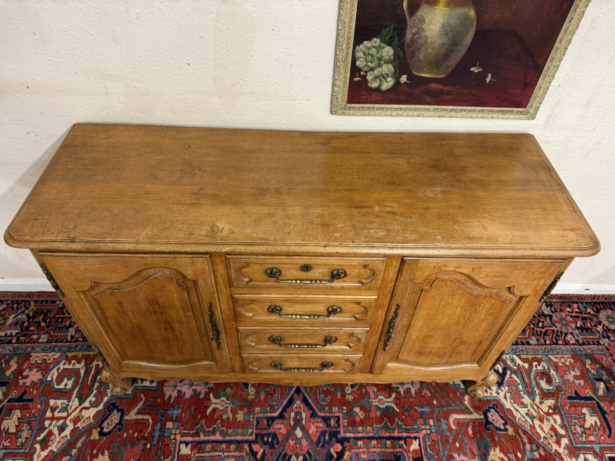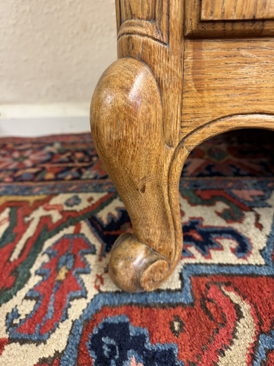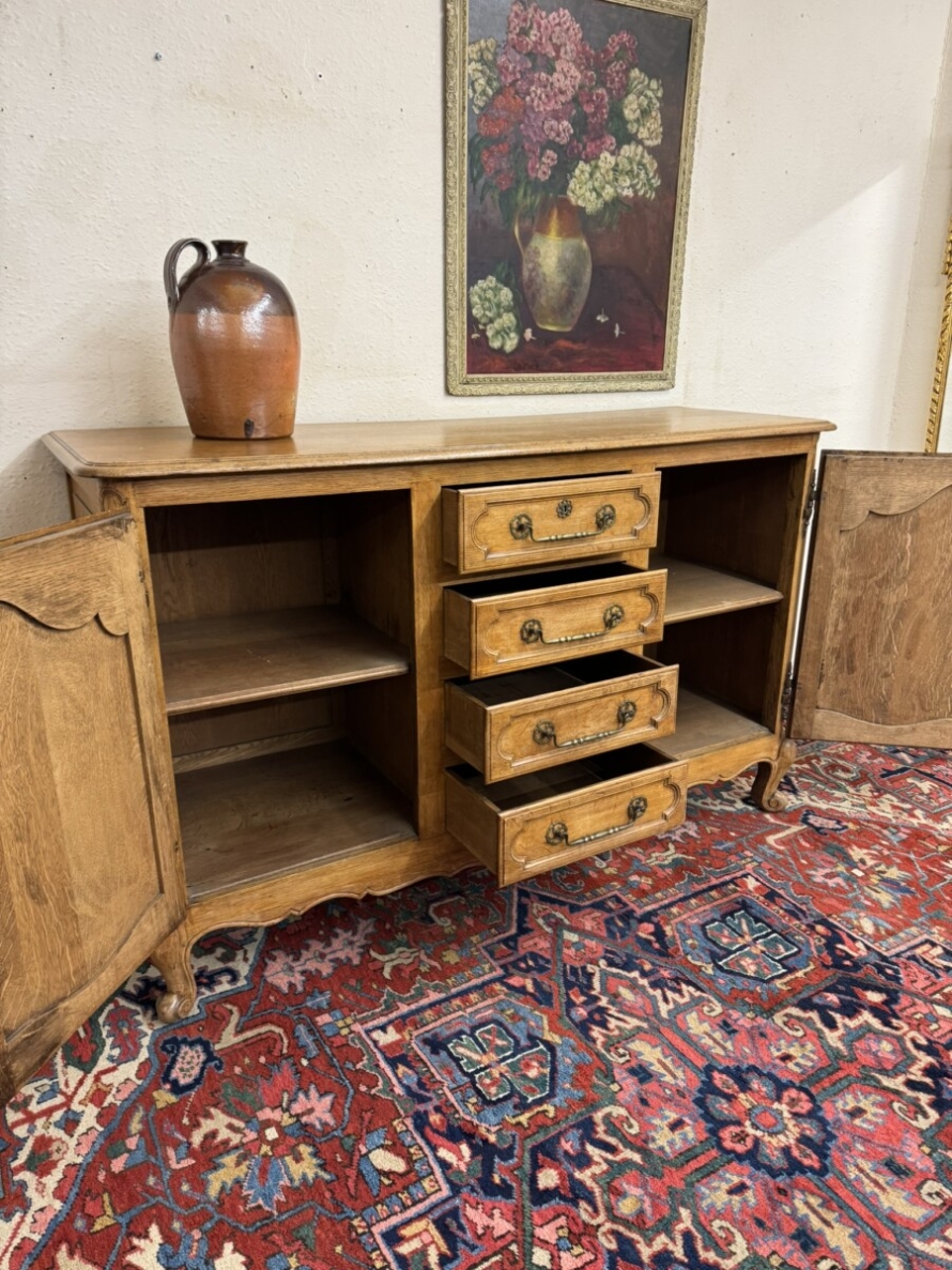 This super dresser dates circa 1900 and in is made in solid oak. The oversailing top has rounded corners to the front, below is a central bank of four drawers, each drawer having a large brass handle. The central bank of drawers is flanked by a pair of lockable recessed panelled doors, the doors open to reveal a removable shelf. Recessed panelled sides, shaped skirt with central carving and standing on two carved cabriole shaped legs to the front.