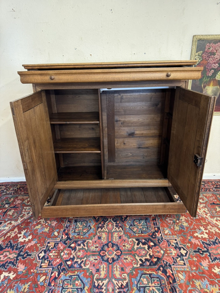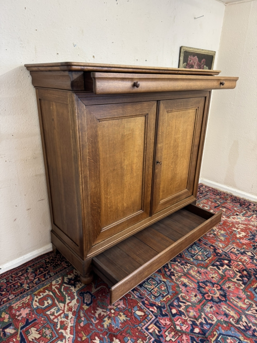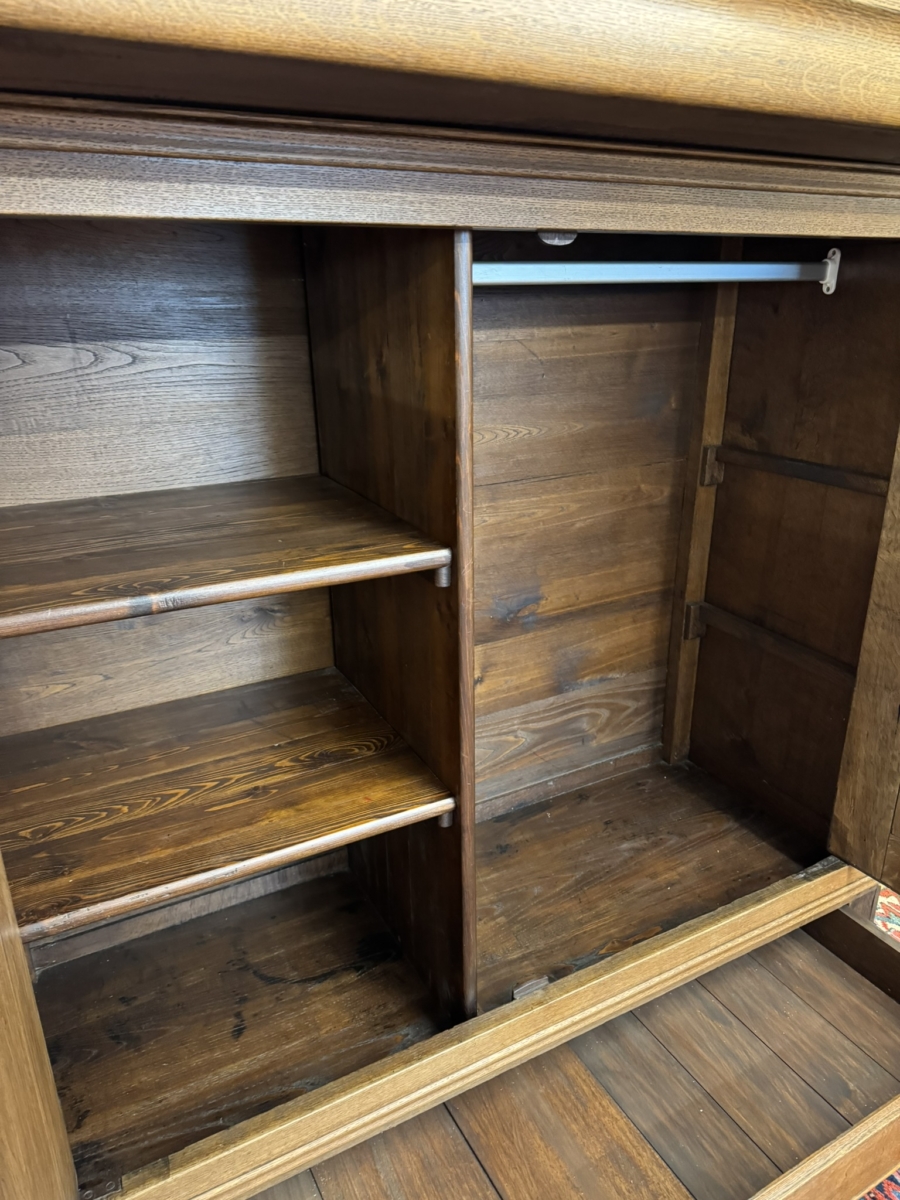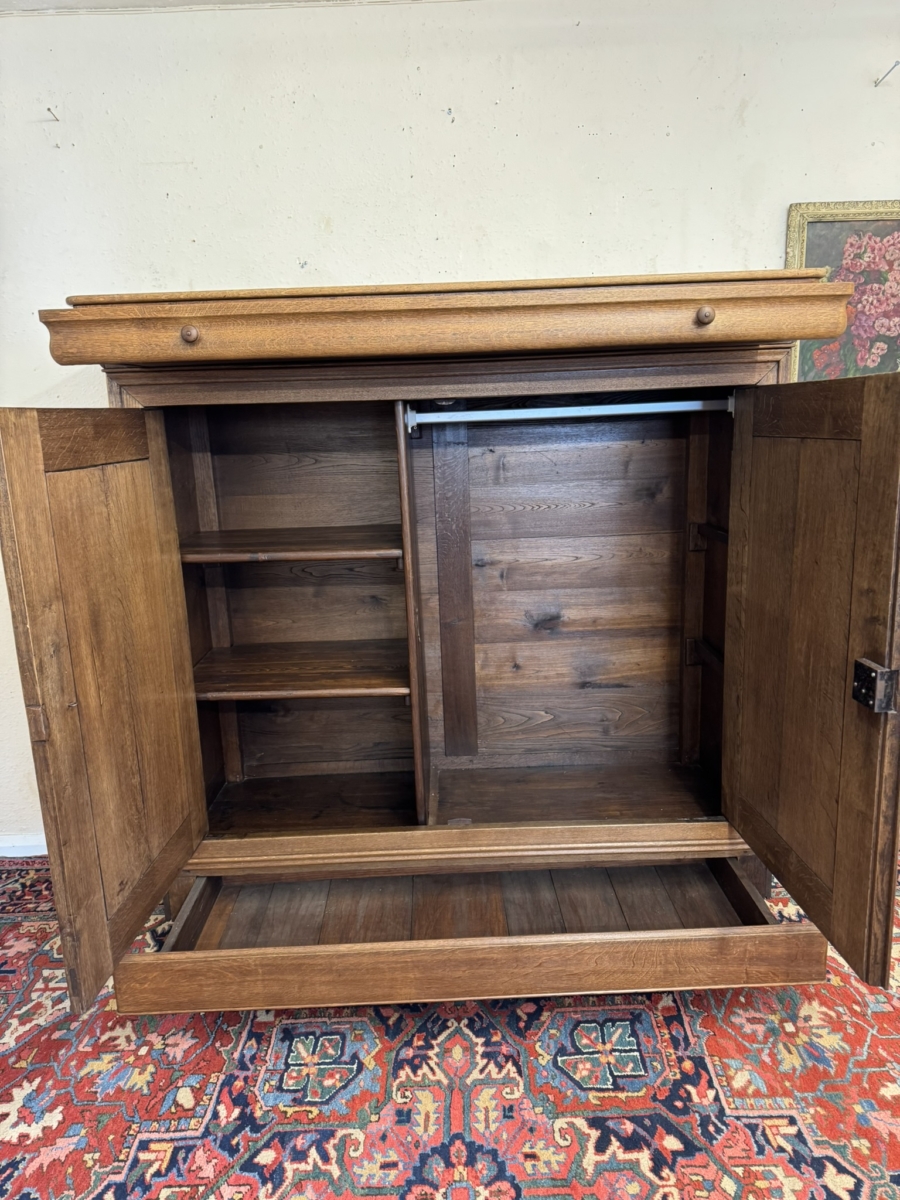 This stunning housekeepers cupboard dates circa 1900. The oversailing top has a curved drawer below, the drawer having a pair of turned handles. Below are a pair of recessed panelled lockable doors, the doors open to reveal two removable shelves to the left and a hanging rail to the right. Below the doors is a hidden drawer which slides open for added storage. Recessed panelled sides and standing on two turned feet to the front.