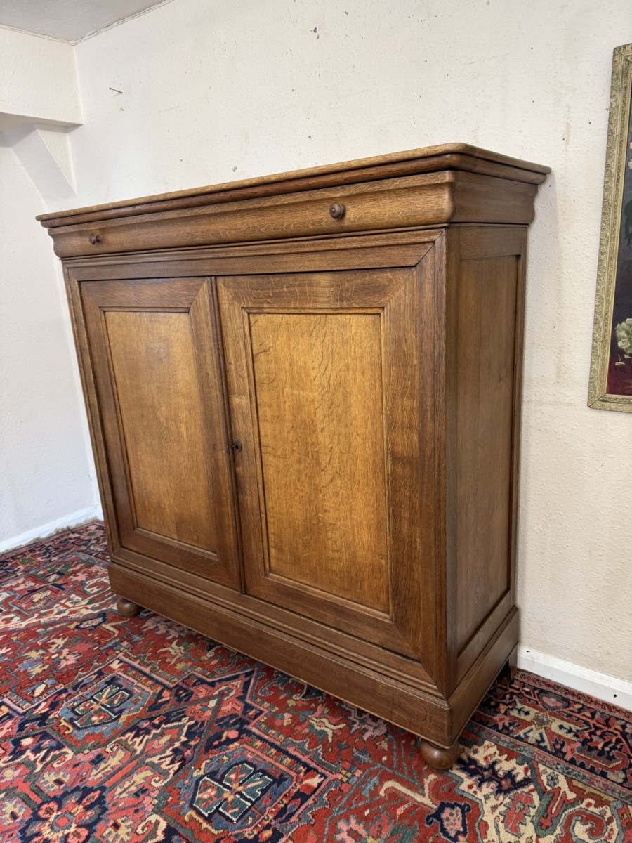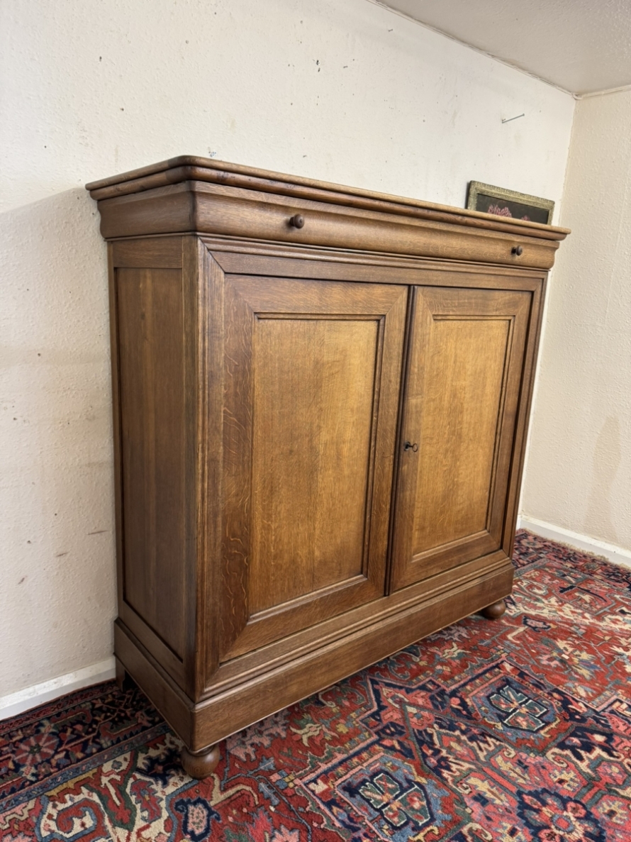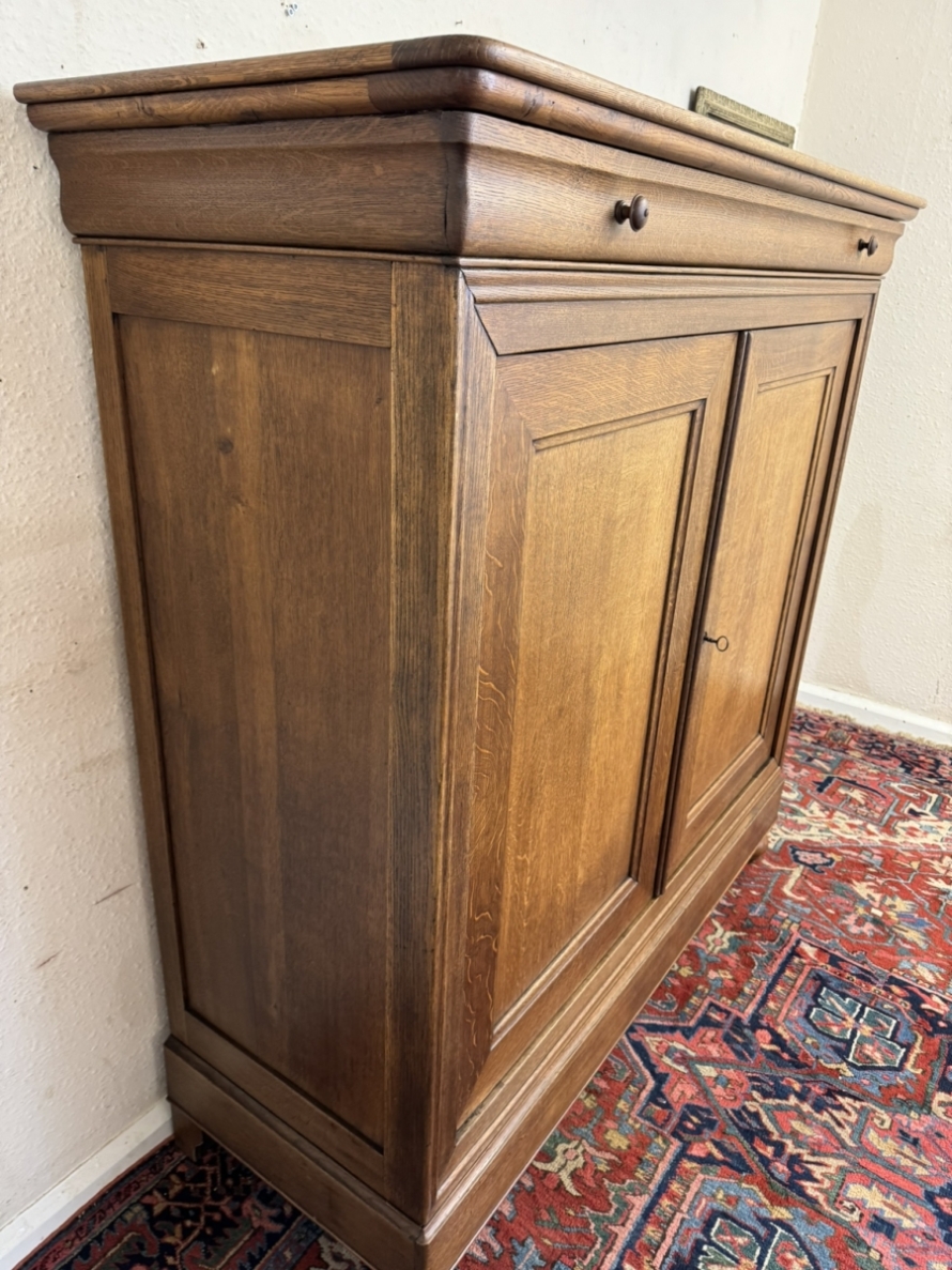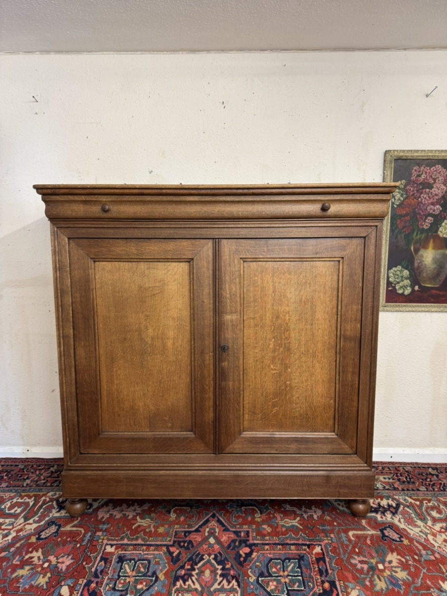 This stunning housekeepers cupboard dates circa 1900. The oversailing top has a curved drawer below, the drawer having a pair of turned handles. Below are a pair of recessed panelled lockable doors, the doors open to reveal two removable shelves to the left and a hanging rail to the right. Below the doors is a hidden drawer which slides open for added storage. Recessed panelled sides and standing on two turned feet to the front.