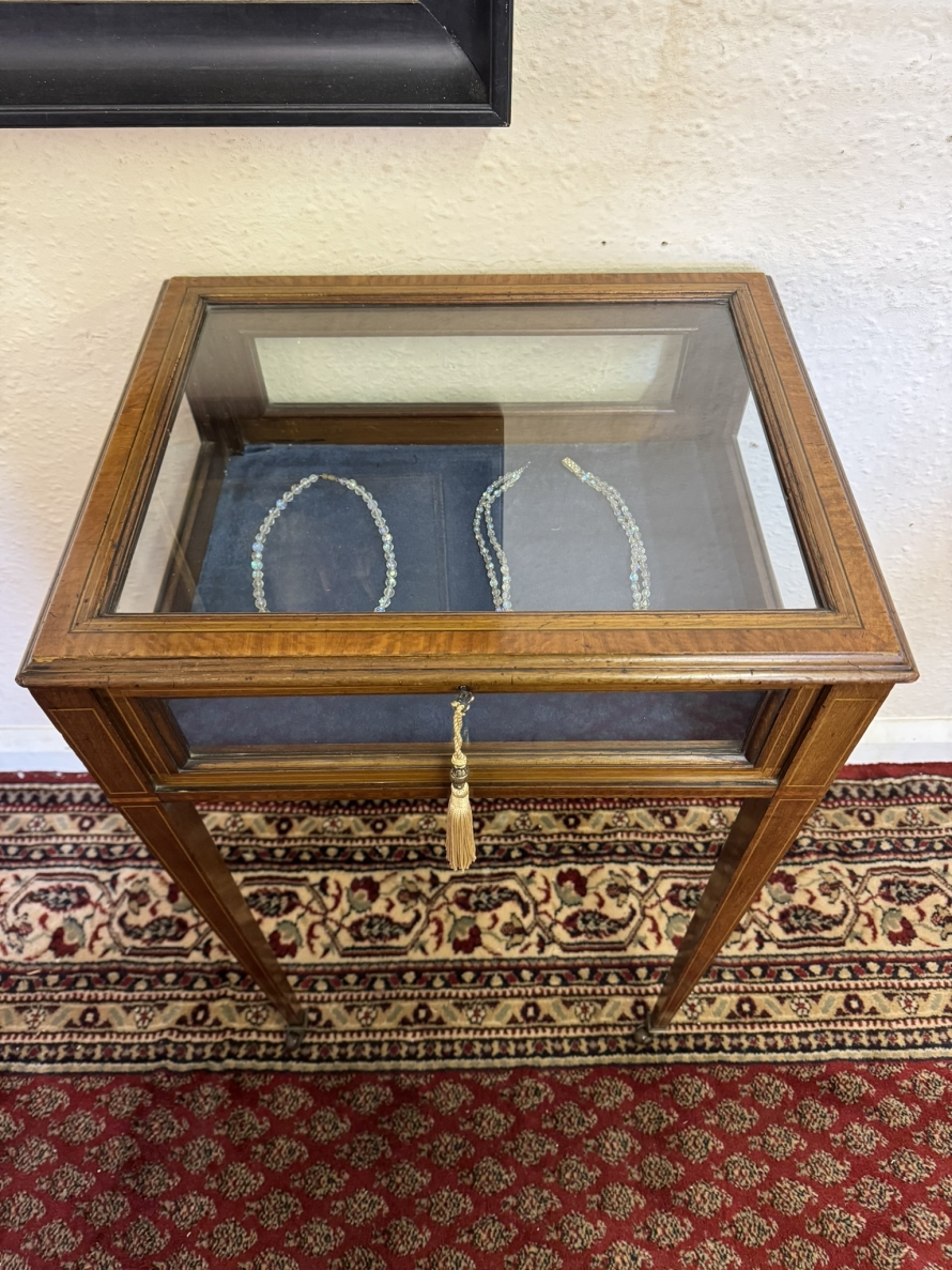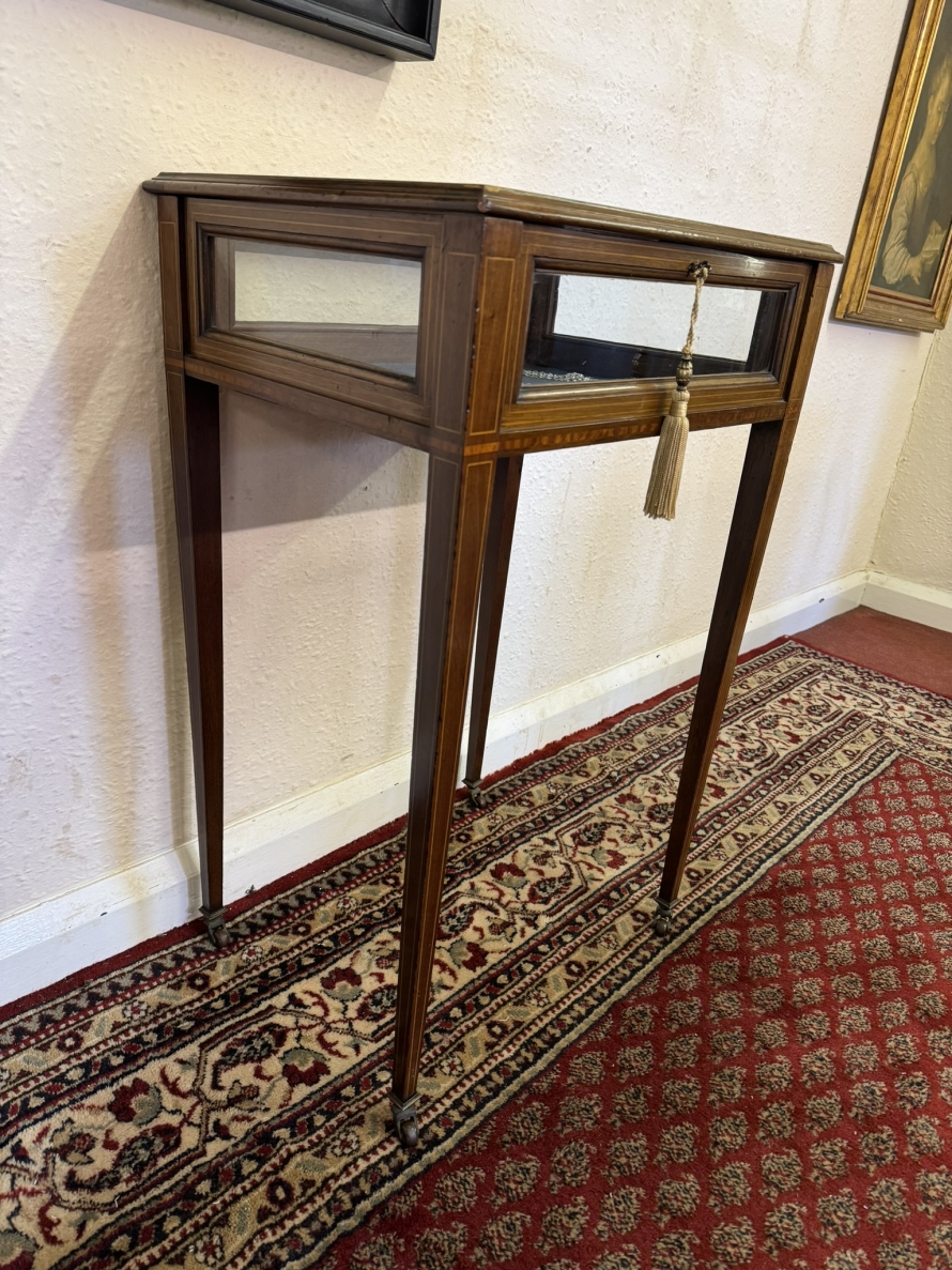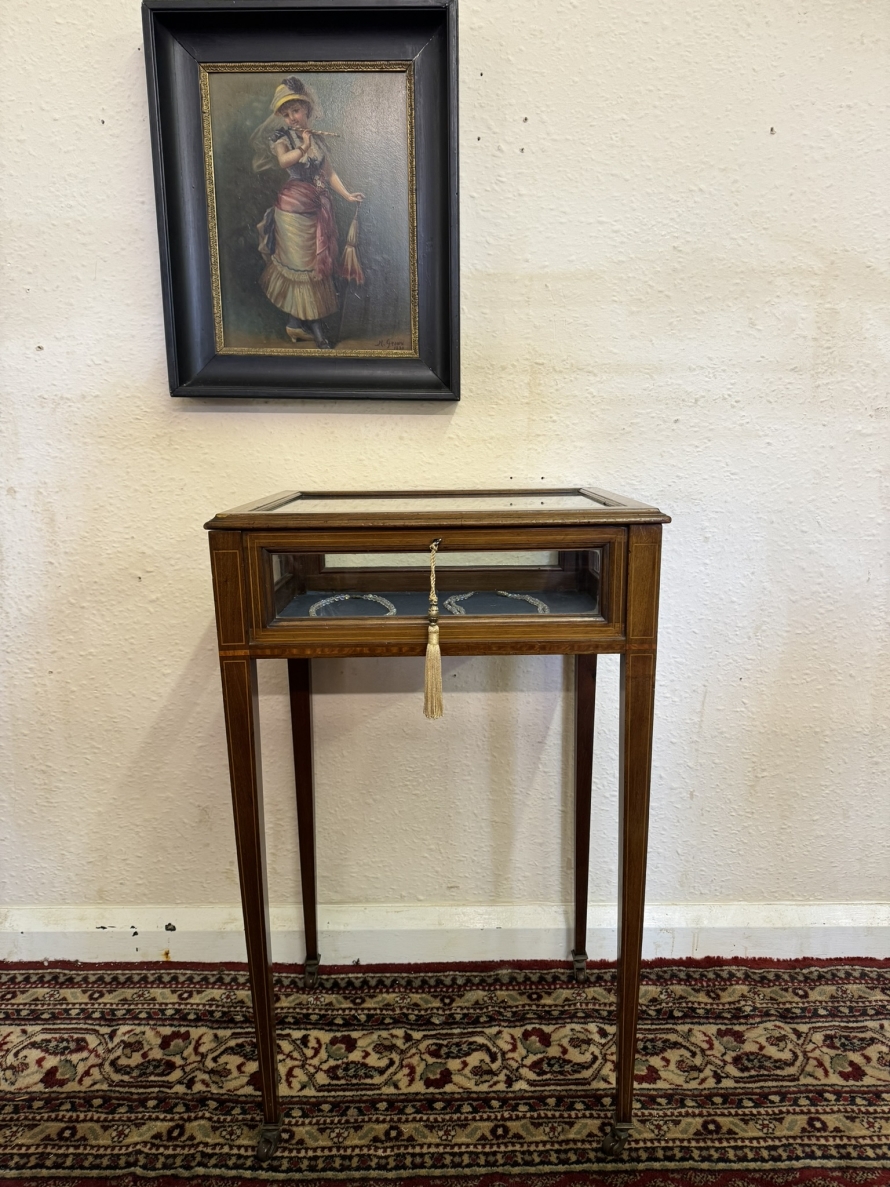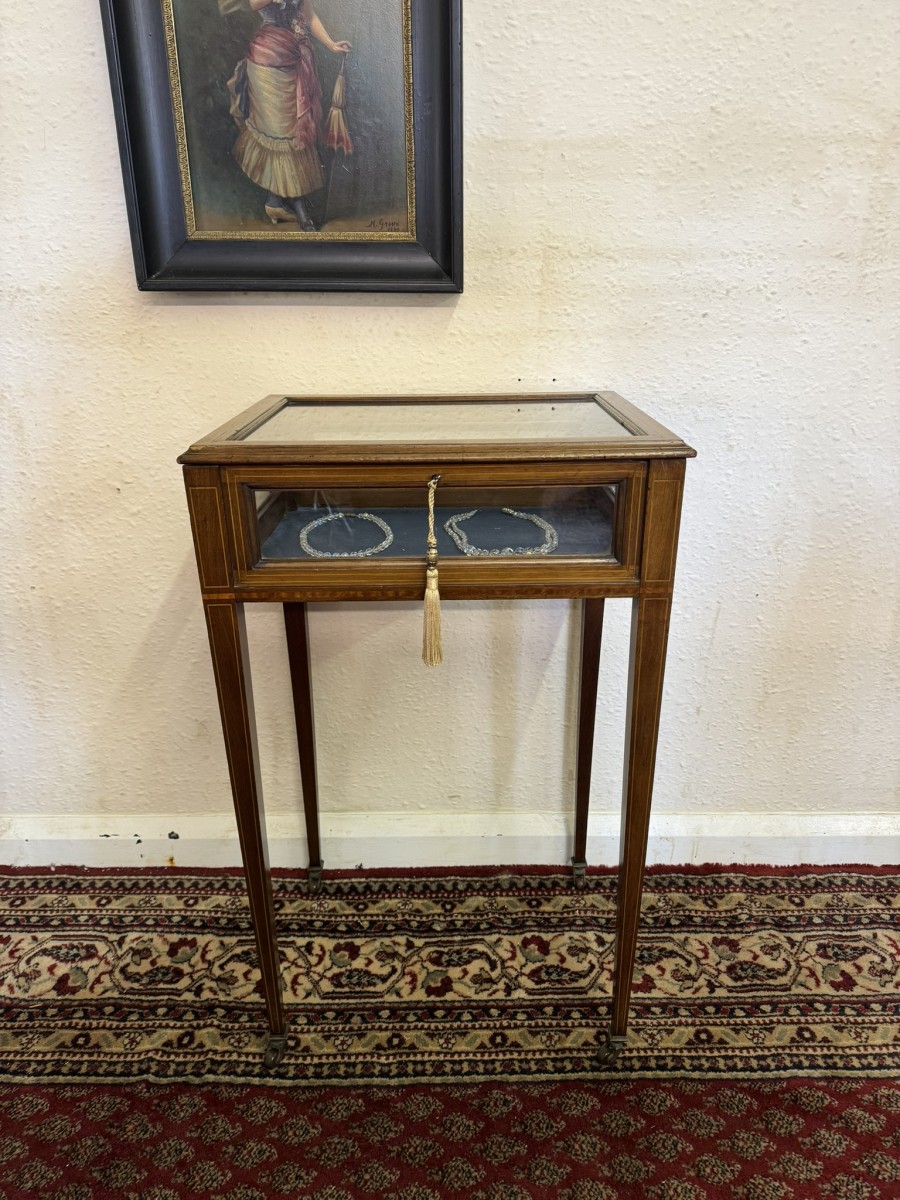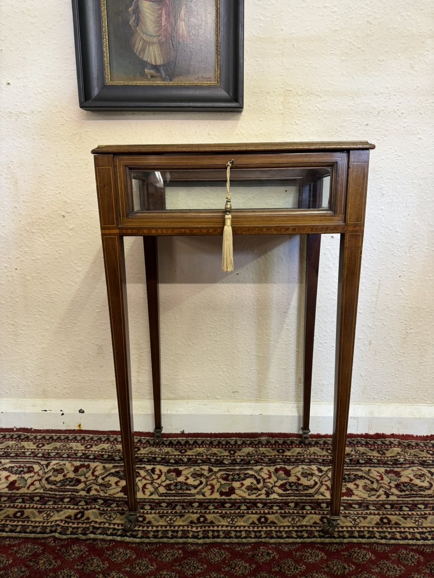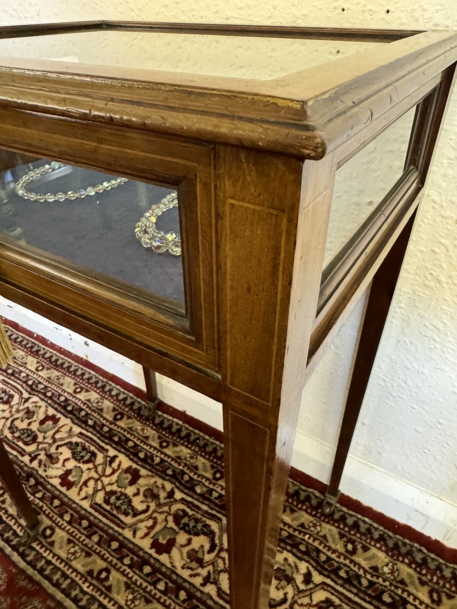 This antique bijouterie from the Edwardian period and dates circa 1910. The lockable glazed top lifts up. Glazed front back and sides for optimal display. Four inlaid tapered legs and standing on original brass casters.
