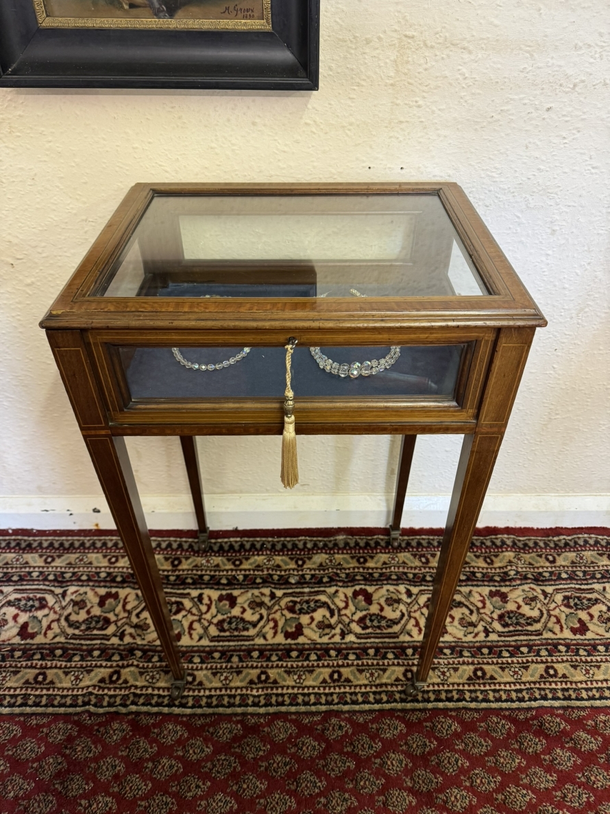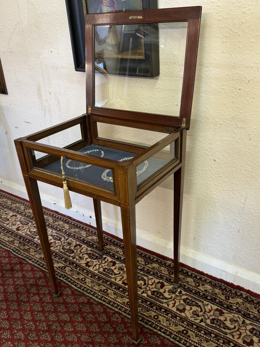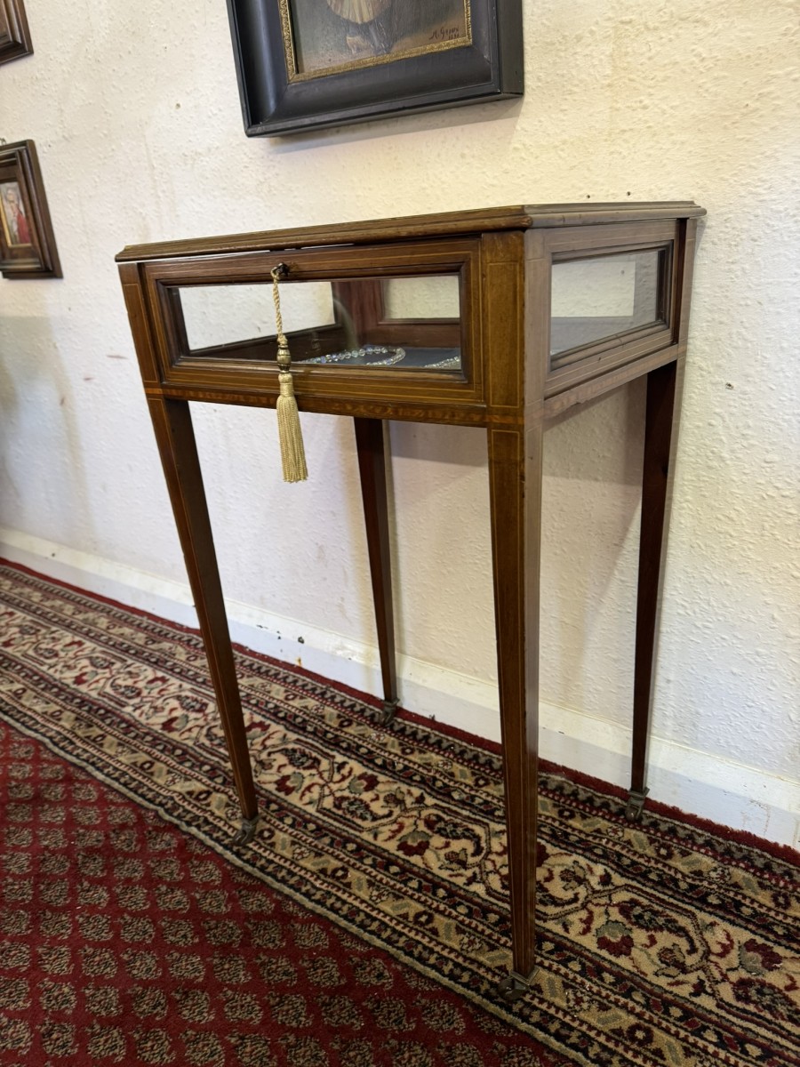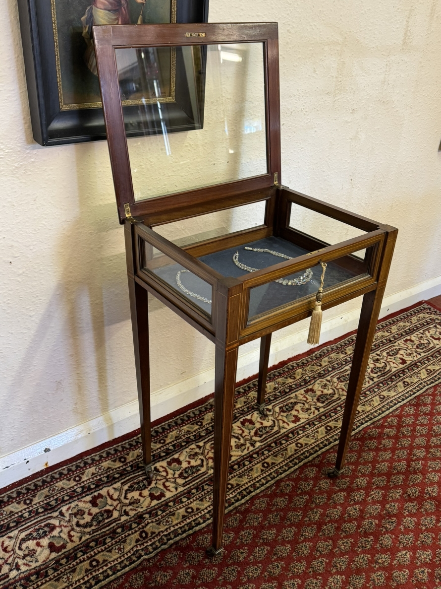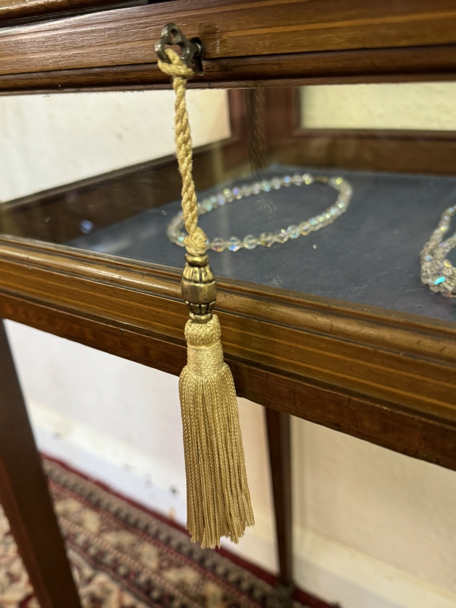 This antique bijouterie from the Edwardian period and dates circa 1910. The lockable glazed top lifts up. Glazed front back and sides for optimal display. Four inlaid tapered legs and standing on original brass casters.