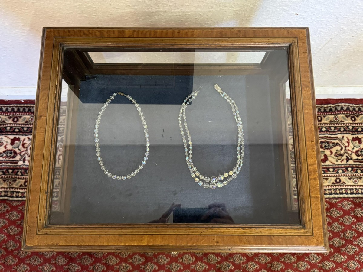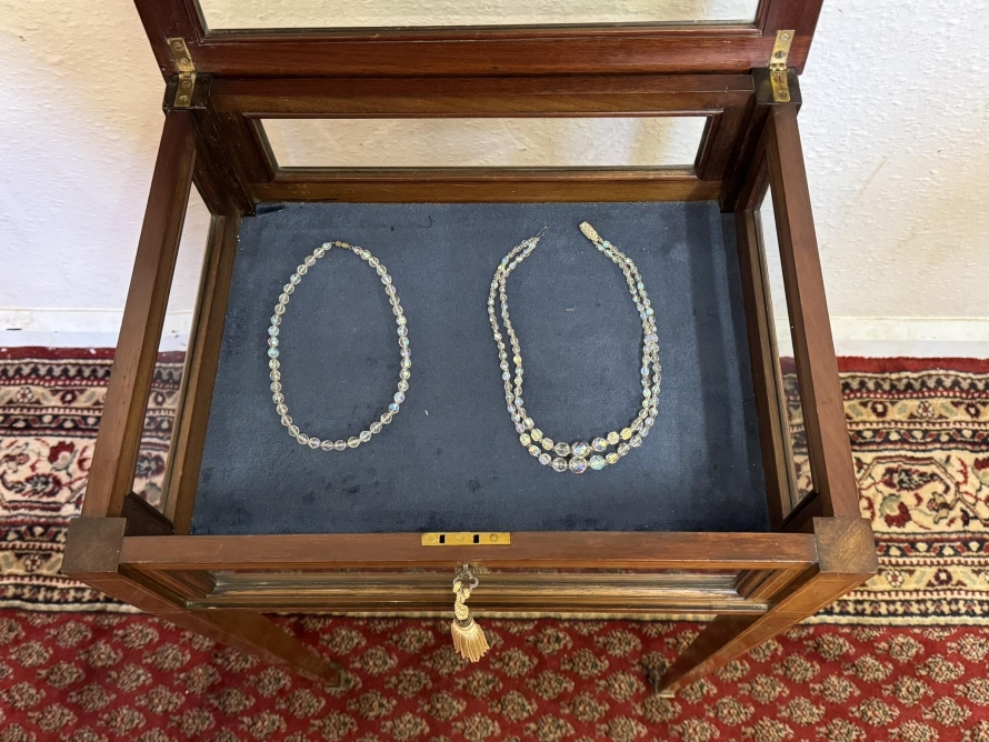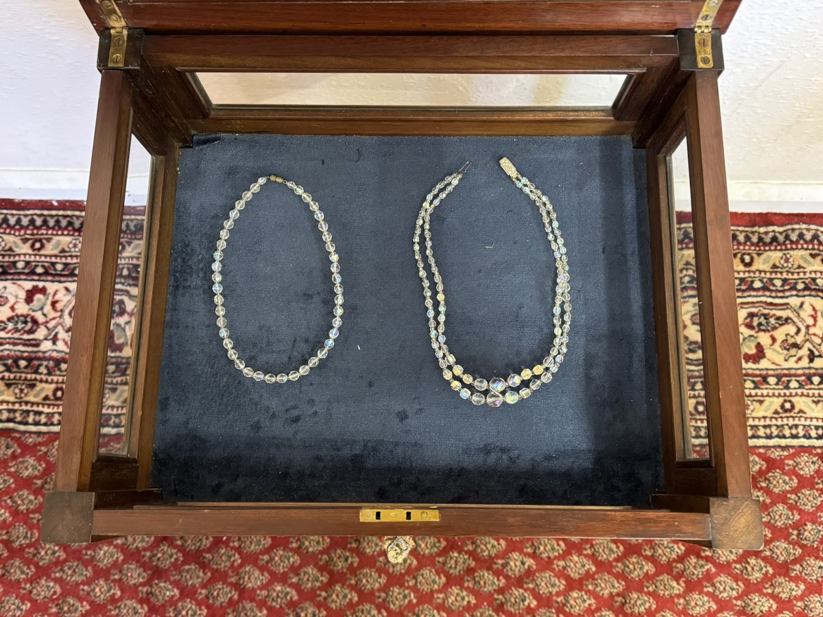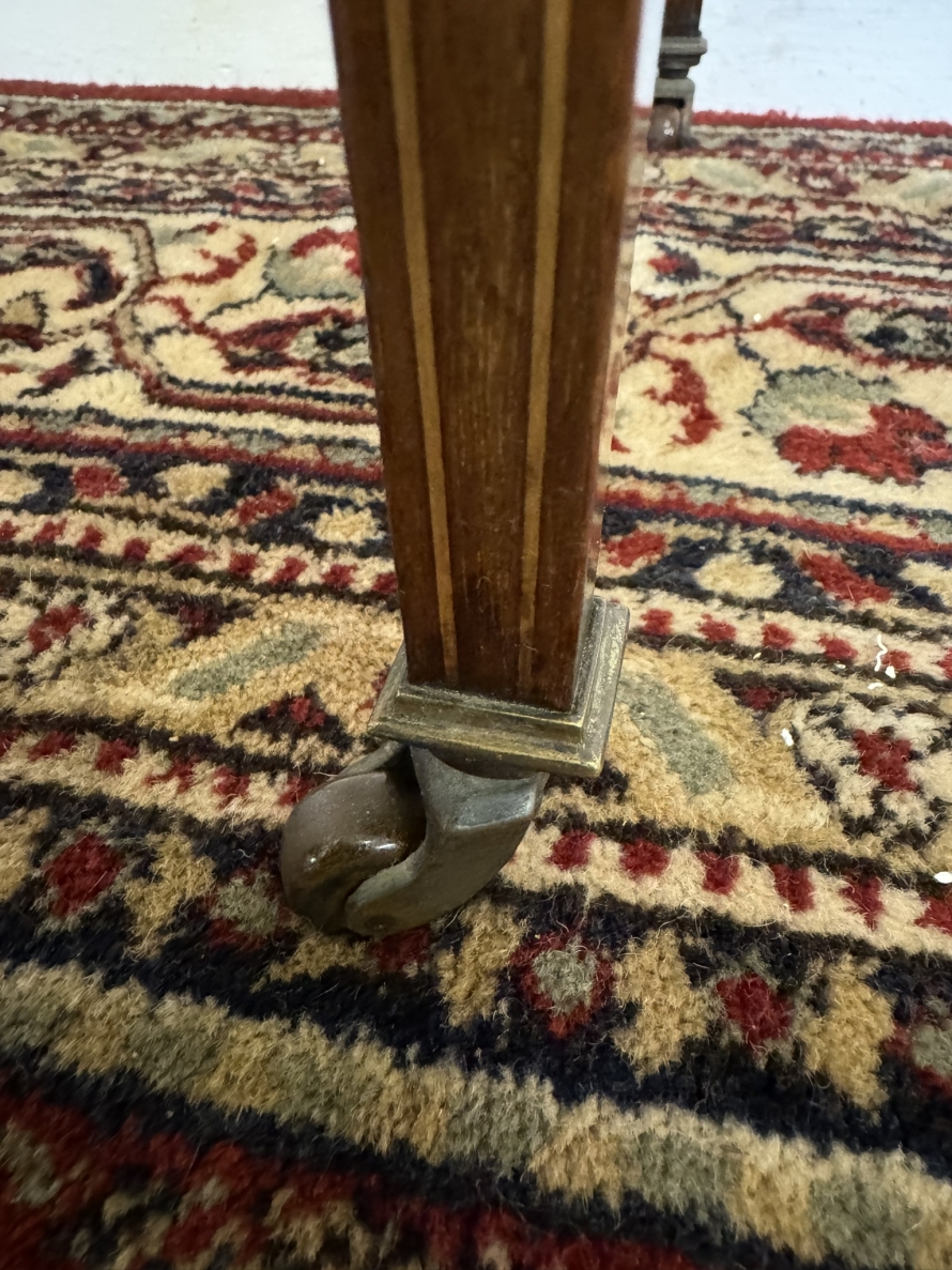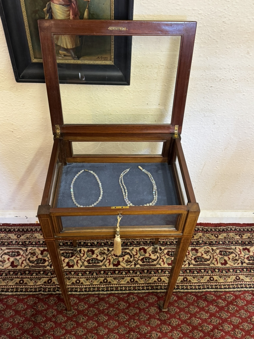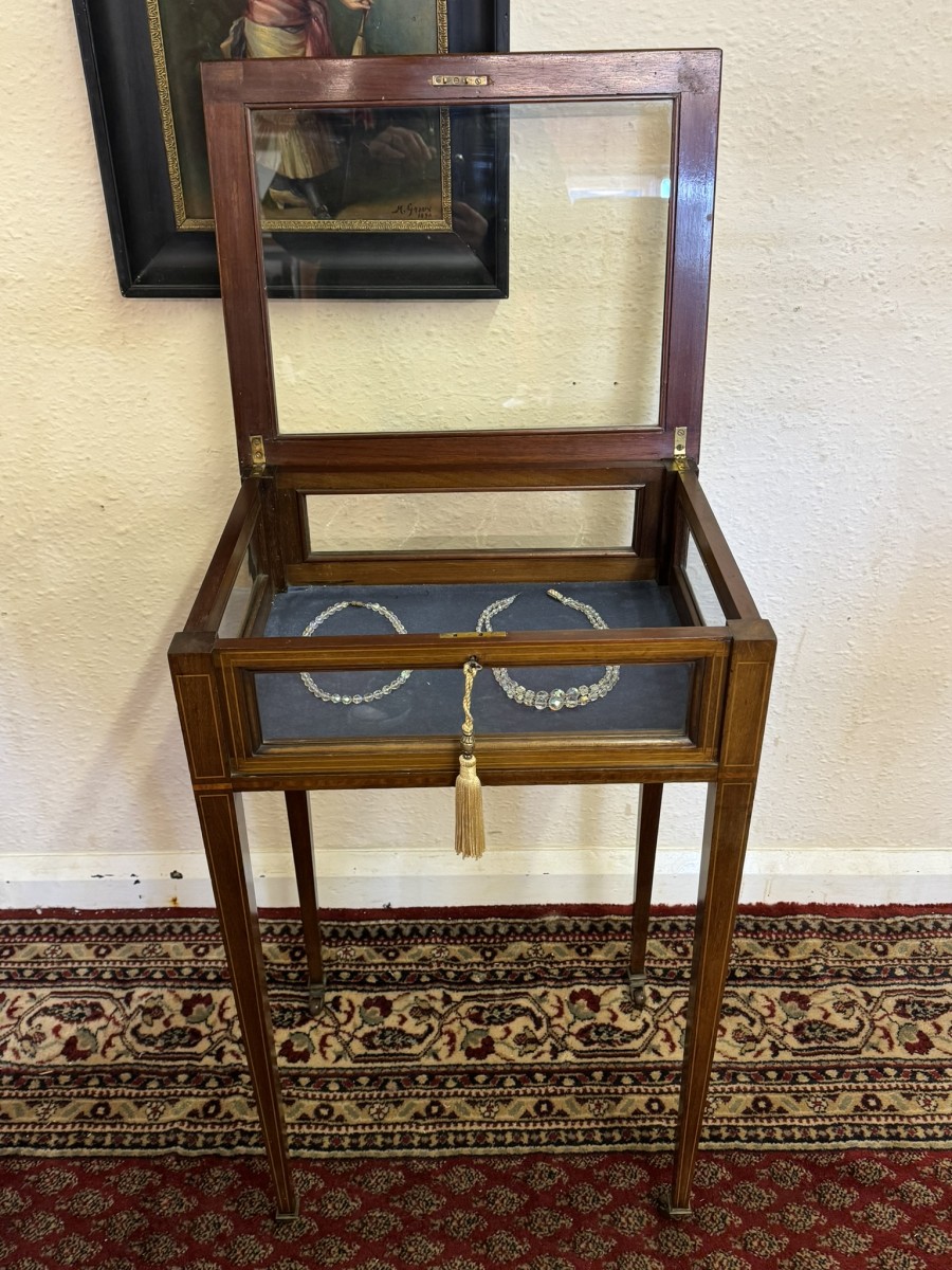 This antique bijouterie from the Edwardian period and dates circa 1910. The lockable glazed top lifts up. Glazed front back and sides for optimal display. Four inlaid tapered legs and standing on original brass casters.